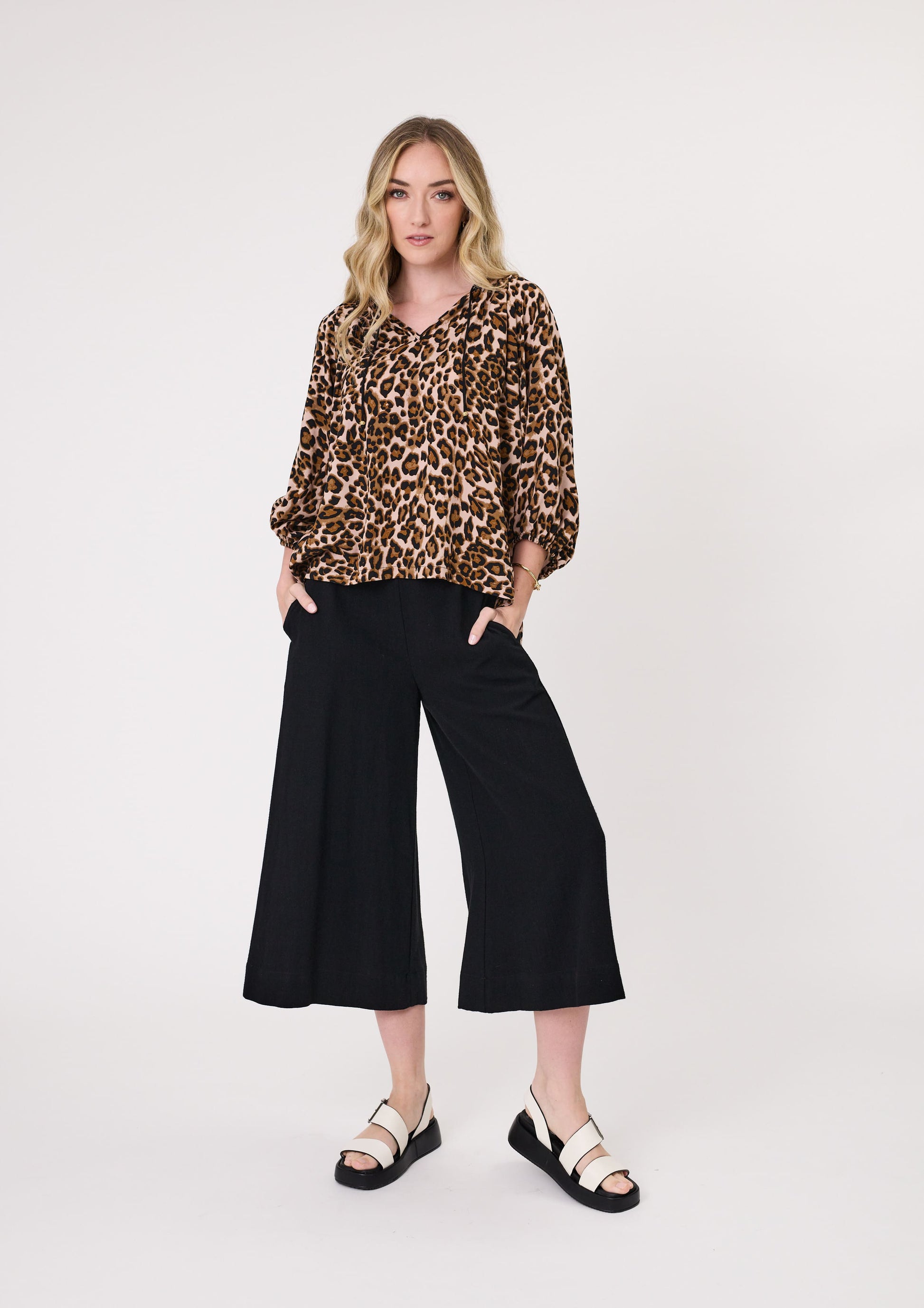 - Three-quarter sleeves with subtle cuffing for a soft, gathered look.