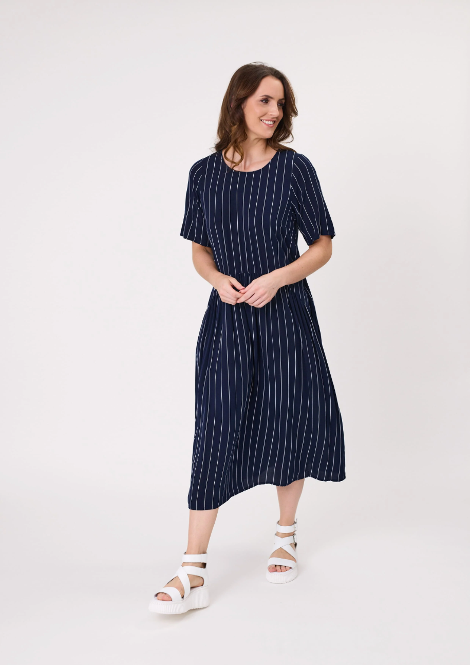 - Navy striped design in a soft viscose blend with a relaxed, loose fit.
