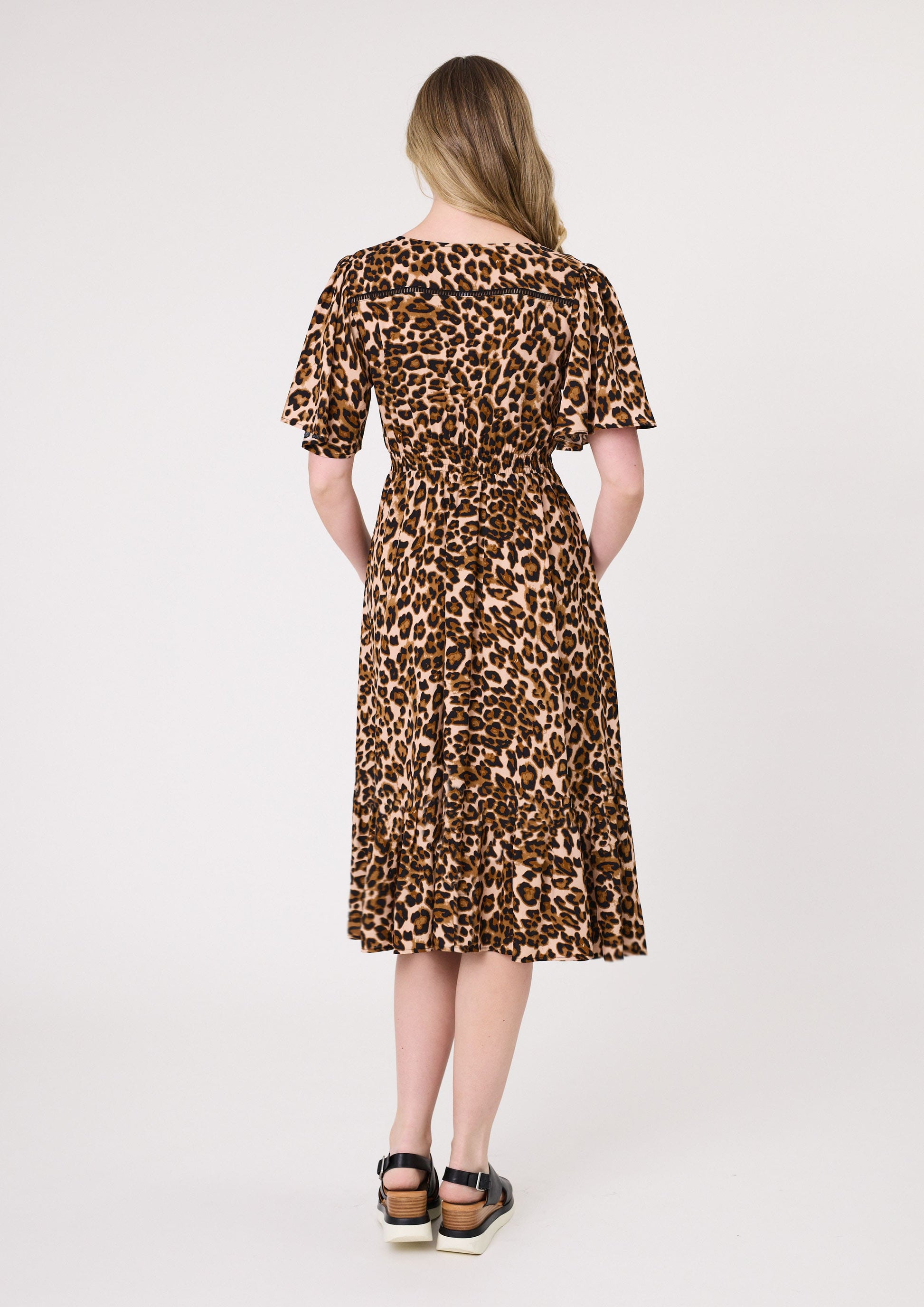 - All-over leopard print with a flattering V-neck and short sleeves.