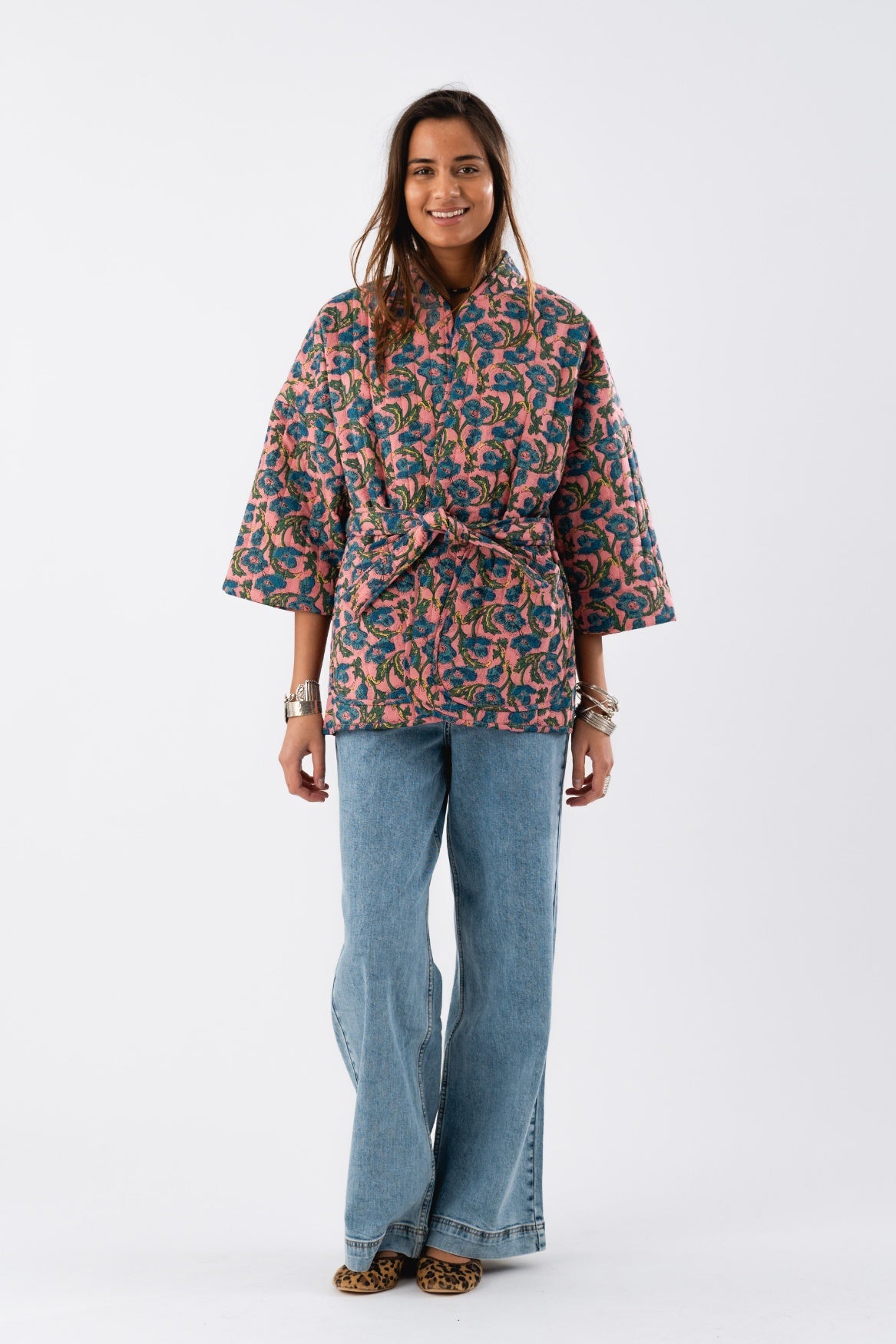 Our Lulu jacket is designed in a lightly padded, quilted quality in a floral print of blue, green and pink. The sleeves are long and wide in a typical japanese tradition style.
