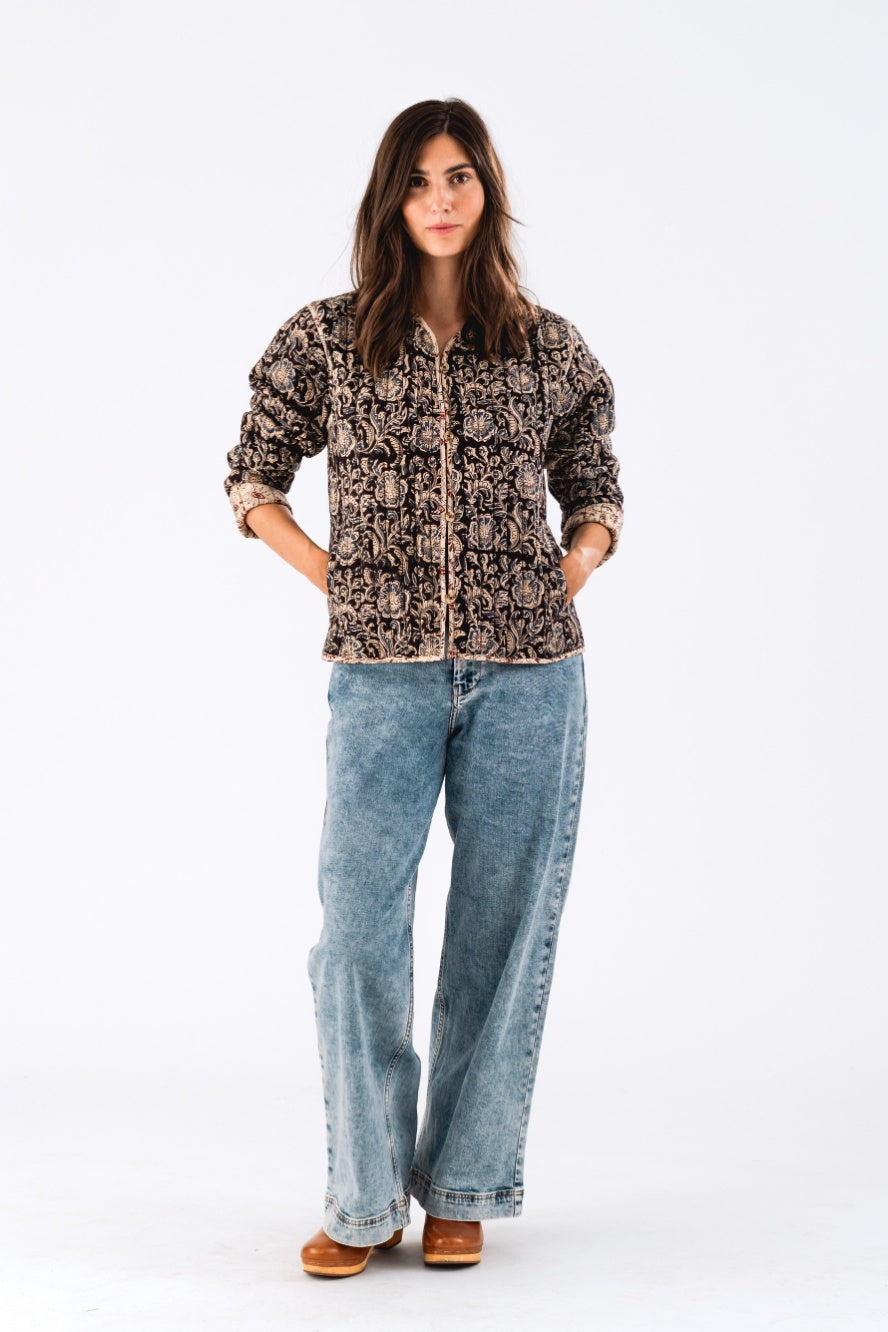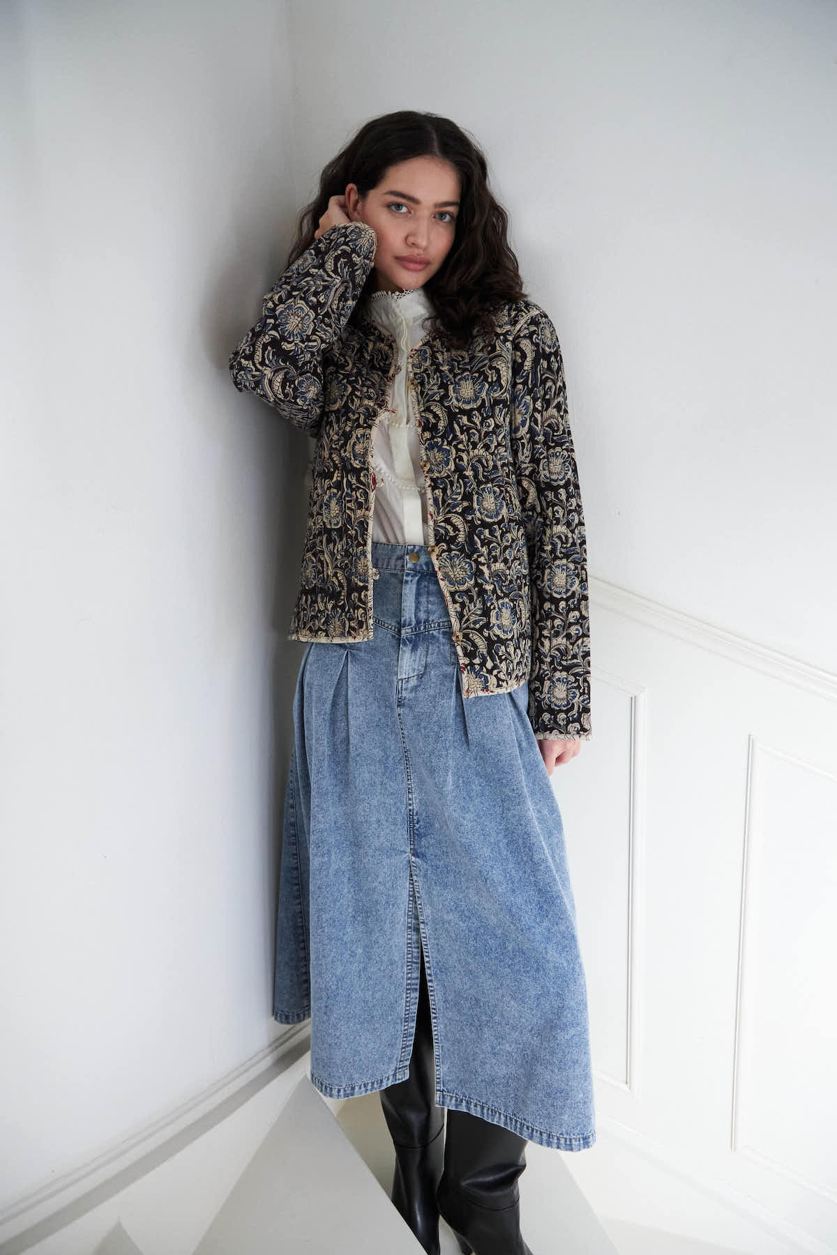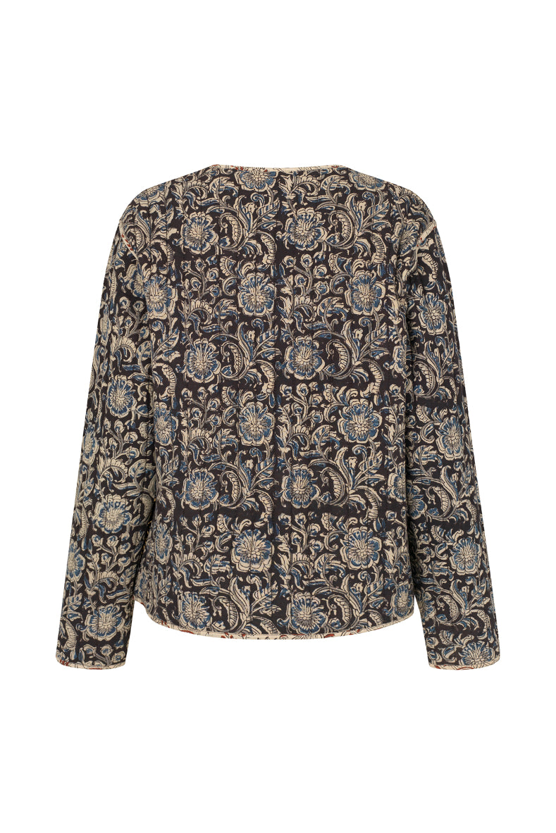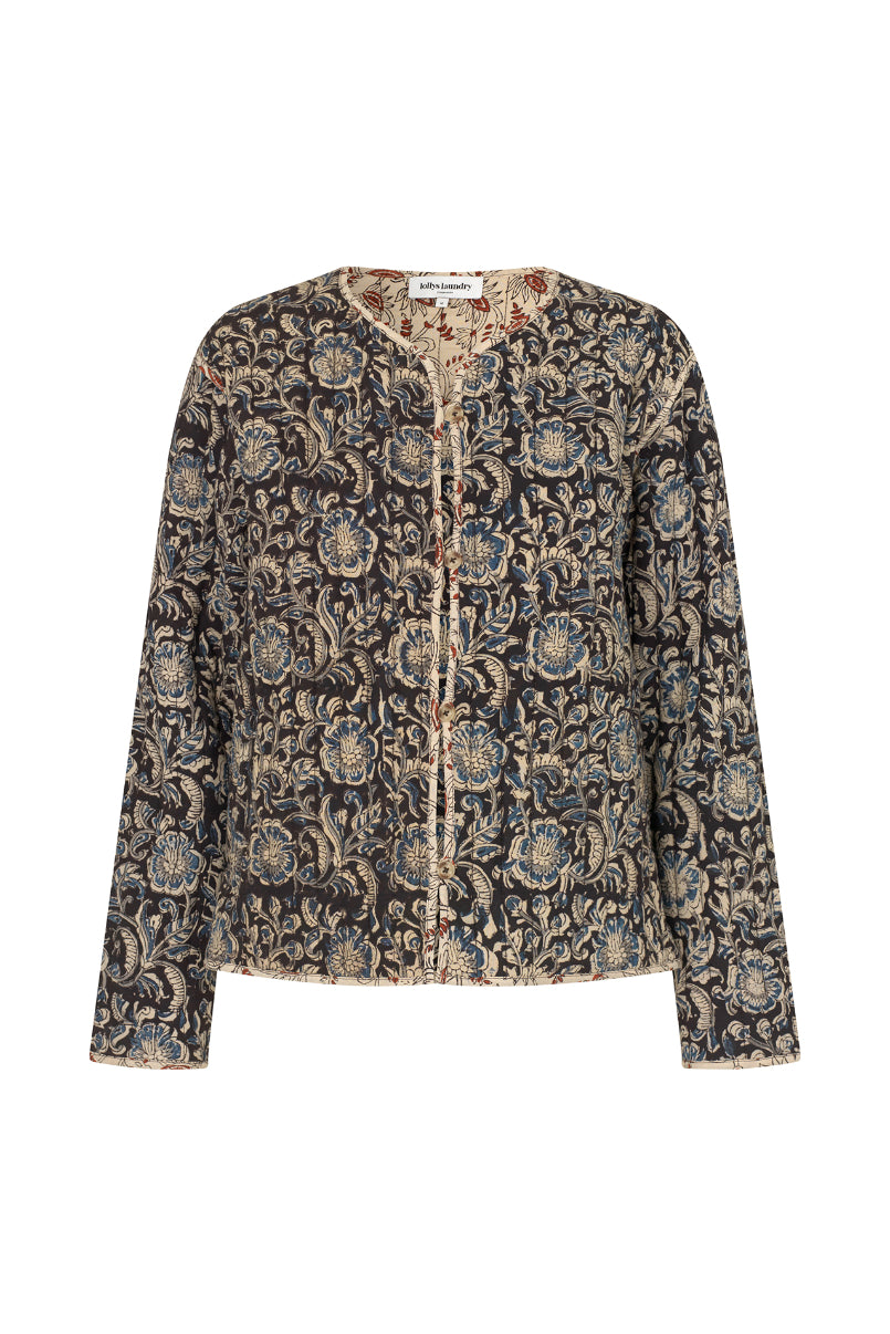 The Betty jacket is a perfect blend of classic design and modern comfort, infused with a touch of Boho charm. This beautiful jacket features an intricate floral print in shades of black, blue, and beige, with red-trimmed details that create a sophisticated and timeless look. It has long sleeves, a front button closure, and a round neckline. The quilted quality adds an extra layer of warmth, making the jacket ideal for transitional periods or cool evenings. The subtle contrast stitching highlights the structure and design of the jacket in a discreet way. The Betty jacket can be styled in many ways - wear it over a simple top and jeans for a casual everyday look, or pair it with a dress for a more elegant appearance. The fit is regular.