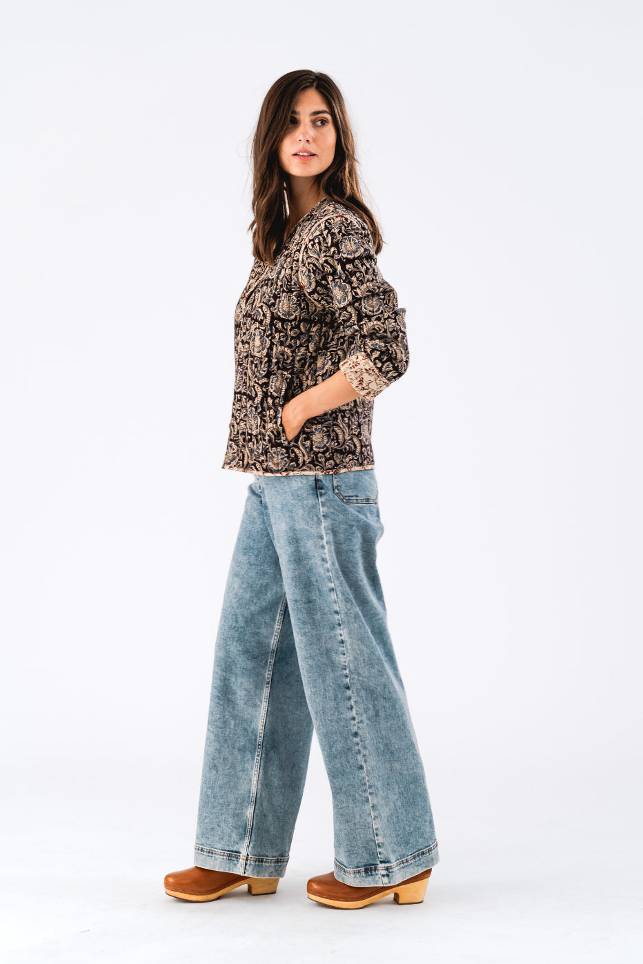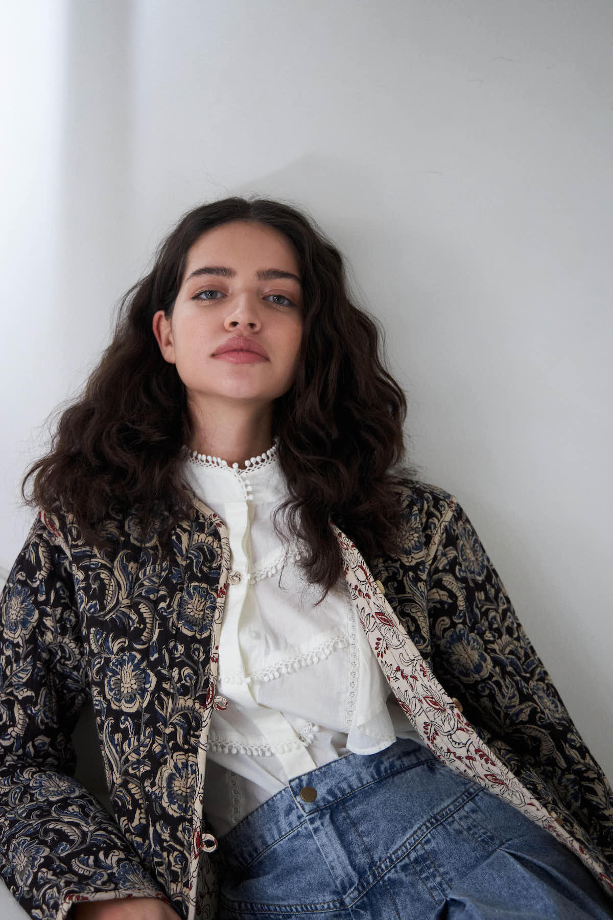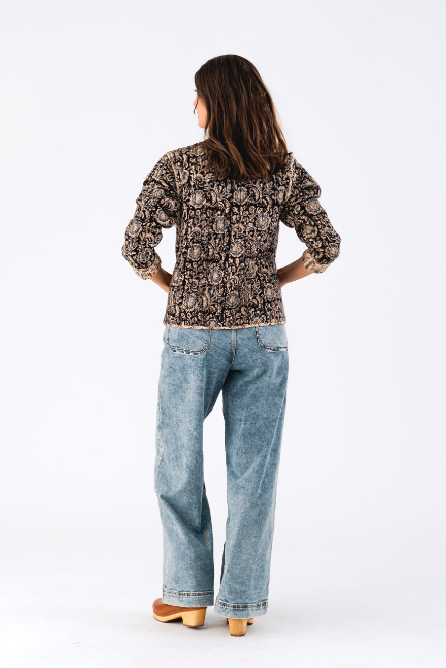 The Betty jacket is a perfect blend of classic design and modern comfort, infused with a touch of Boho charm. This beautiful jacket features an intricate floral print in shades of black, blue, and beige, with red-trimmed details that create a sophisticated and timeless look. It has long sleeves, a front button closure, and a round neckline. The quilted quality adds an extra layer of warmth, making the jacket ideal for transitional periods or cool evenings. The subtle contrast stitching highlights the structure and design of the jacket in a discreet way. The Betty jacket can be styled in many ways - wear it over a simple top and jeans for a casual everyday look, or pair it with a dress for a more elegant appearance. The fit is regular.