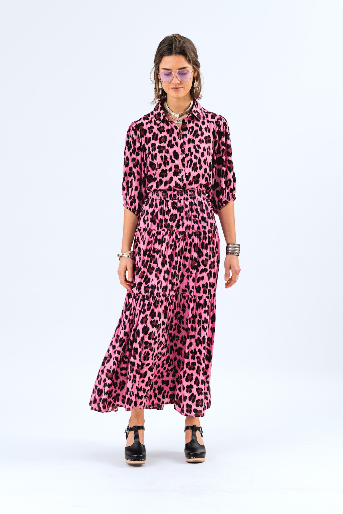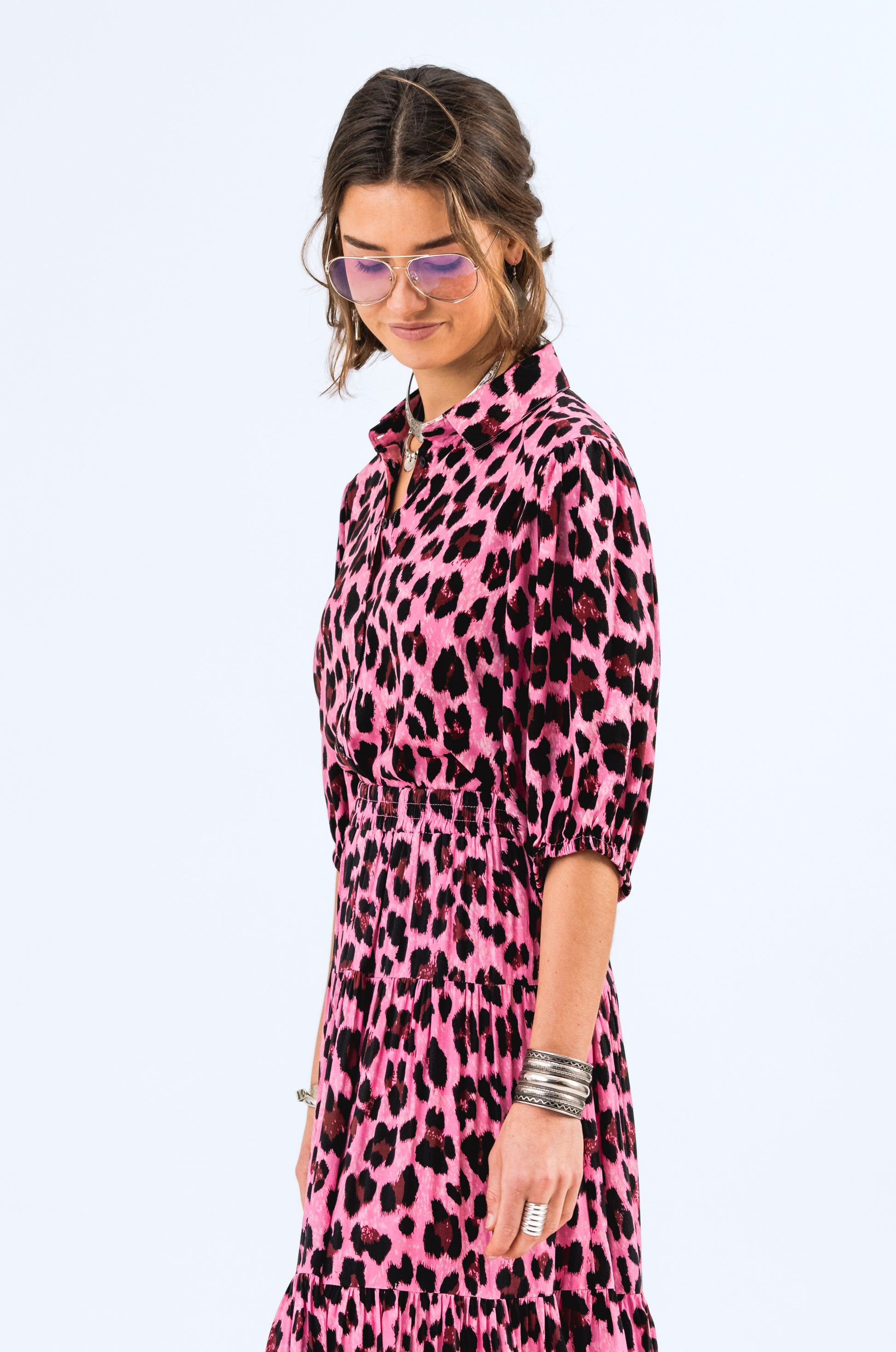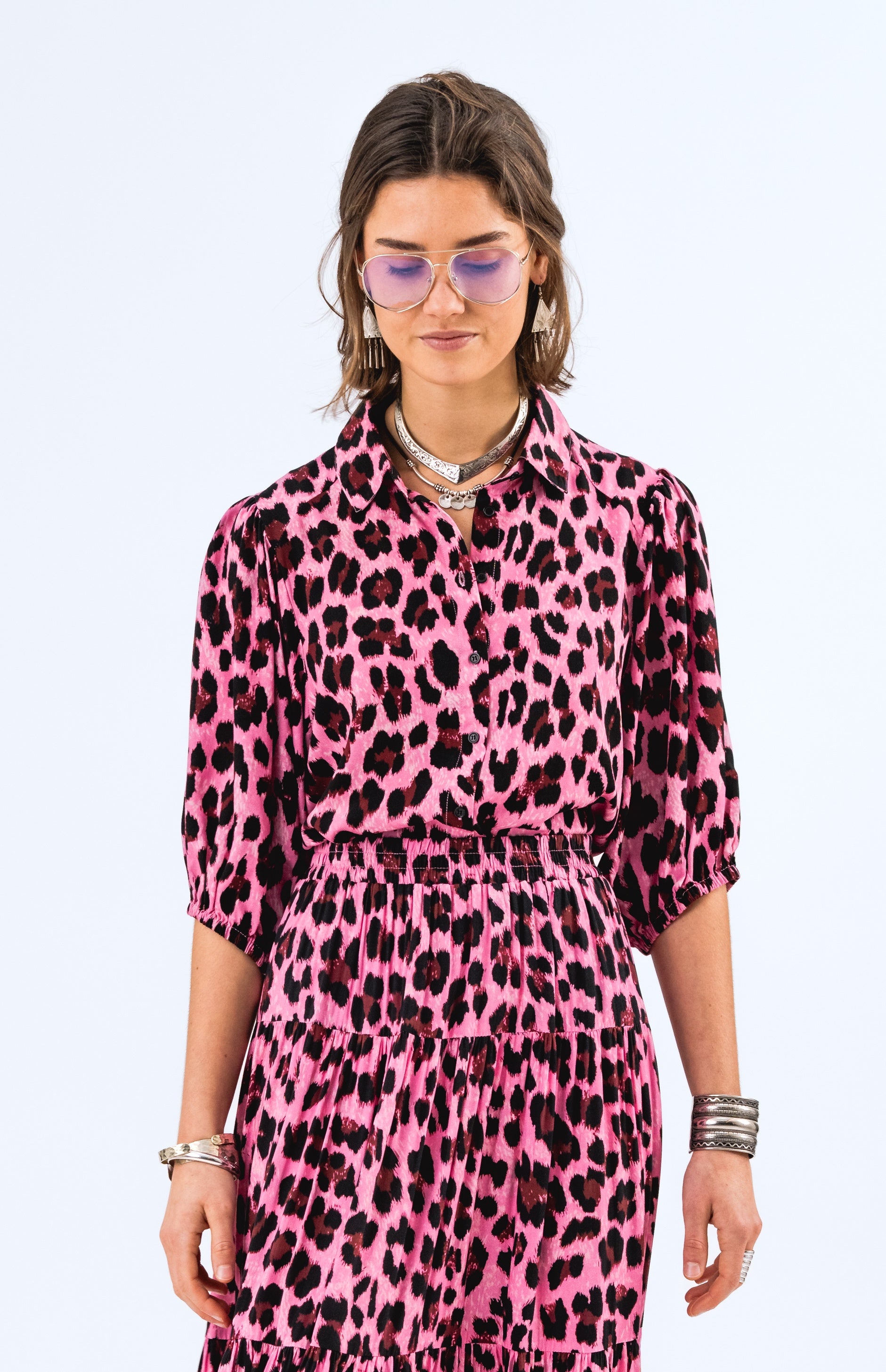 The PratoLL shirt is a fine combination of timeless elegance and comfort. This version features an eye-catching leopard print in a beautiful blend of pink, red, and black. The shirt has a classic collar, adding a sophisticated touch to the design, with black buttons and 3/4 length sleeves finished with elastic cuffs. Whether you wear it to work, a special occasion, or just as a chic everyday shirt, the PratoLL shirt will make you look great and feel comfortable all day long. Style it with our SunsetLL skirt in the same material for a complete dress look.