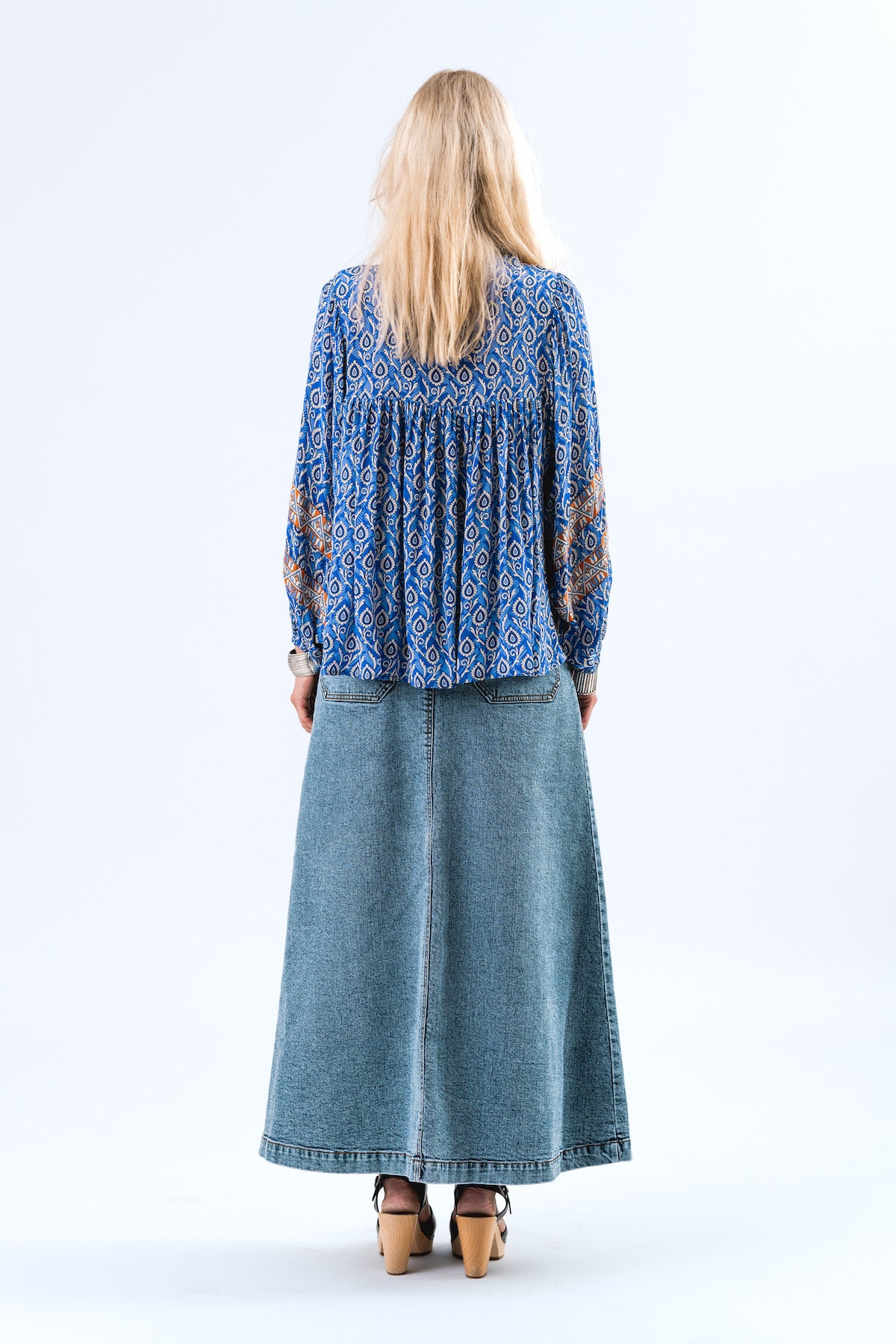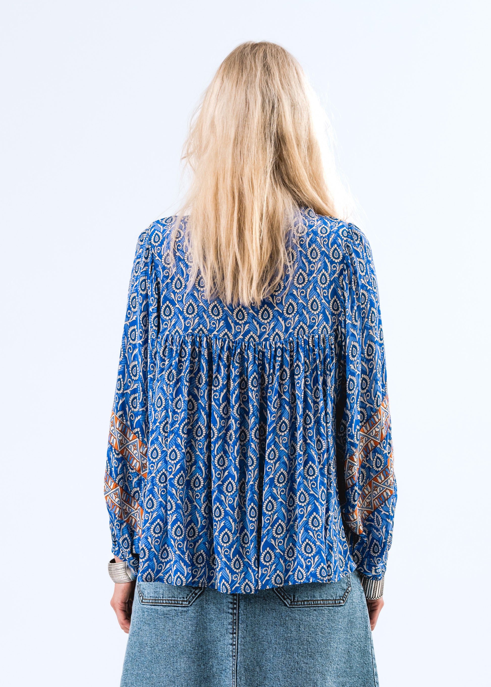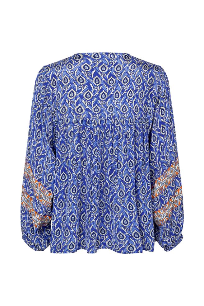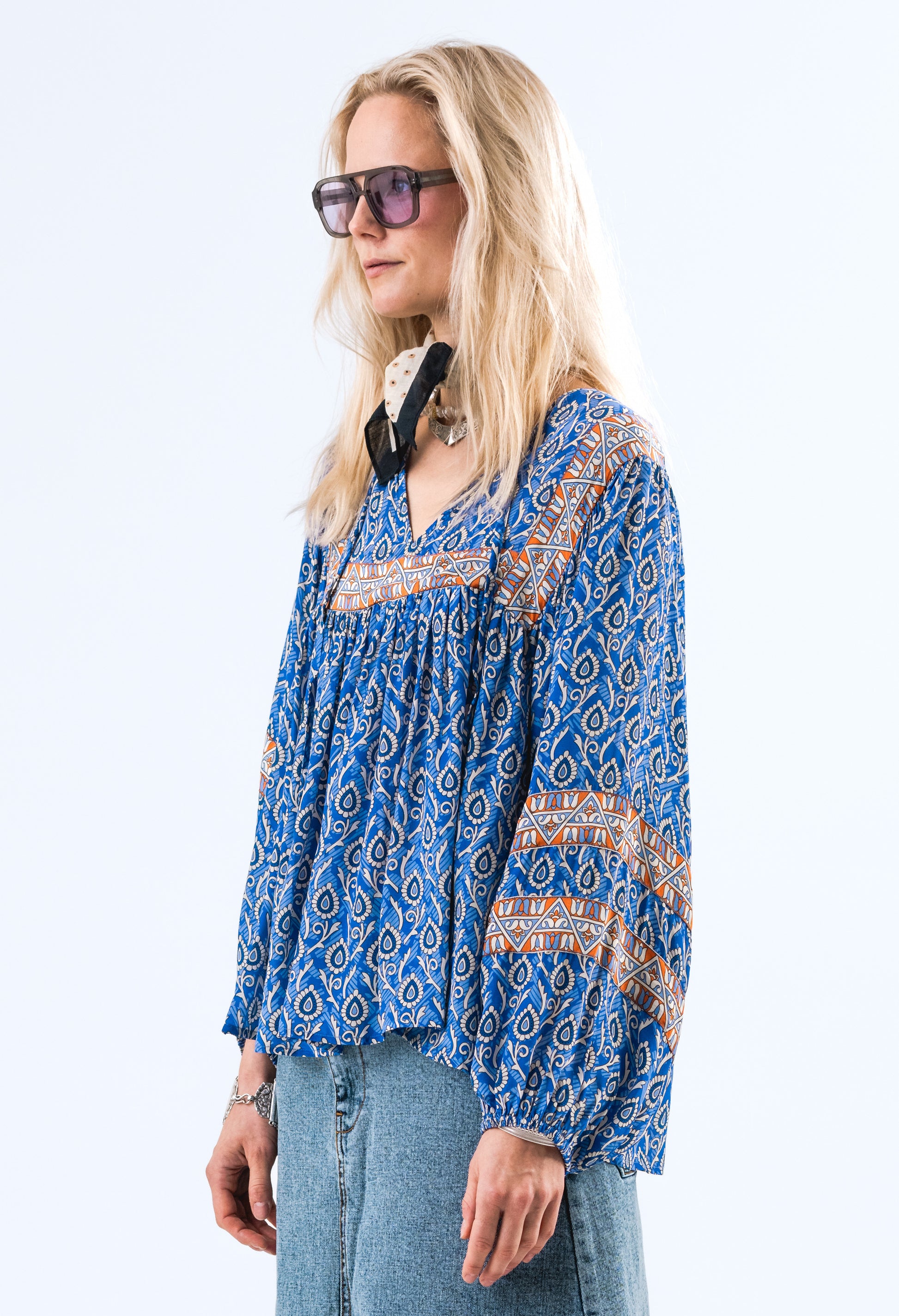 The TeelLL shirt is a beautiful and detailed blouse with a vibrant pattern in shades of blue, white, and orange, made from 100% viscose. It has a loose, airy fit, making it comfortable to wear all day long. The shirt is designed with voluminous long sleeves that end in elastic cuffs, and it features fine details on the chest and along the sleeves, adding a unique and ethnically inspired touch to the design. The round neckline has a small slit with a tie, allowing you to adjust the opening as desired. The TeelLL shirt can easily be styled with jeans or a skirt for a relaxed yet sophisticated everyday look.