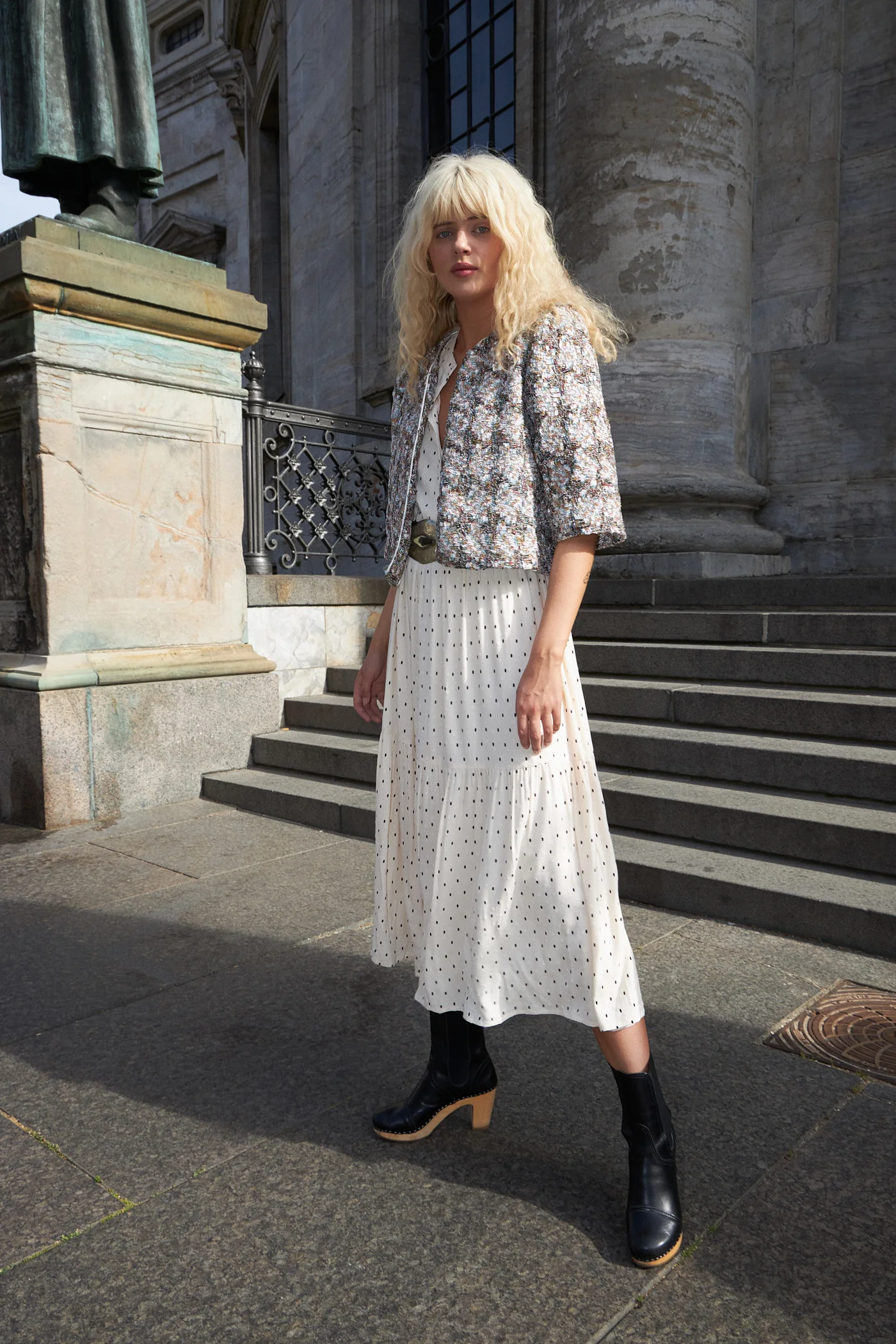 Trine Jacket is the perfect addition to your wardrobe, elevating your look to a new level, whether it's for a festive occasion or a more casual everyday outfit. The short jacket features beautiful 3/4 sleeves and a classic round neckline, giving it a timeless appearance. The jacket is versatile and can be easily styled for any occasion. It closes with 3 simple clasps at the top, adding a touch of elegance to the jacket and allowing you to wear it open or closed as desired. No matter how you choose to style it, Trine Jacket will be a reliable and stylish companion, adding a touch of sophistication to your attire.