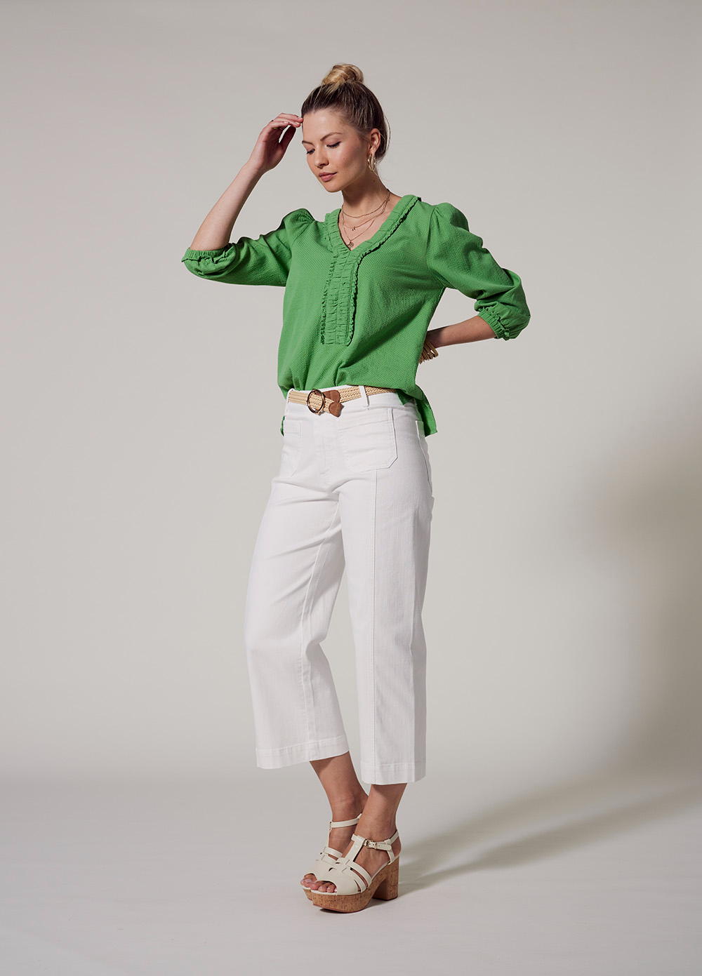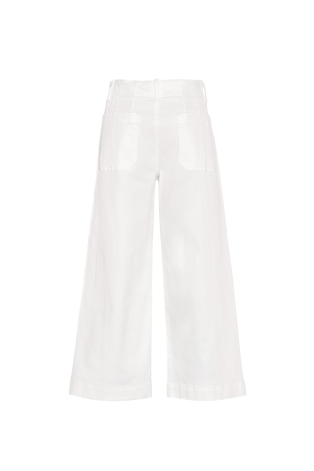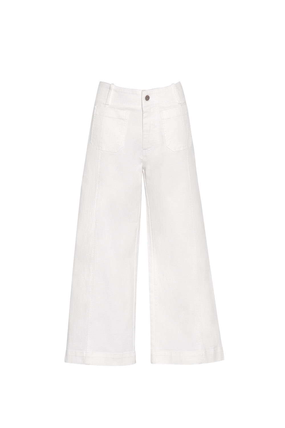 Wide-leg cropped pant in a stretch-cotton with front and back patch pockets, and copper hardware.