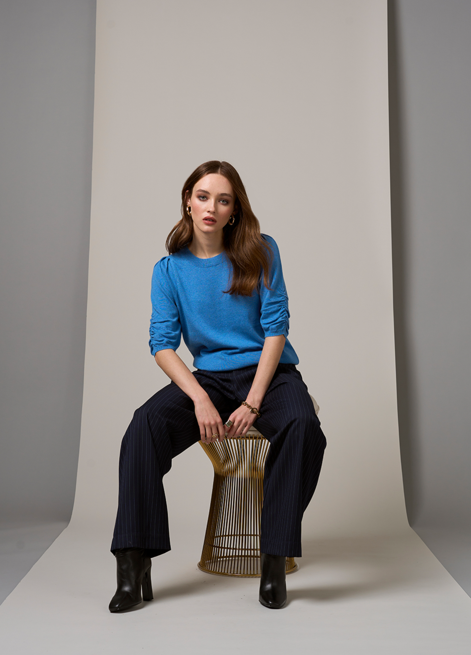 Super flattering wide-leg pant, with front pockets and forward side seams, with an elasticated back waist, zip fly, and flap pockets on the back.