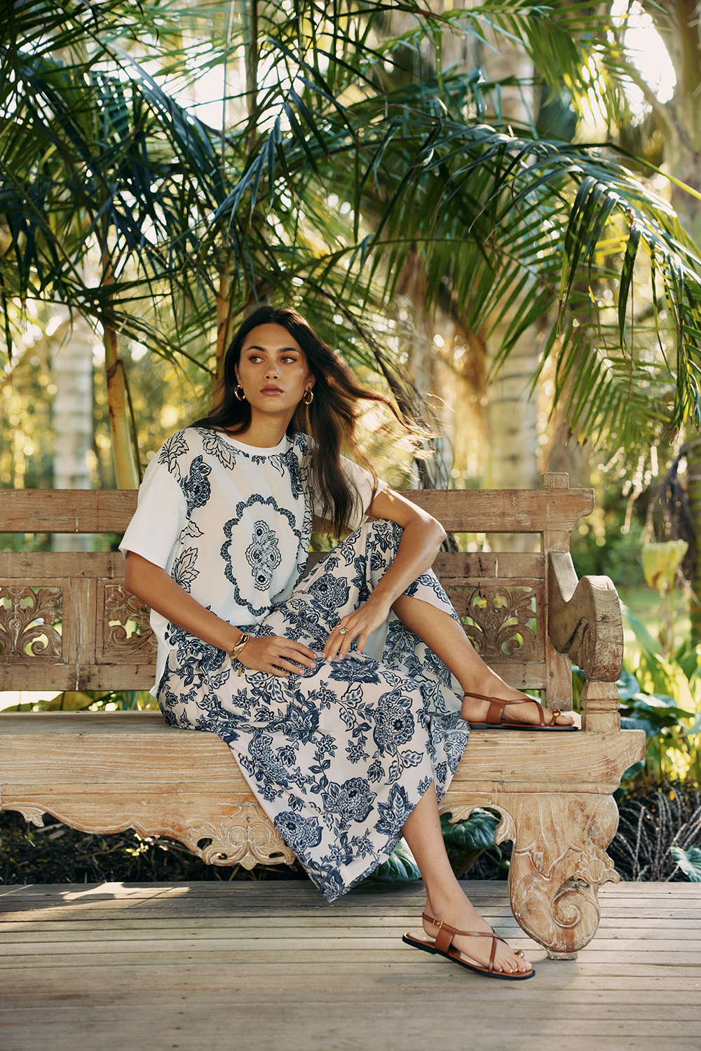Easy fitting tee in a cotton jersey and a light silk blend front panel, with a custom front panel print to elevate the style.
