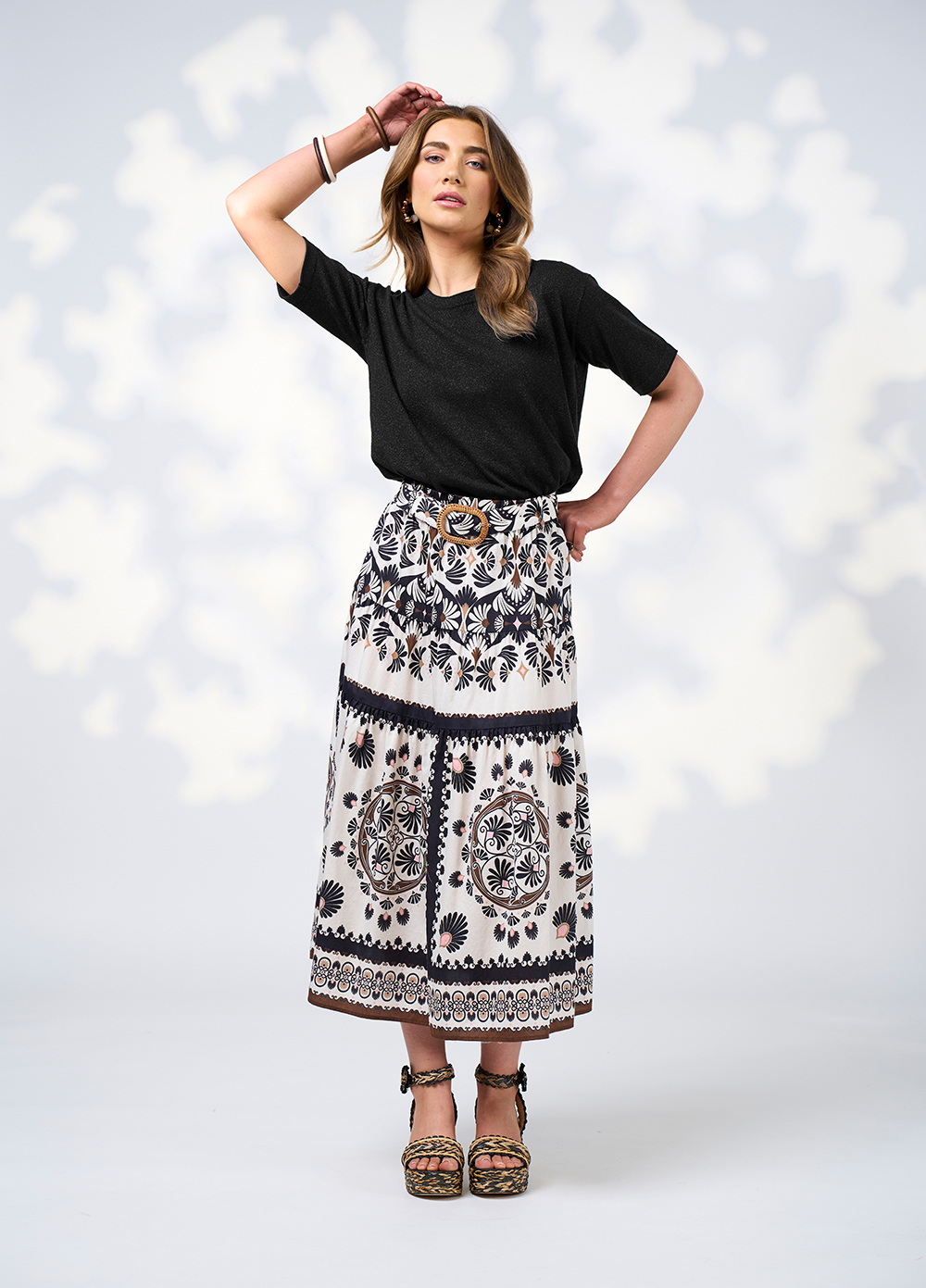 Floaty, pull-on tiered skirt with an elasticated waistband. Featuring a self belt with a rattan buckle. Fully lined.
