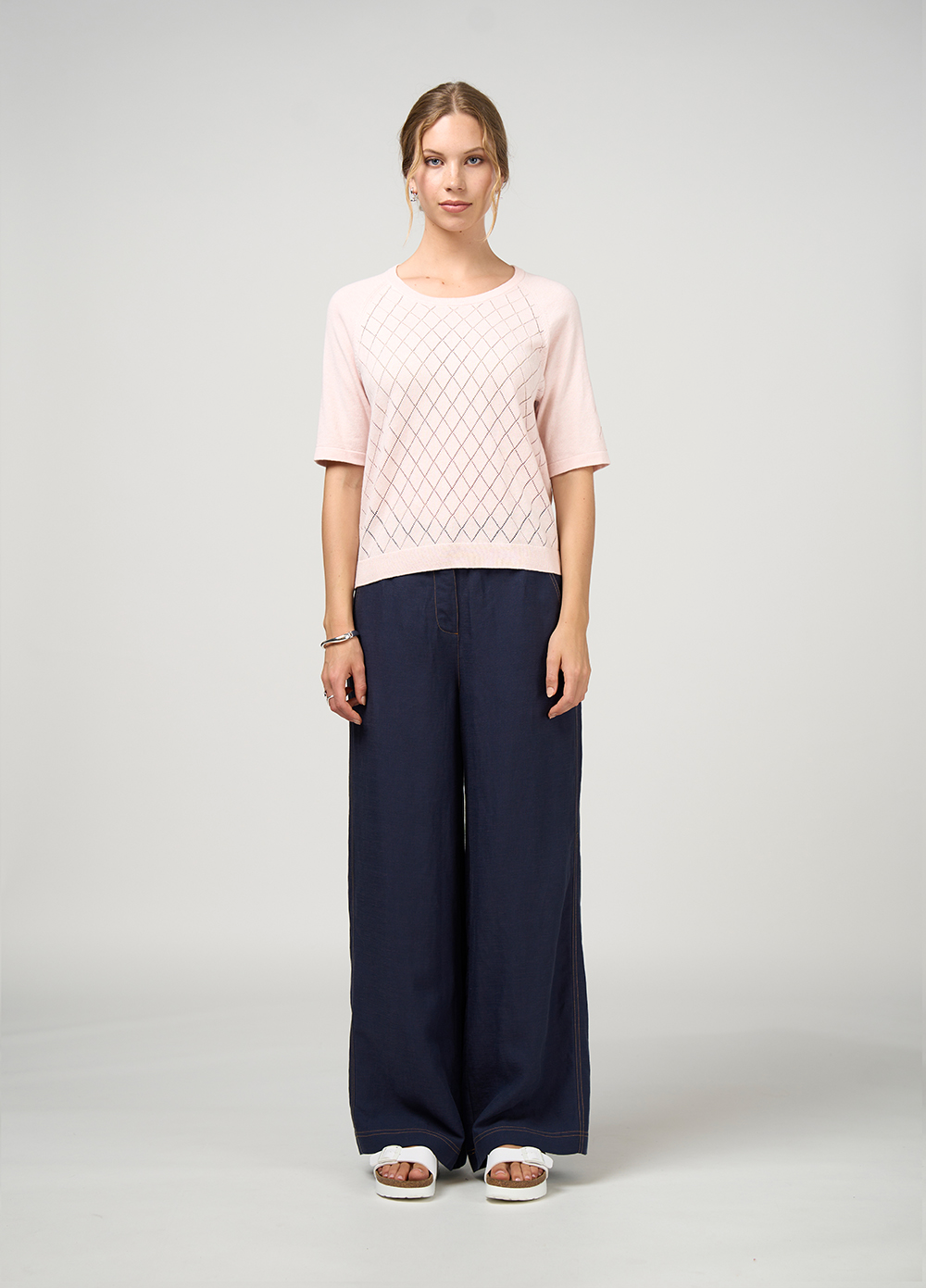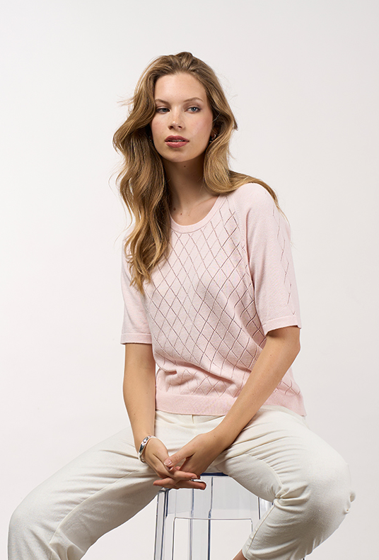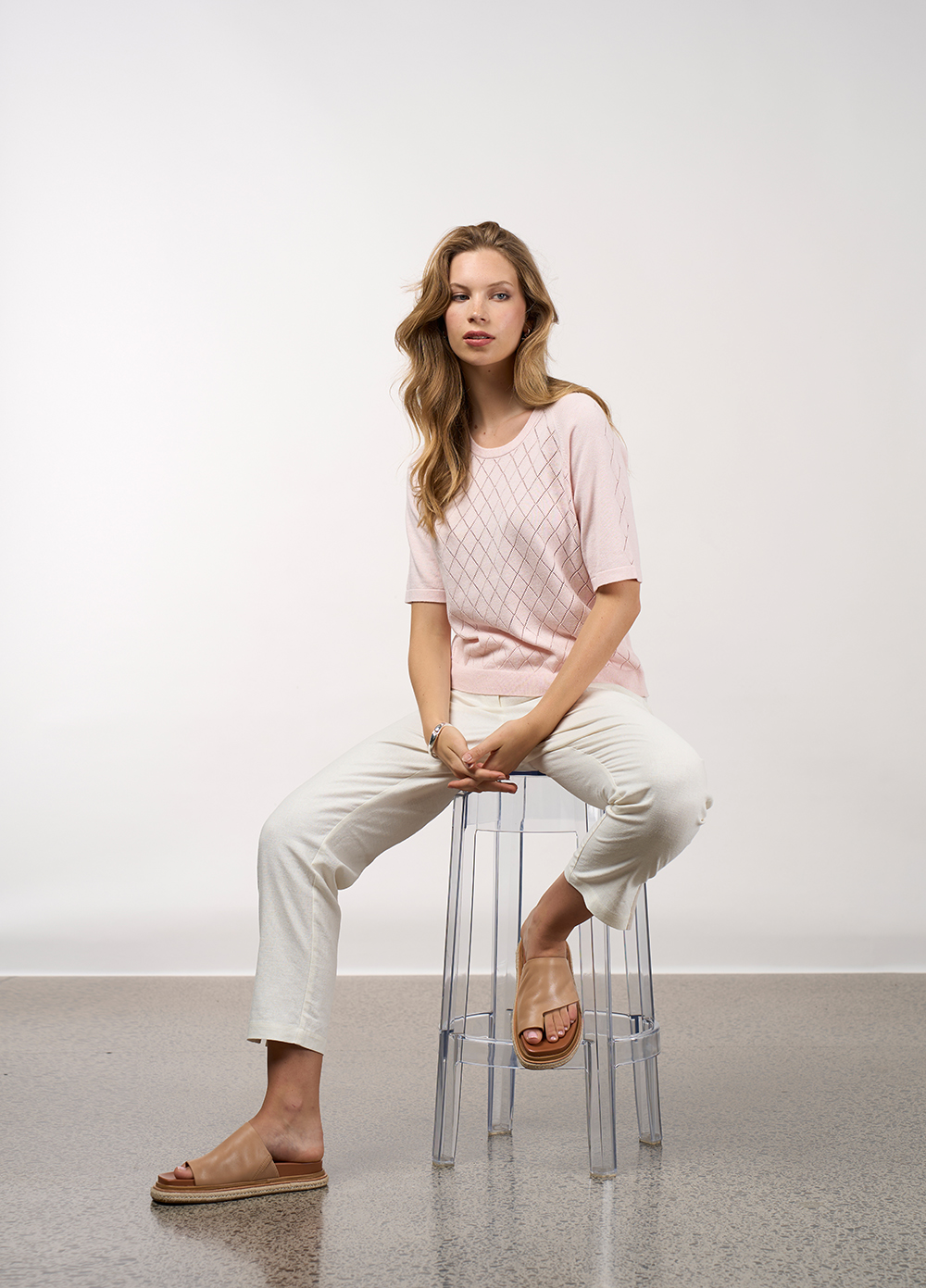 Short sleeve knitted tee, in a luxe cotton cashmere, with diamond pointelle detail on the front and on the sleeves.