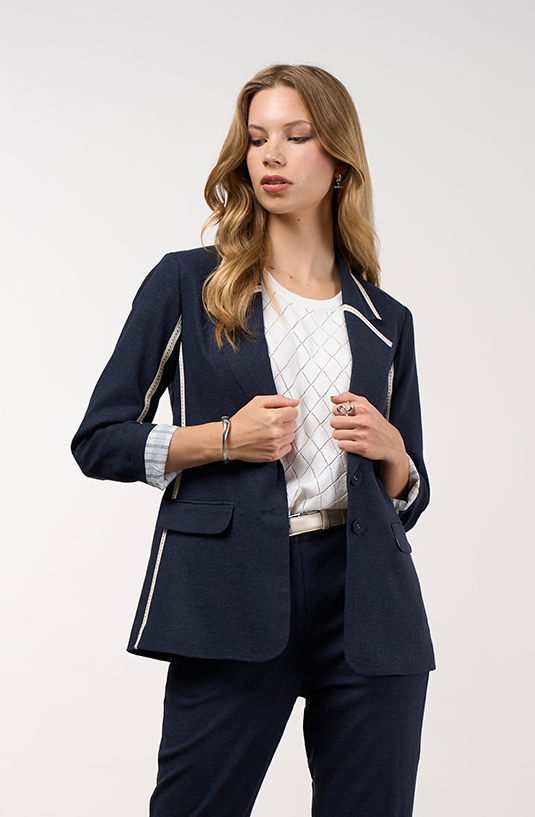 Classic blazer featuring contrast herringbone tape detail on the collar edge, sleeve panels, forward side seams and center back seams. Fully lined with functional pockets.