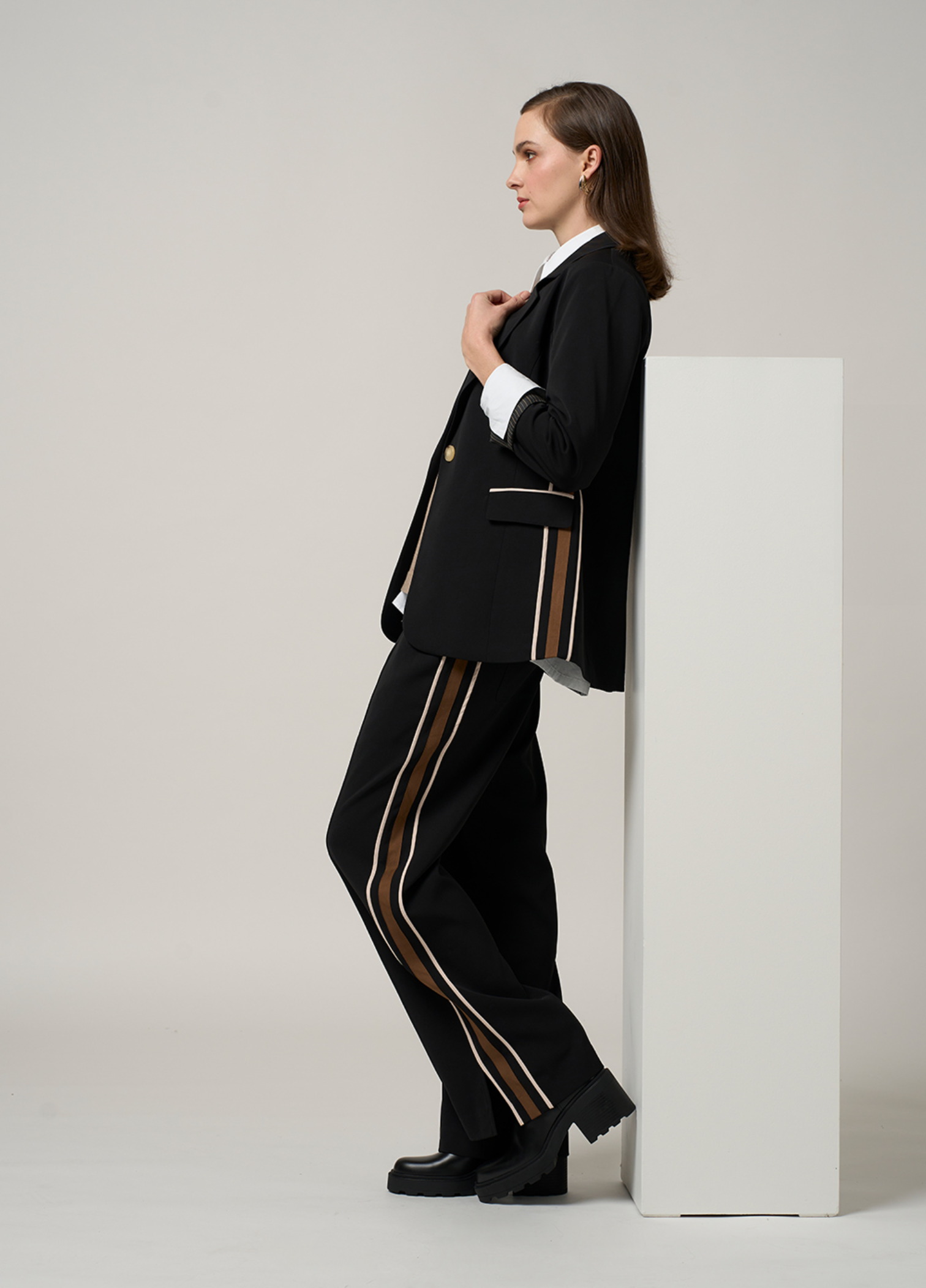 Classic double breasted tailored blazer with a squared hemline and back vent. Featuring contrast side panels and pocket details.
