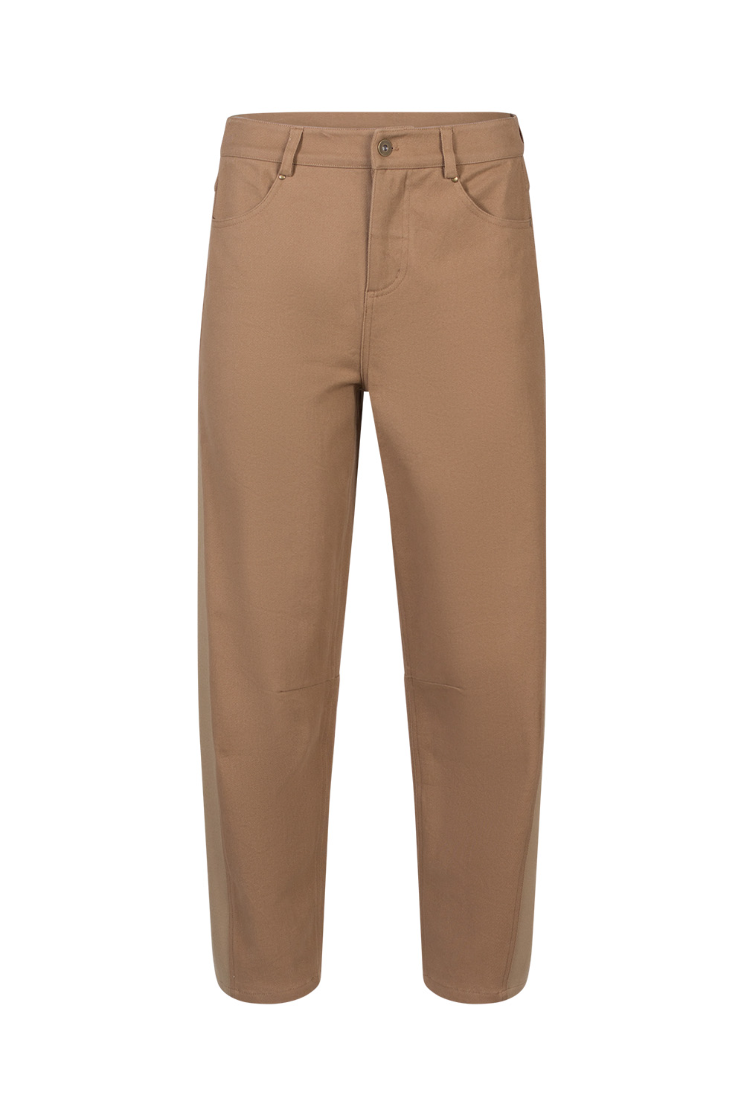Relaxed cotton pant with front and back pockets, featuring angled ponte contrast panels.