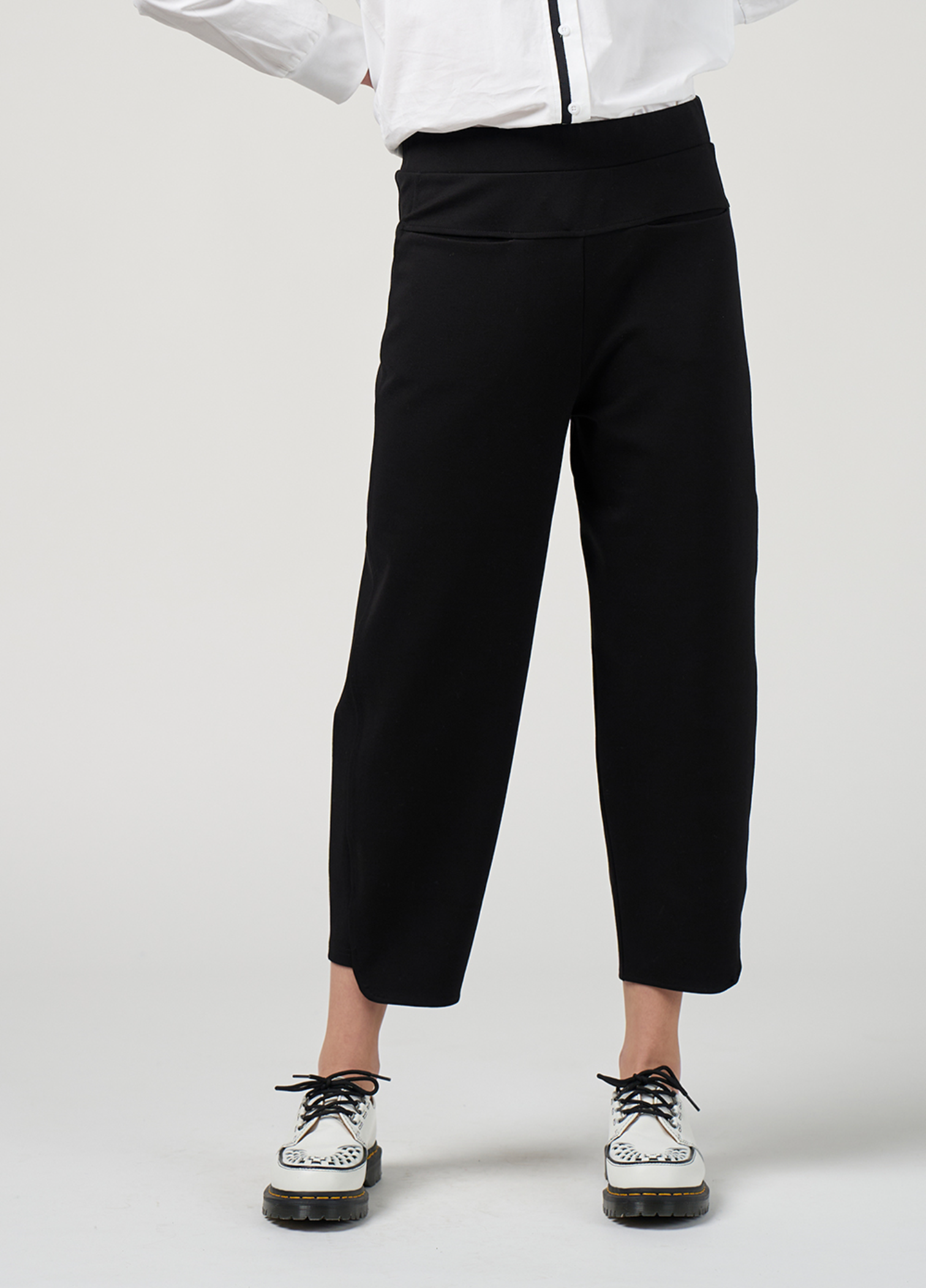 Pull-on ponte pant with a tulip style shape, featuring cropped side panel inserts and front pockets into the yoke seam for a sleek, modern look.