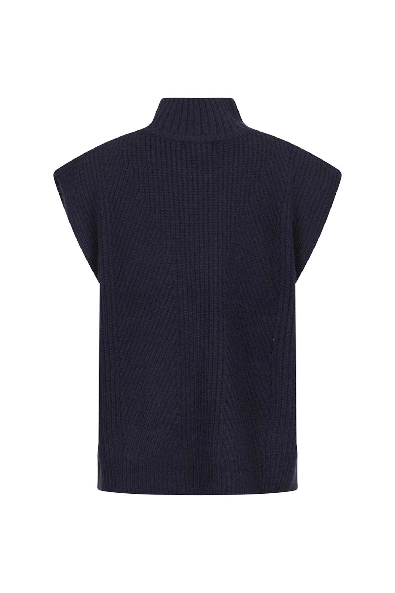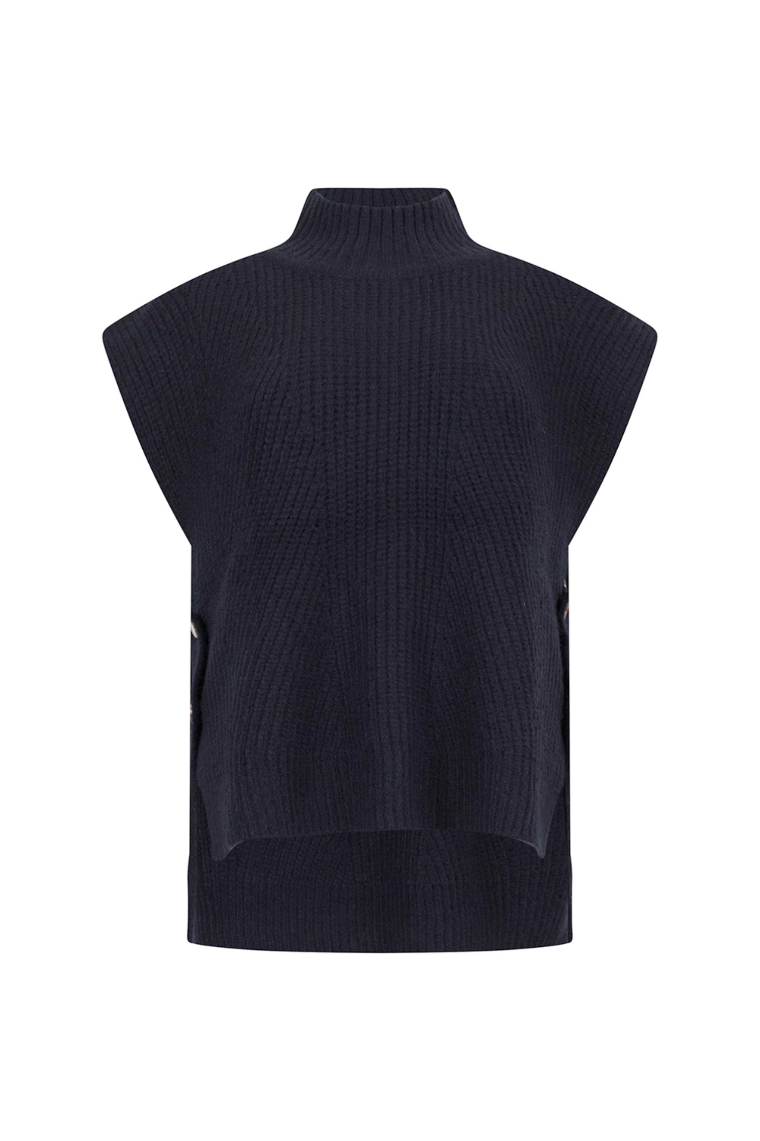 Oversized ribbed tank with a dropped shoulder, featuring a deep turtleneck and wrap over side-buttoning creating a stepped hemline.