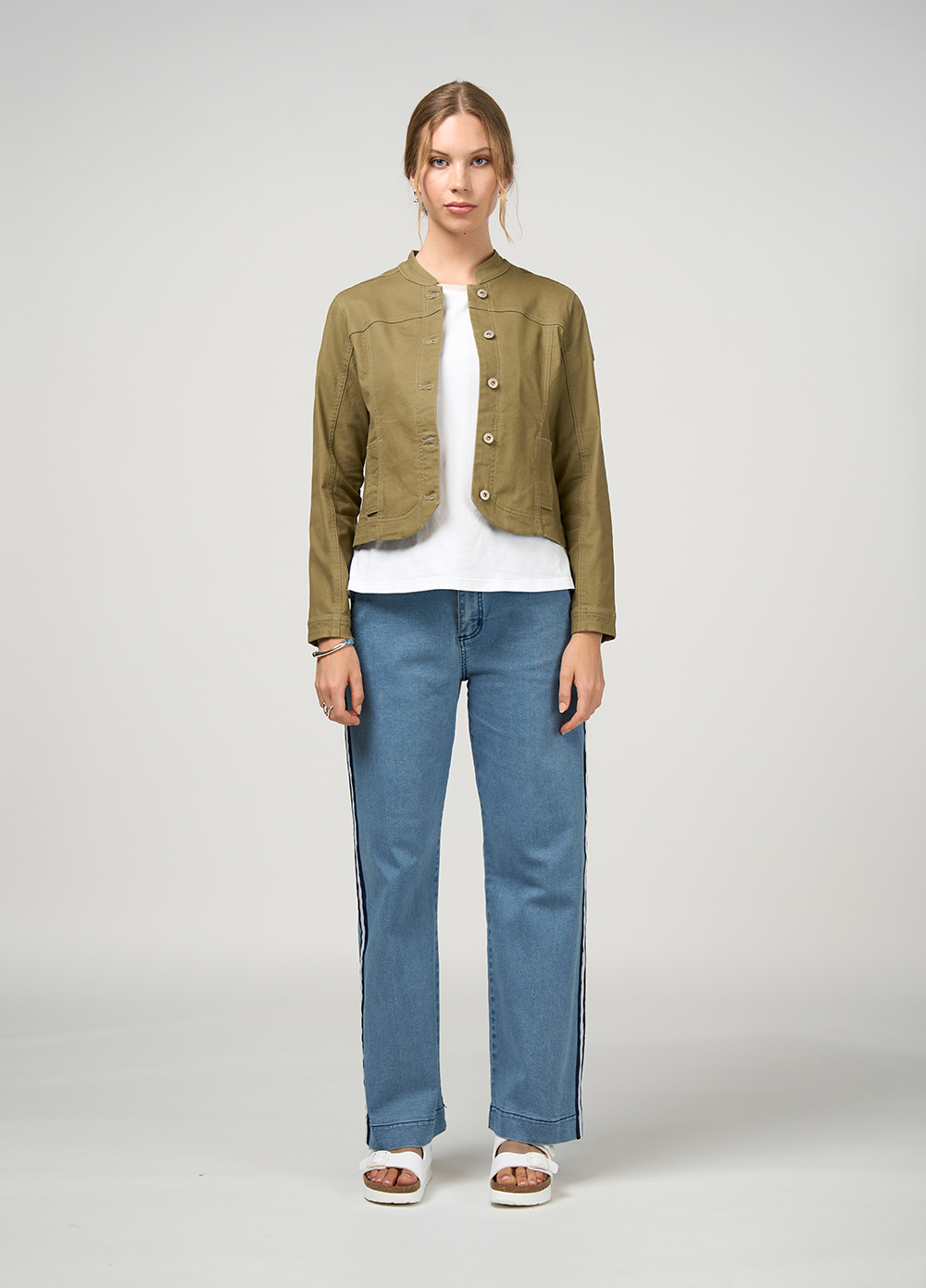 Fitted, stretch jacket with flattering panel detail front and back. Front pockets are seamed into front panel seam.