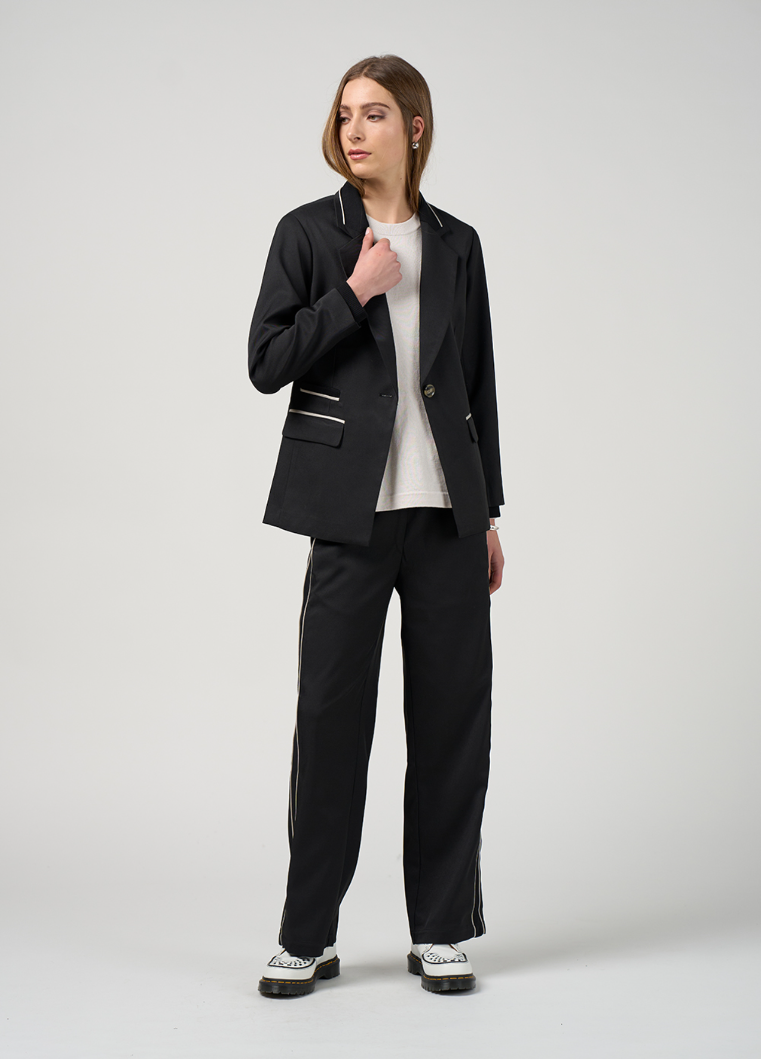 Straight leg pant with rib side panels and fine contrast insert piping, with elasticated drawstring waist and flattering forward seams with splits at the hem.