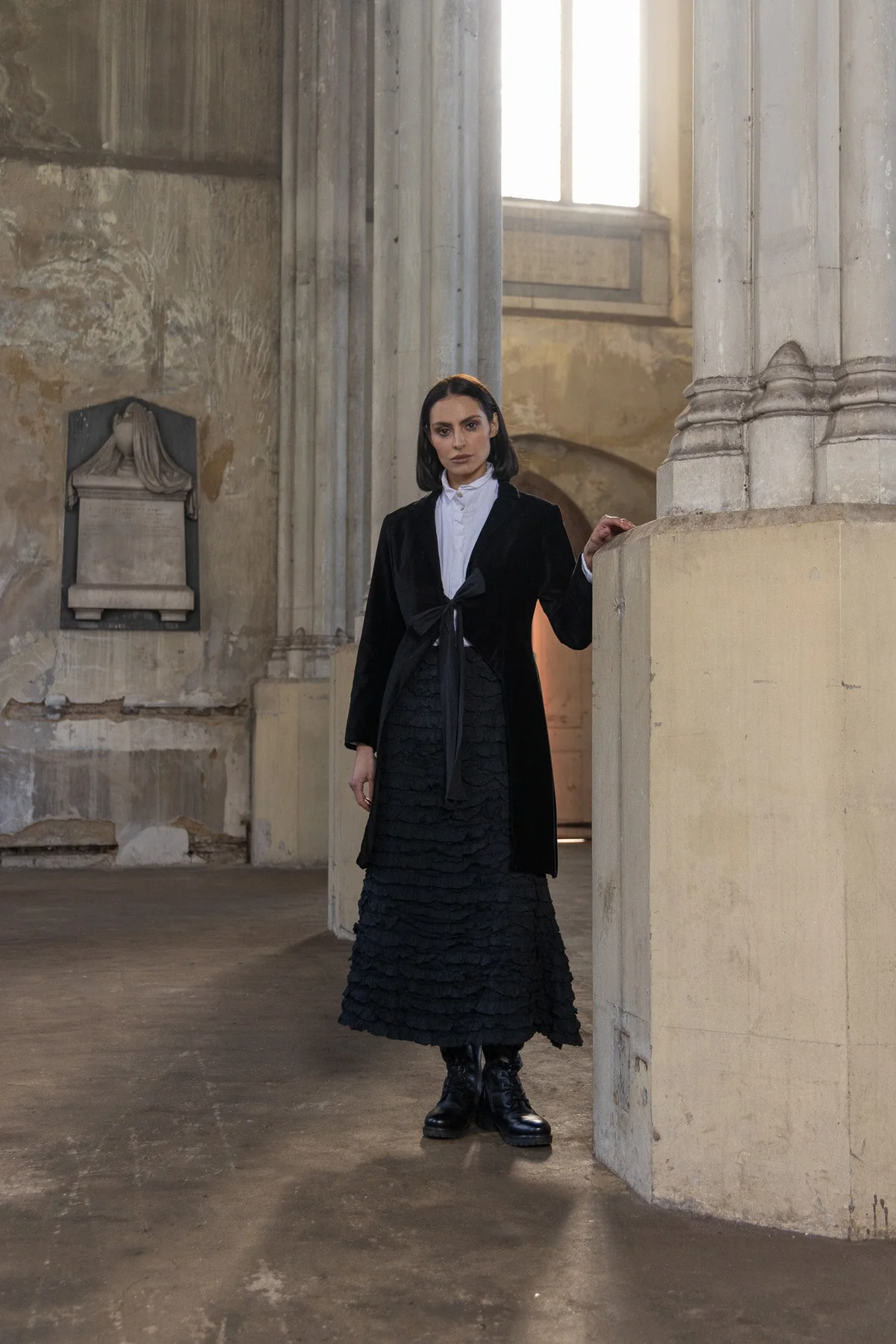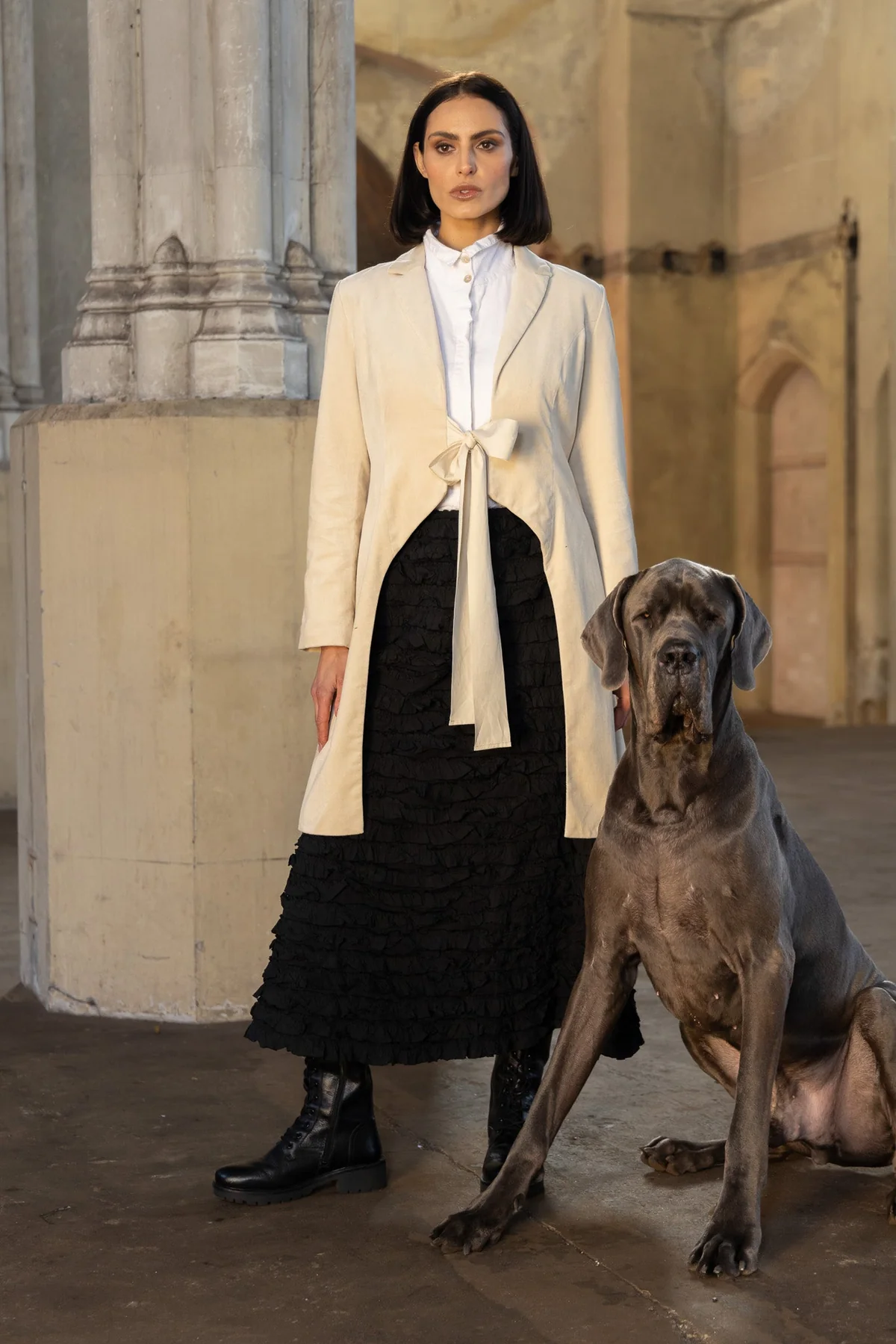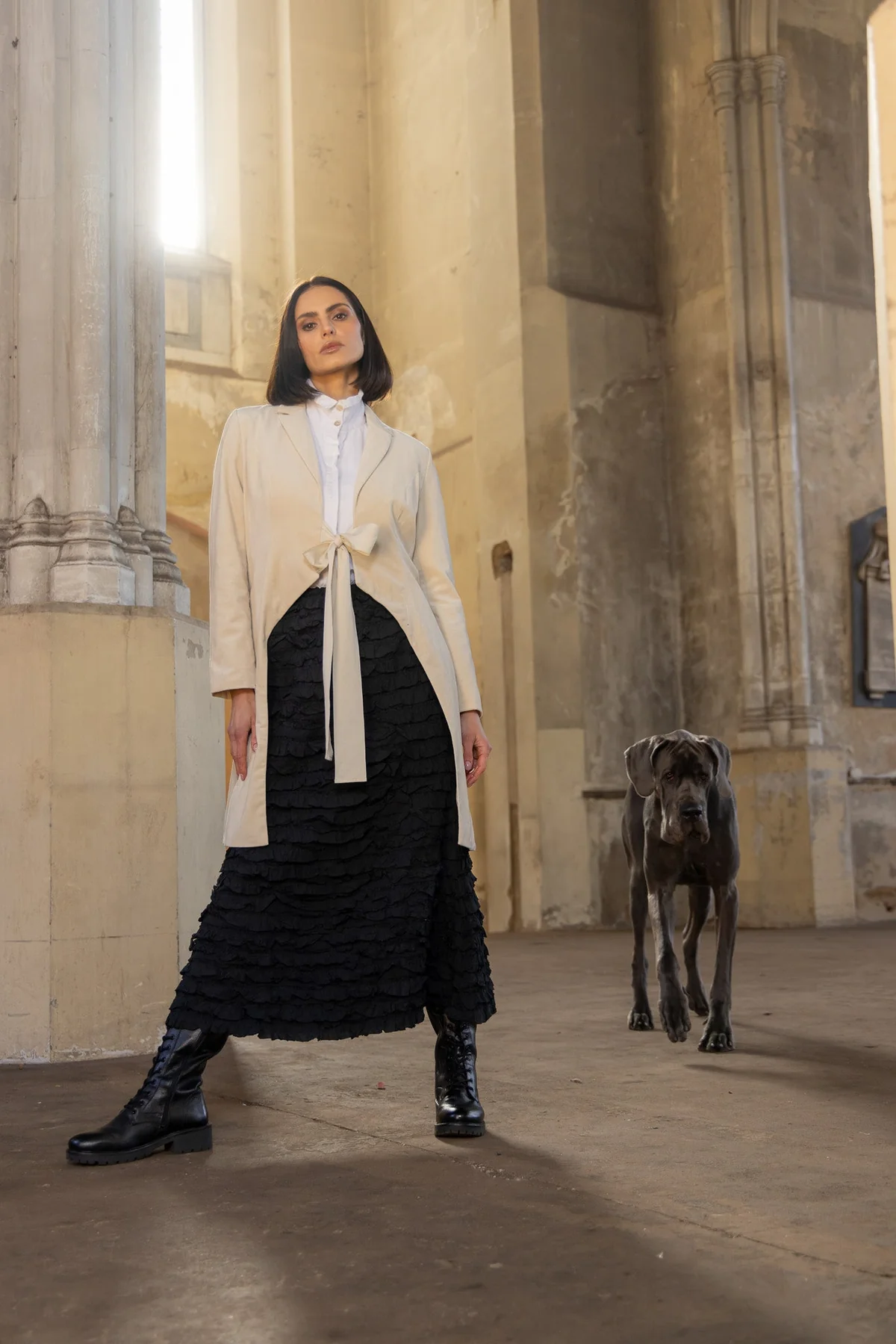 Our Morticia skirt is made from a crisp cotton twill and adorned with delicate frill detailing. Designed in a flattering mermaid silhouette, it flares at the hem for an elegant, statement look. The waist offers both comfort and adjustability with an elastic band, drawstring, and side zipper.