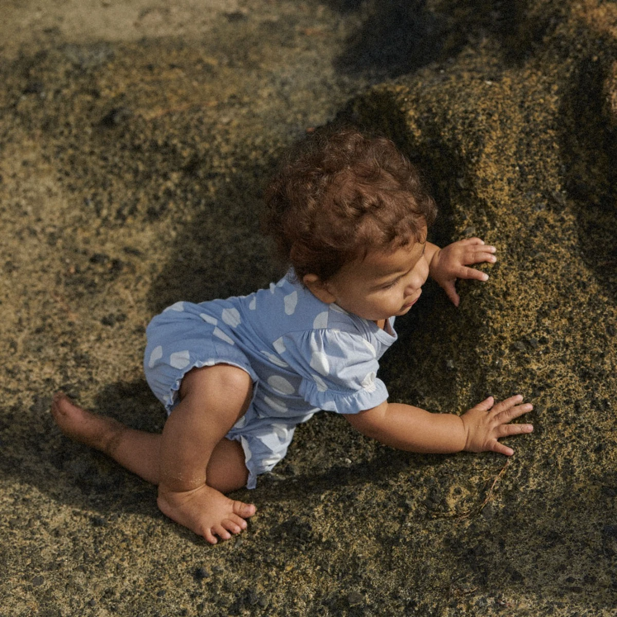 The Bubbles Suit is the perfect all in one for your little one's summer adventures. Featuring cute gathered puff sleeves with elasticated frill hem and convenient snap YKK domes at inseam for easy dressing.