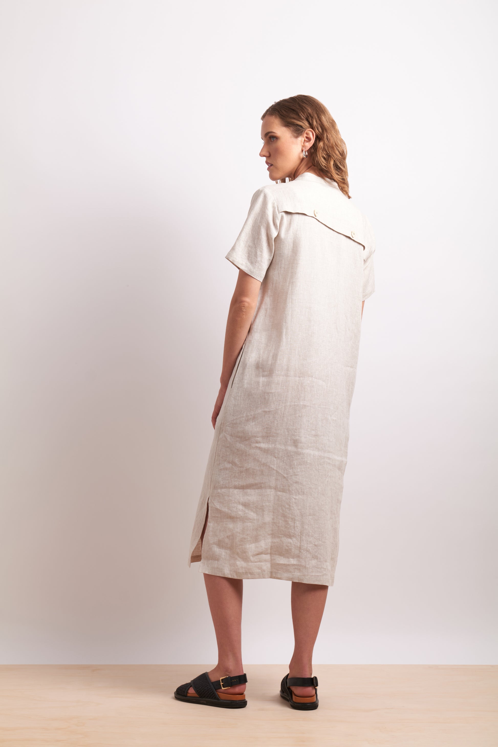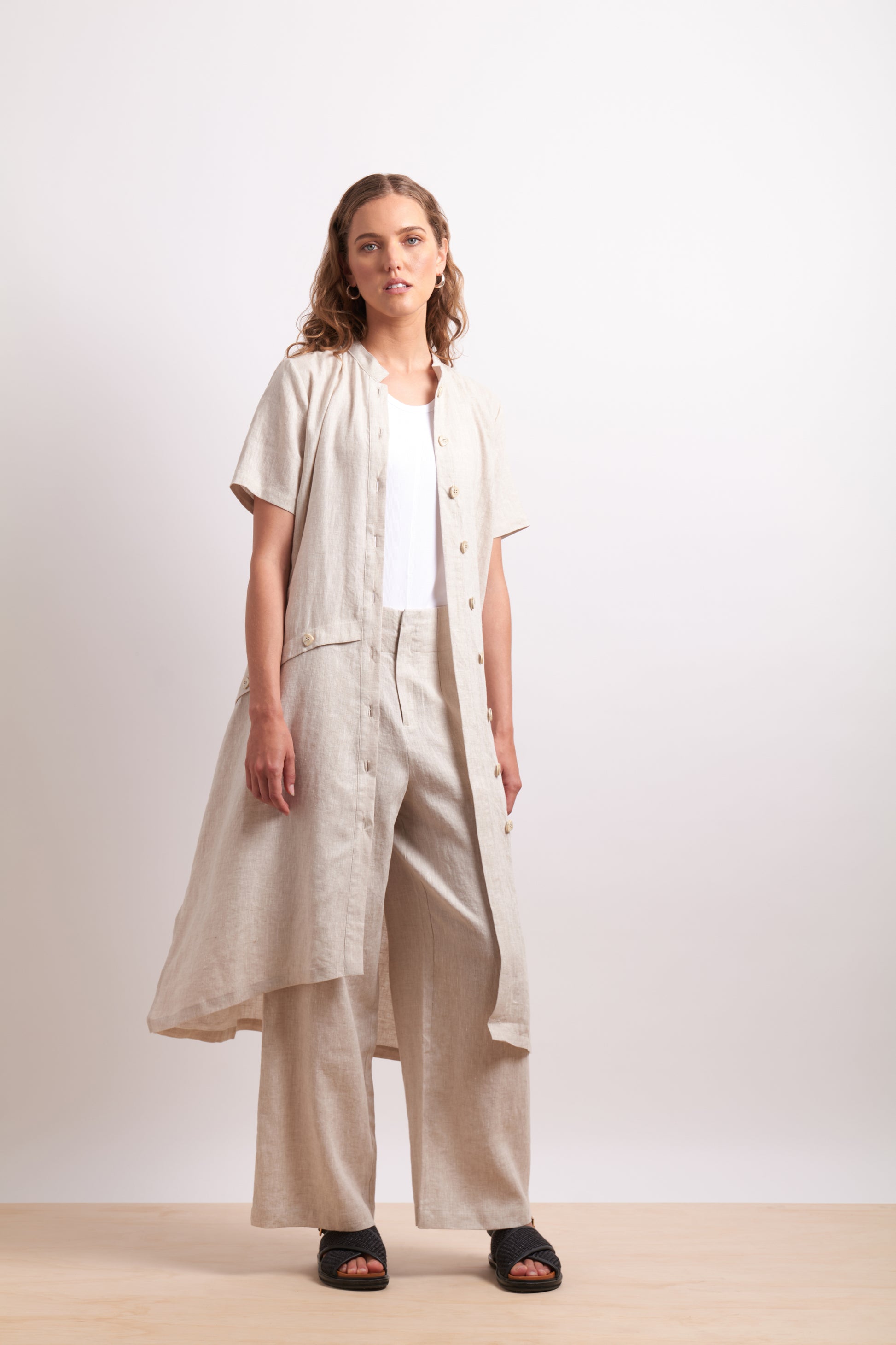 Tailored to flatter from every angle. The Divine Angles Dress is a 100% linen midi dress designed with sculptural panelling, side splits, and tonal button detailing. It has a mandarin colour and pockets and can be worn as a dress or open as a duster. A sleek modern silhouette celebrating understated design. Designed in Christchurch, New Zealand.