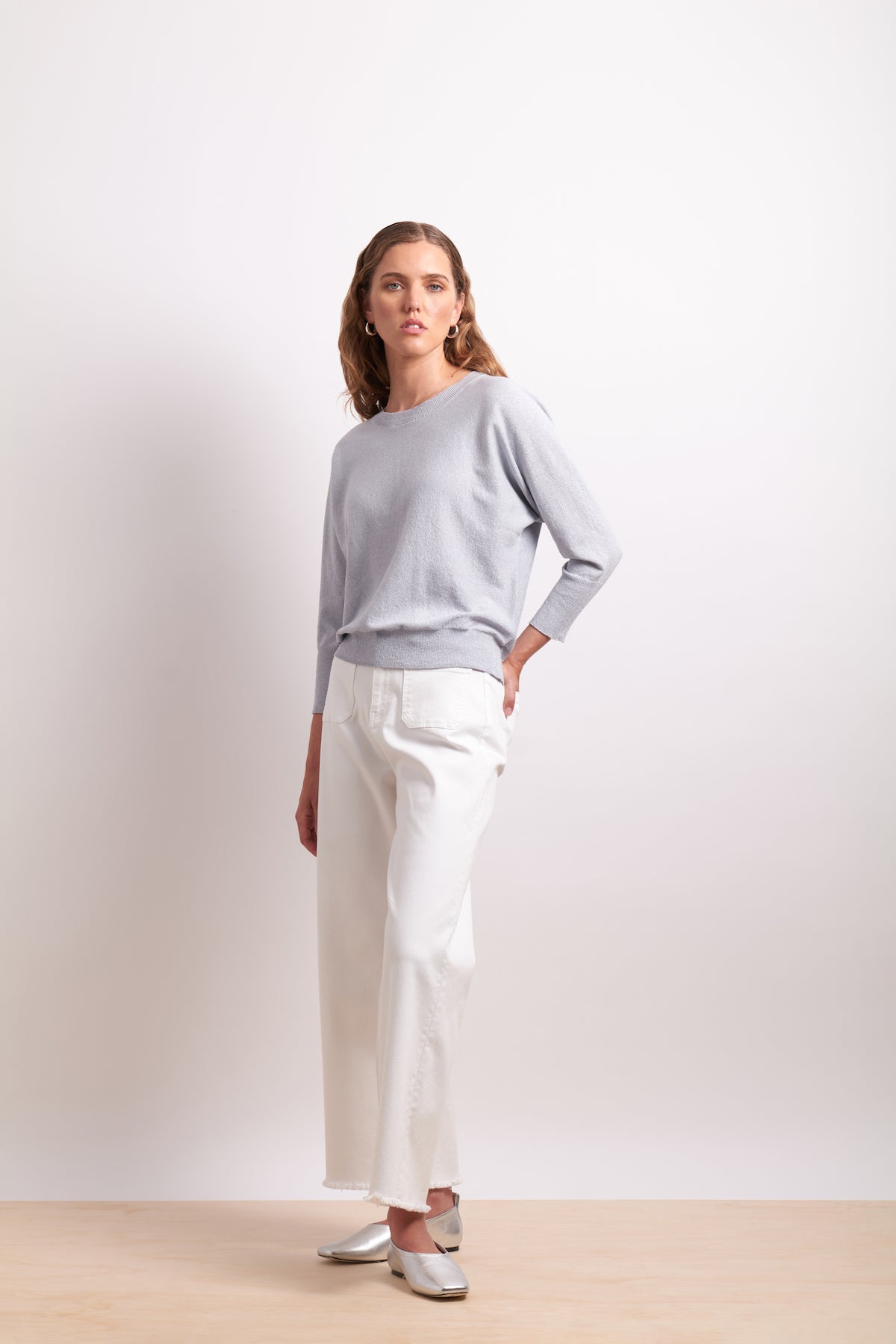 The In Ore Top is a relaxed fit with grown on sleeves, a crew neckline, and ribbed cuffs and hem. The detailing is in the back with a keyhole cut out that does up with bows on the back. A hint of shimmer in the fabric adds a subtle shine to elevate an everyday top to something extra special. Designed in Christchurch, New Zealand.