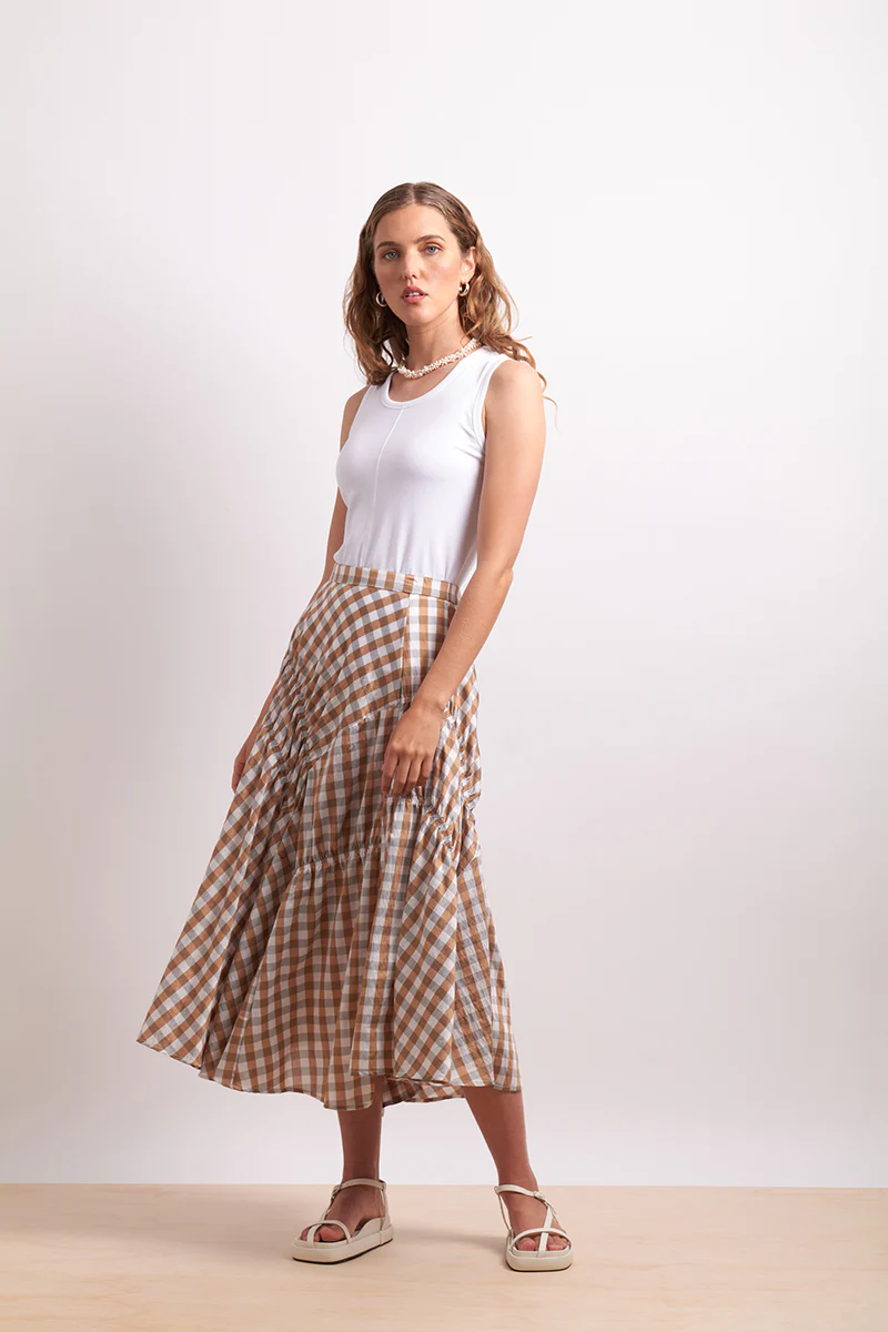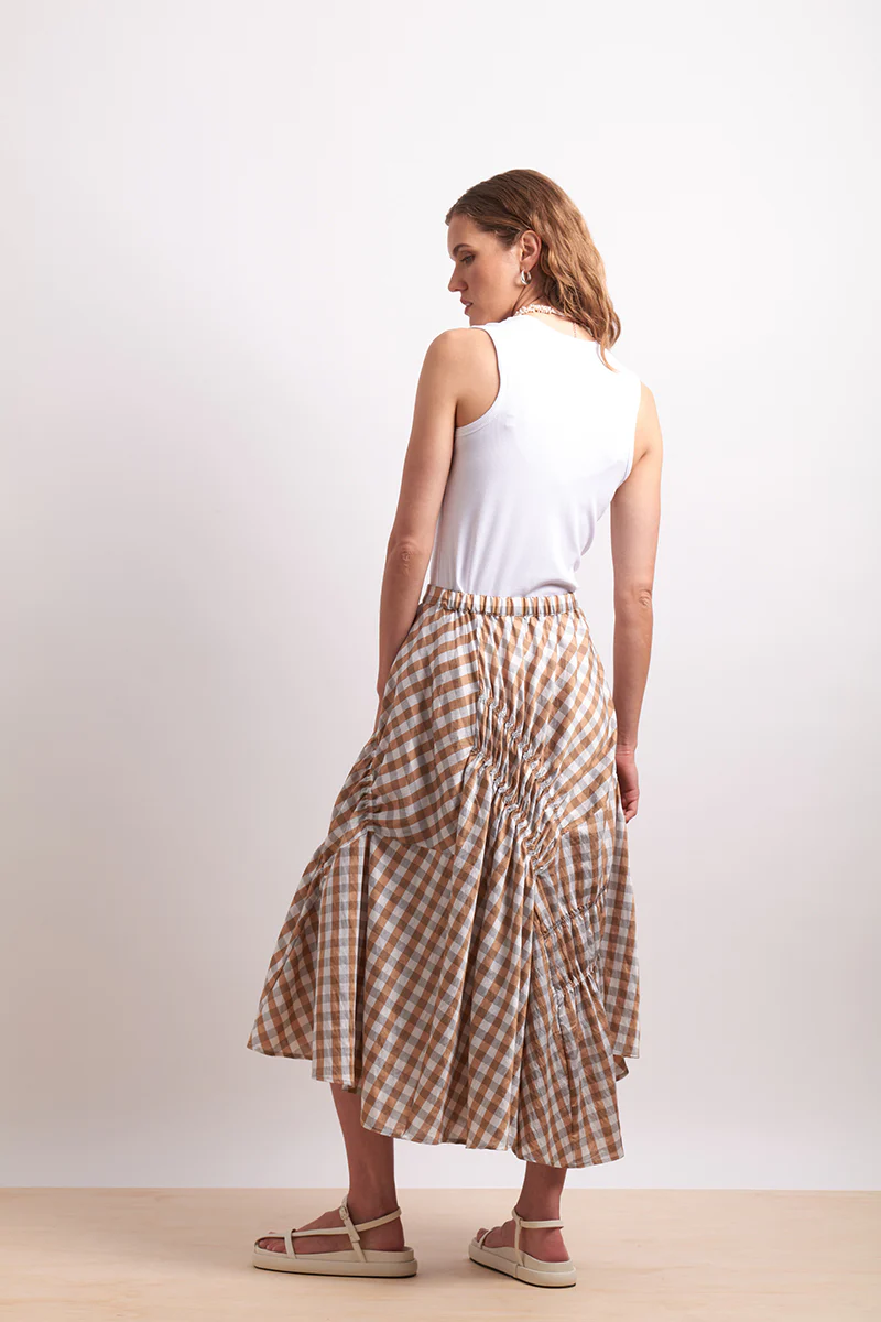 The skirt is crafted from a gingham pattern fabrication that has a subtle sheen.