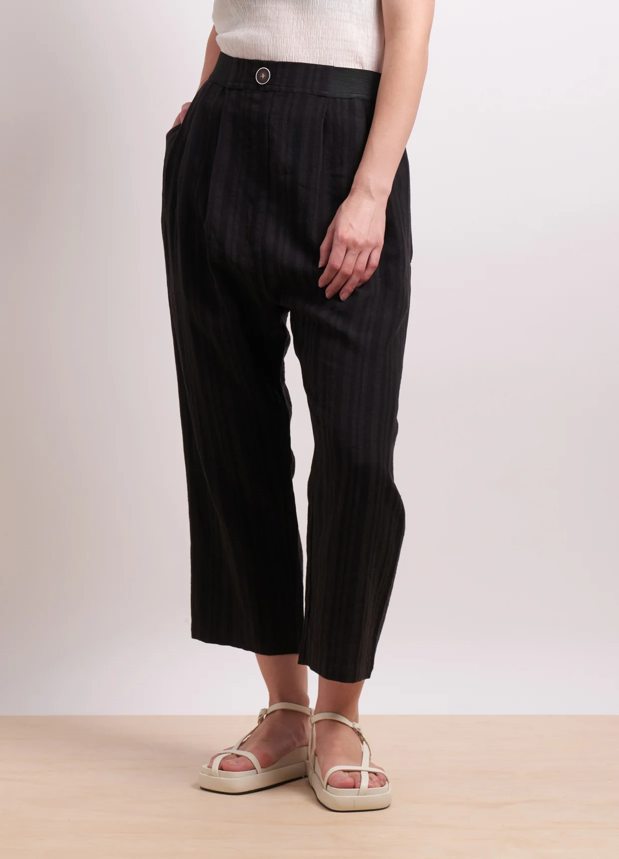 The My Space Pant is a relaxed high-waisted style in a soft linen blend with a subtle stripe. Featuring side pockets, a statement front button closure, and easy wide legs, these full-length trousers are made for comfort and quiet statement.