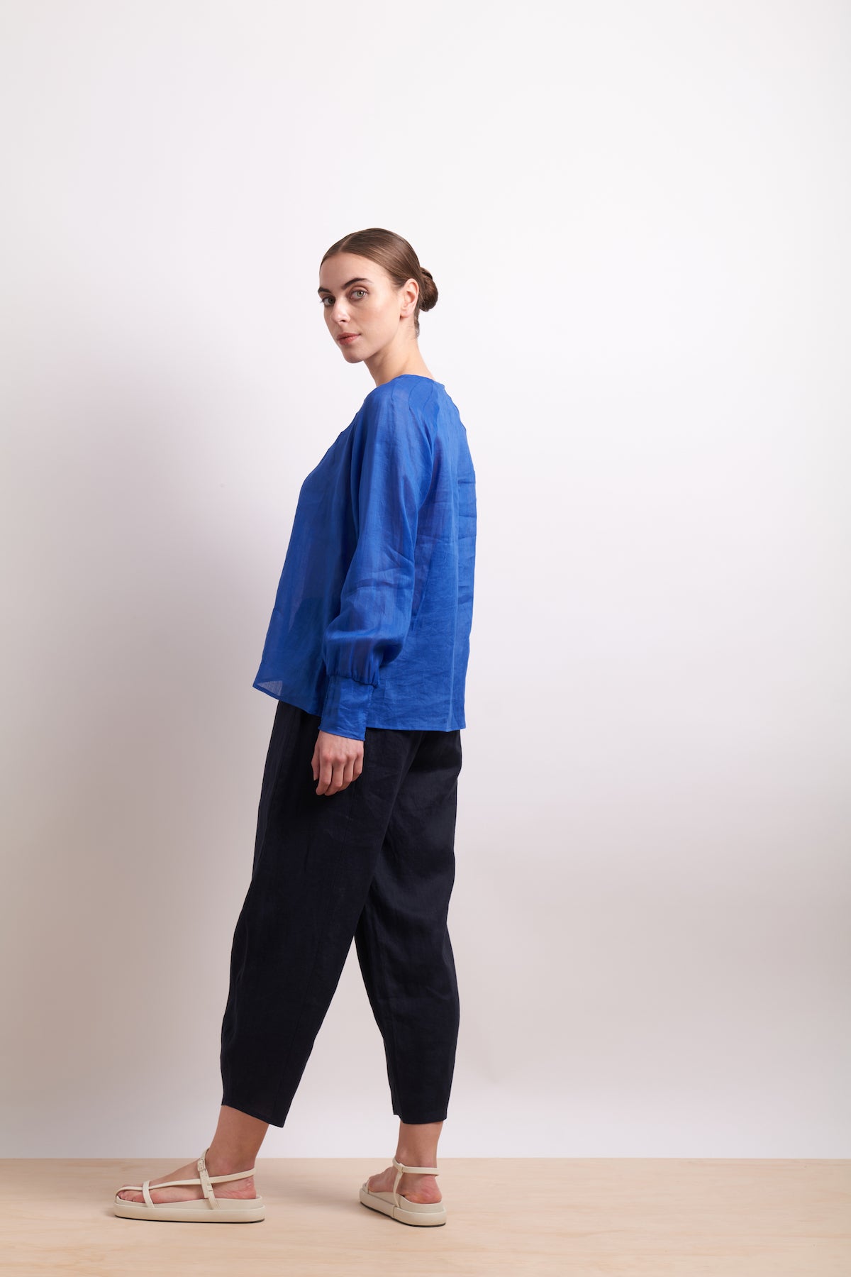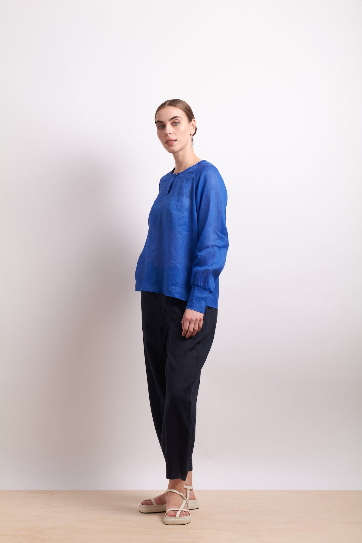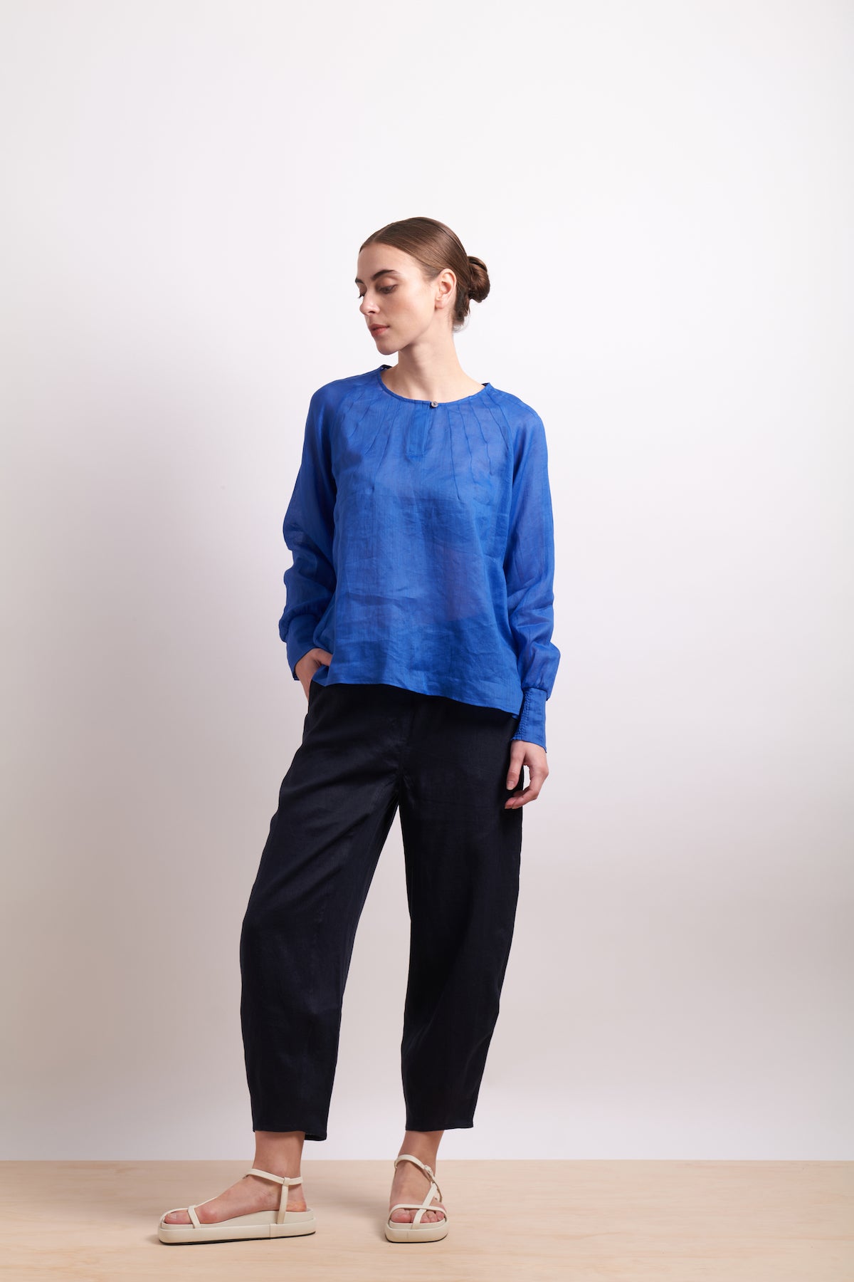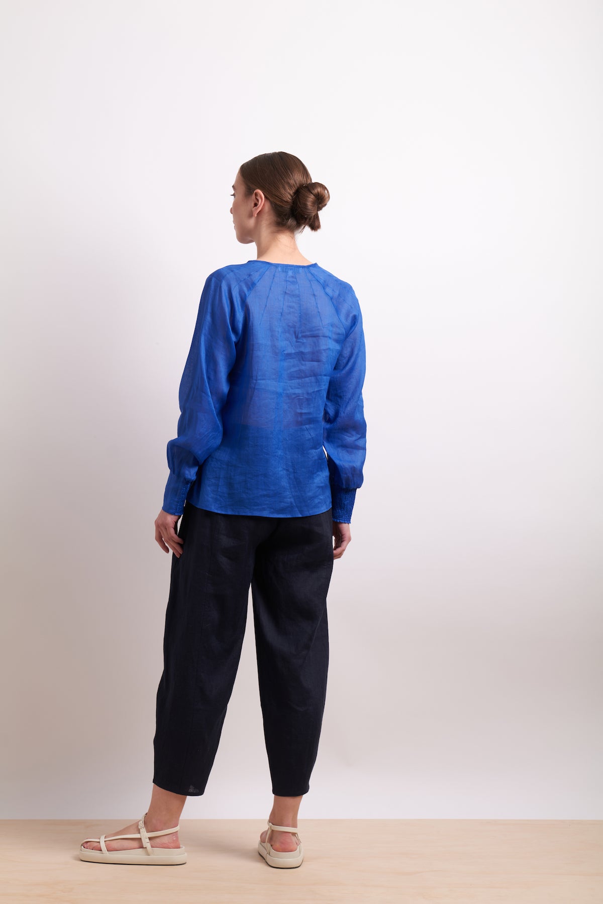 The Pin Tuck Blouse brings subtle sophistication to everyday wear. Crafted from a sheer, lightweight 100% ramie, it's a relaxed fit with elegant pintuck detailing on the collar and single bottom on to close. It has soft bell sleeves with shirred cuffs. A refined staple with a romantic touch. Designed in Christchurch, New Zealand.