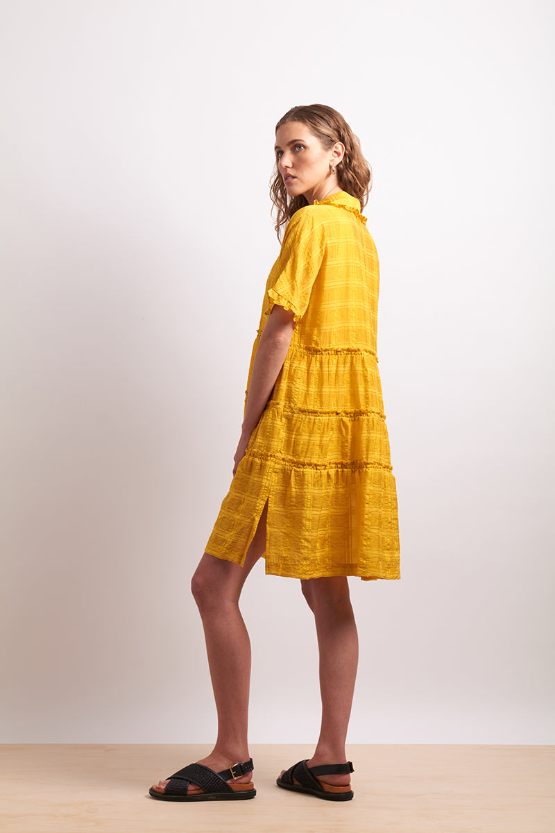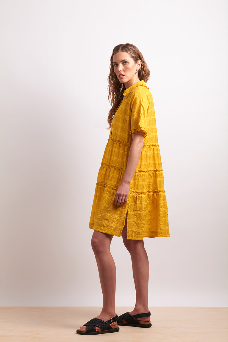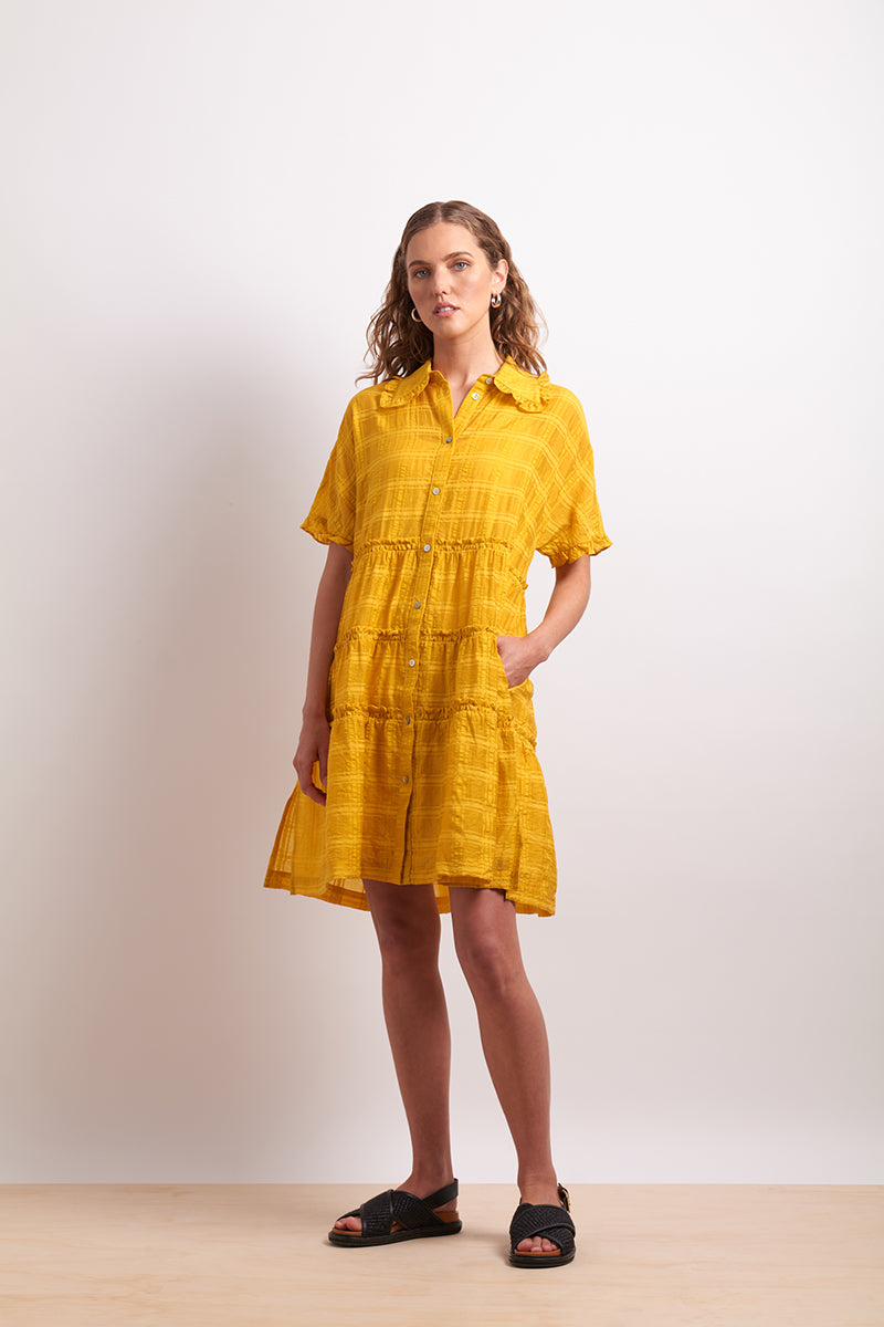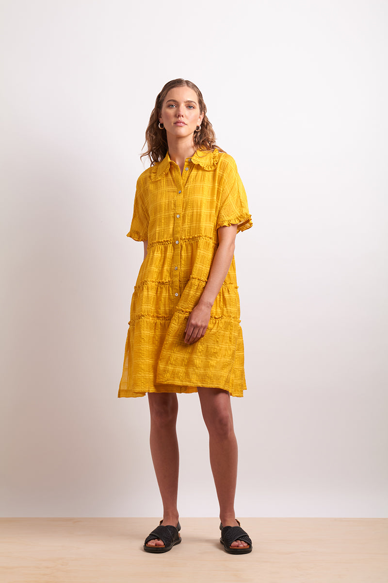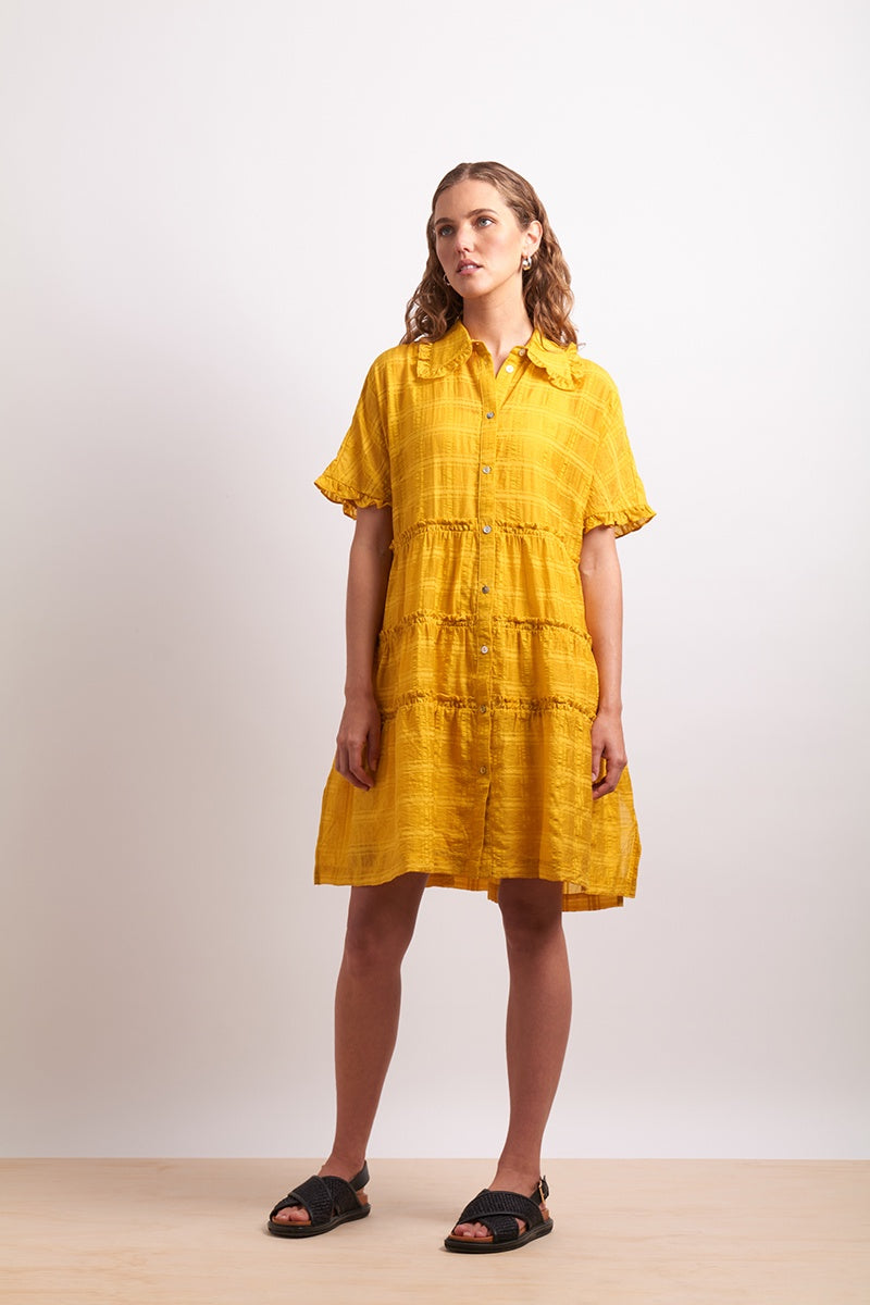 A charming silhouette with vintage appeal, The Ruffles Dress is crafted from a soft check fabric and cut in a relaxed, tiered knee-length shape. Featuring a ruffled collar, elbow-length ruffle sleeves, and practical front pockets, this button-down style brings effortless whimsy to everyday dressing. Designed in Christchurch, New Zealand.