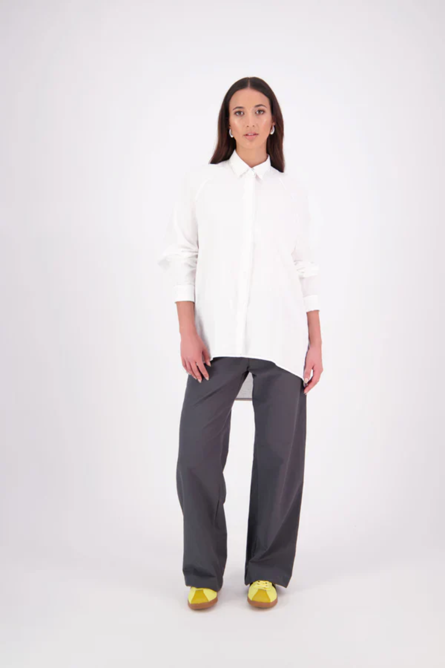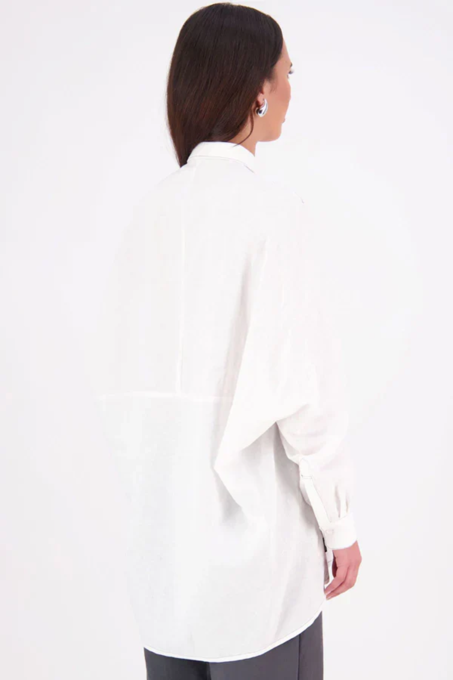 The N-E-S Zola Linen Shirt is a kimono-style oversized linen cotton shirt with a relaxed, modern silhouette. Featuring a horizontal drop-back panel for added movement, 7/8 sleeves, a classic collar, centre front button placket, and button-up cuffs and black contrast stitching. A versatile piece that blends structure with flow—perfect for layering or wearing as a statement on its own.