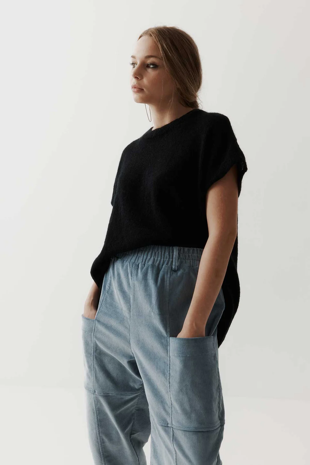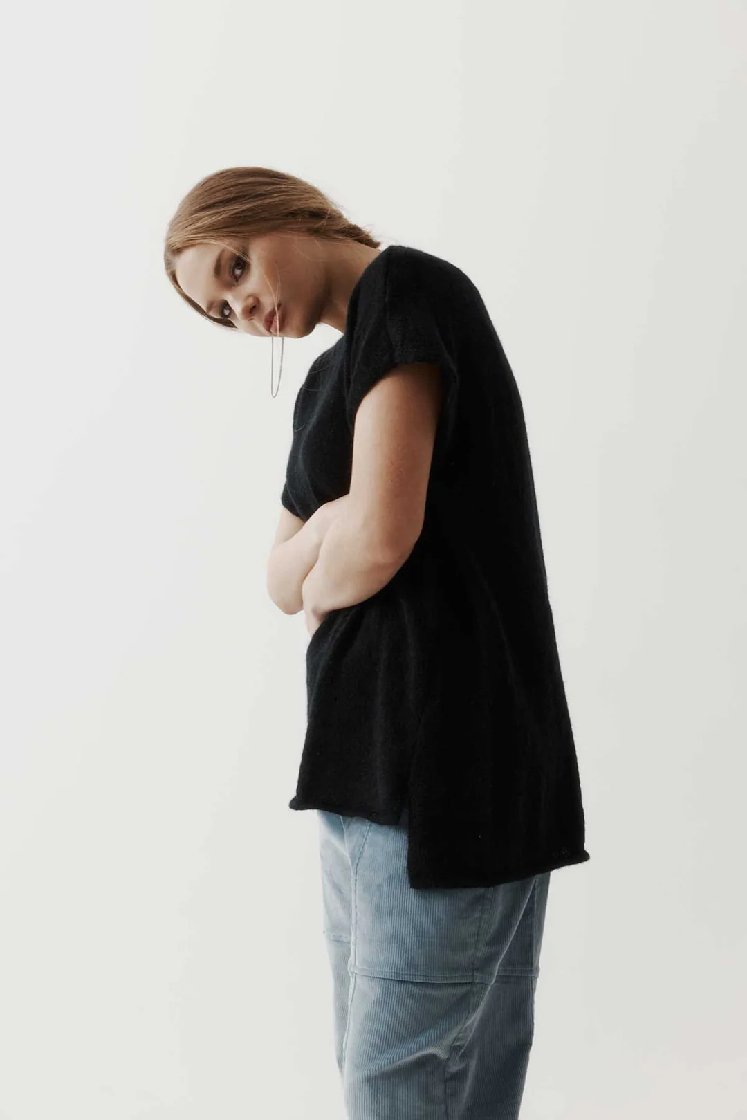 The Louie Vest in Raven Black is a delicate balance of comfort and effortless style. Crafted from a luxurious blend of 30% kid mohair, 30% wool, and 40% nylon, this lightweight sheer knit vest offers a soft, airy feel perfect for layering. Featuring a stepped hem for a relaxed, flattering drape, it adds an elegant touch to any outfit. Whether worn over a fitted top or styled on its own, the Louie Vest is a versatile staple that brings warmth without the bulk. Elevate your wardrobe with this chic, textural piece in a vibrant, statement-making hue.