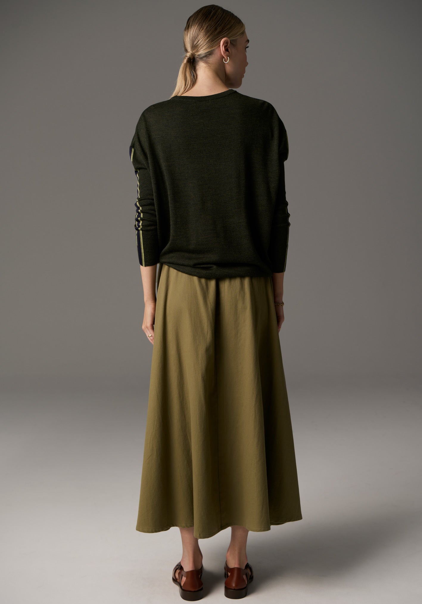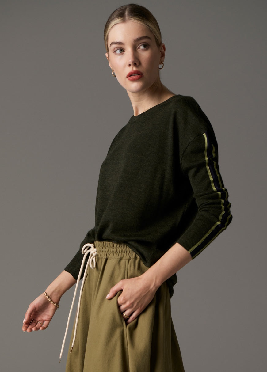 The Bennet Drape Knit is an update to a classic POL silhouette, made from lightweight merino with a contrast stripe sleeve.