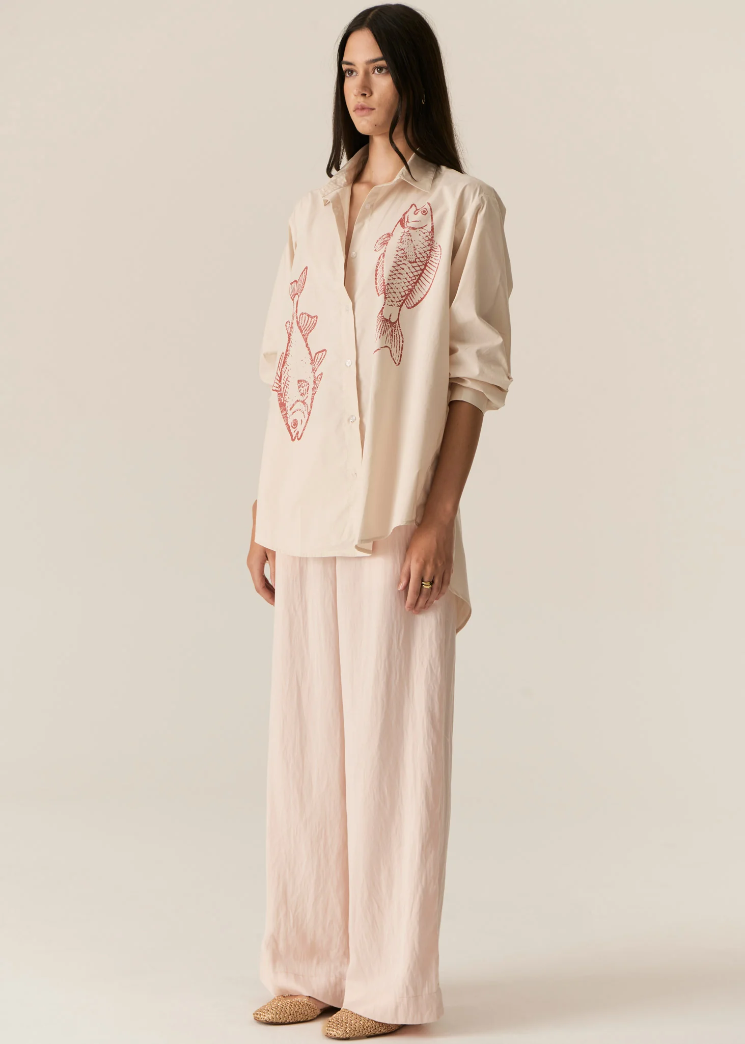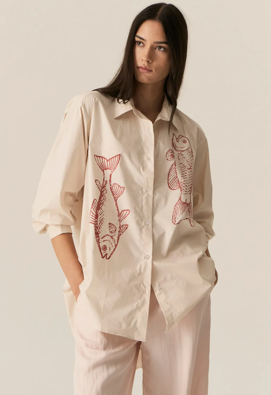 Featuring an exclusive hand drawn design, the Cassis Fish Print Shirt features an oversized fit through the body and a curved hem.
