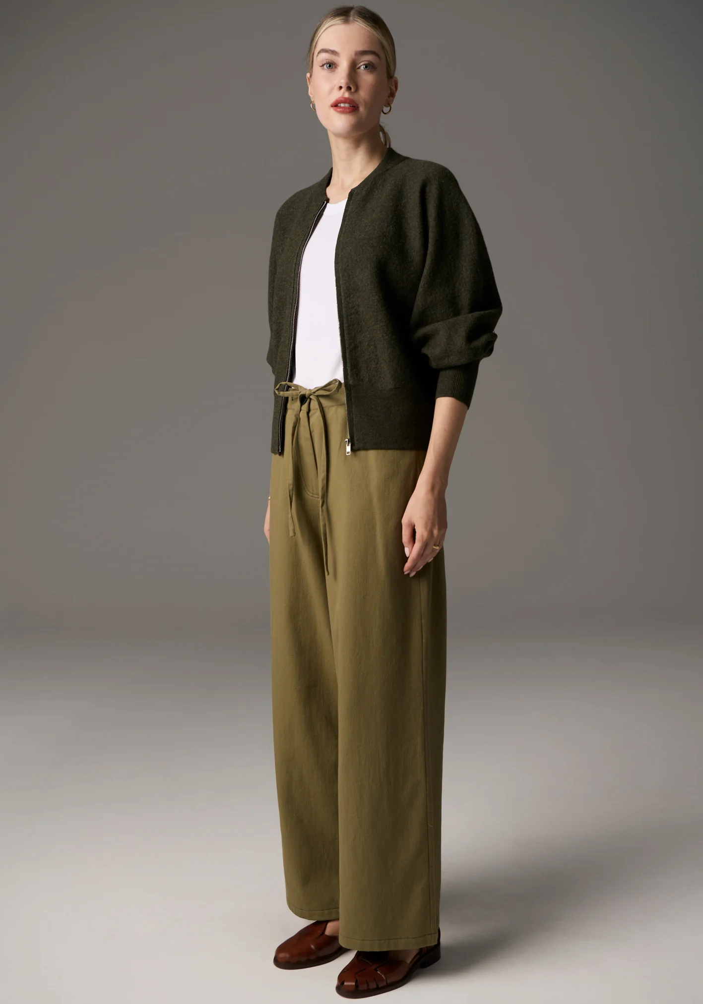 -Dolman style sleeves draw in at the ribbed cuff.
