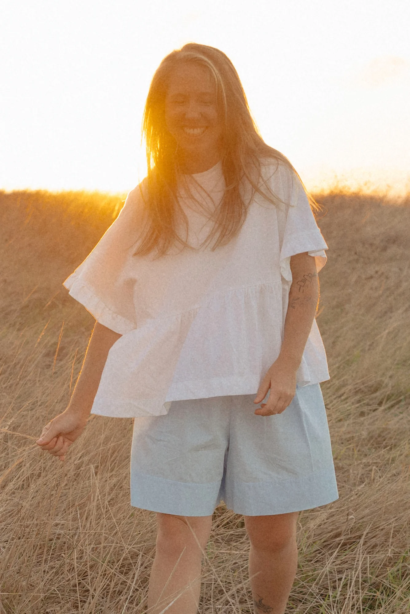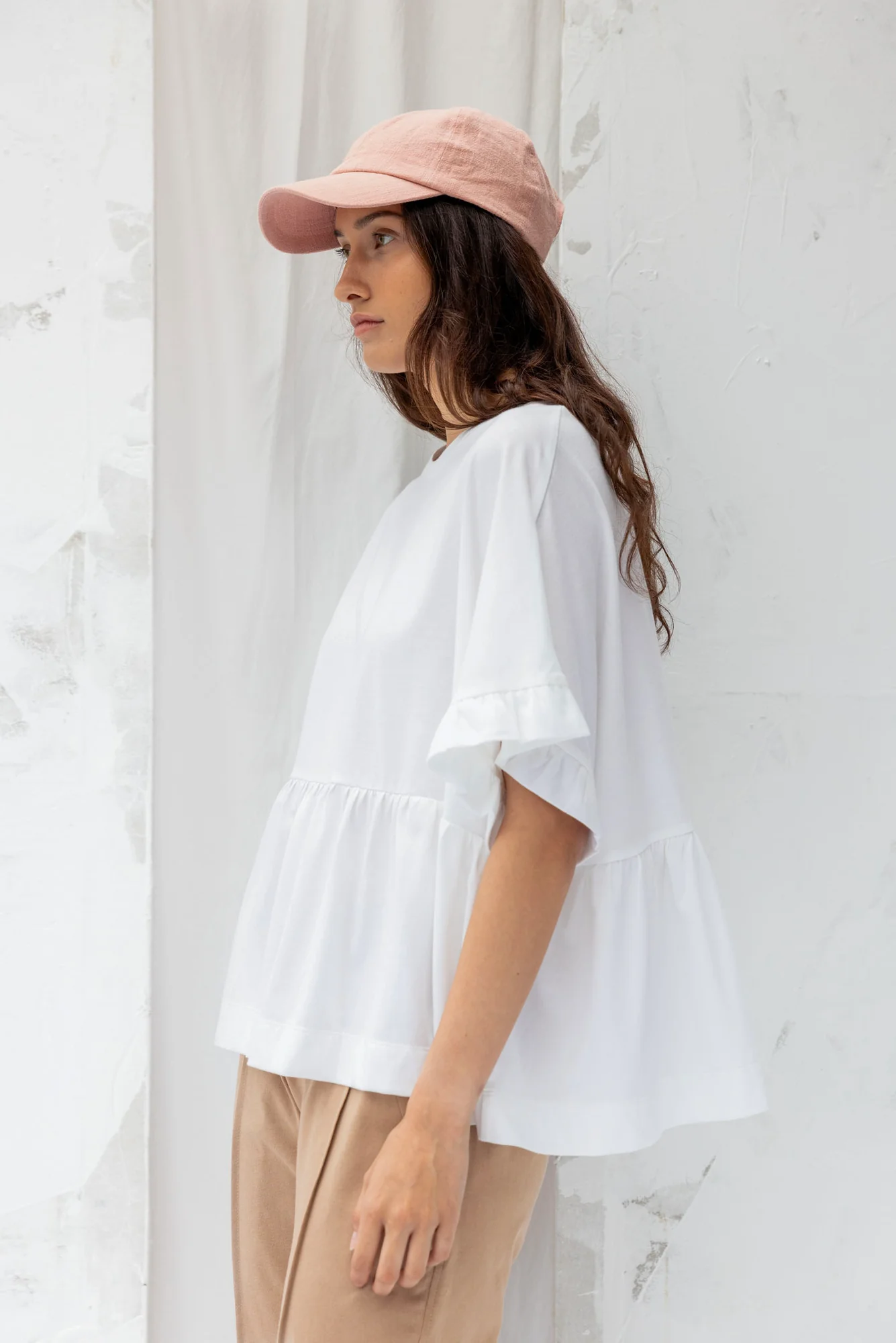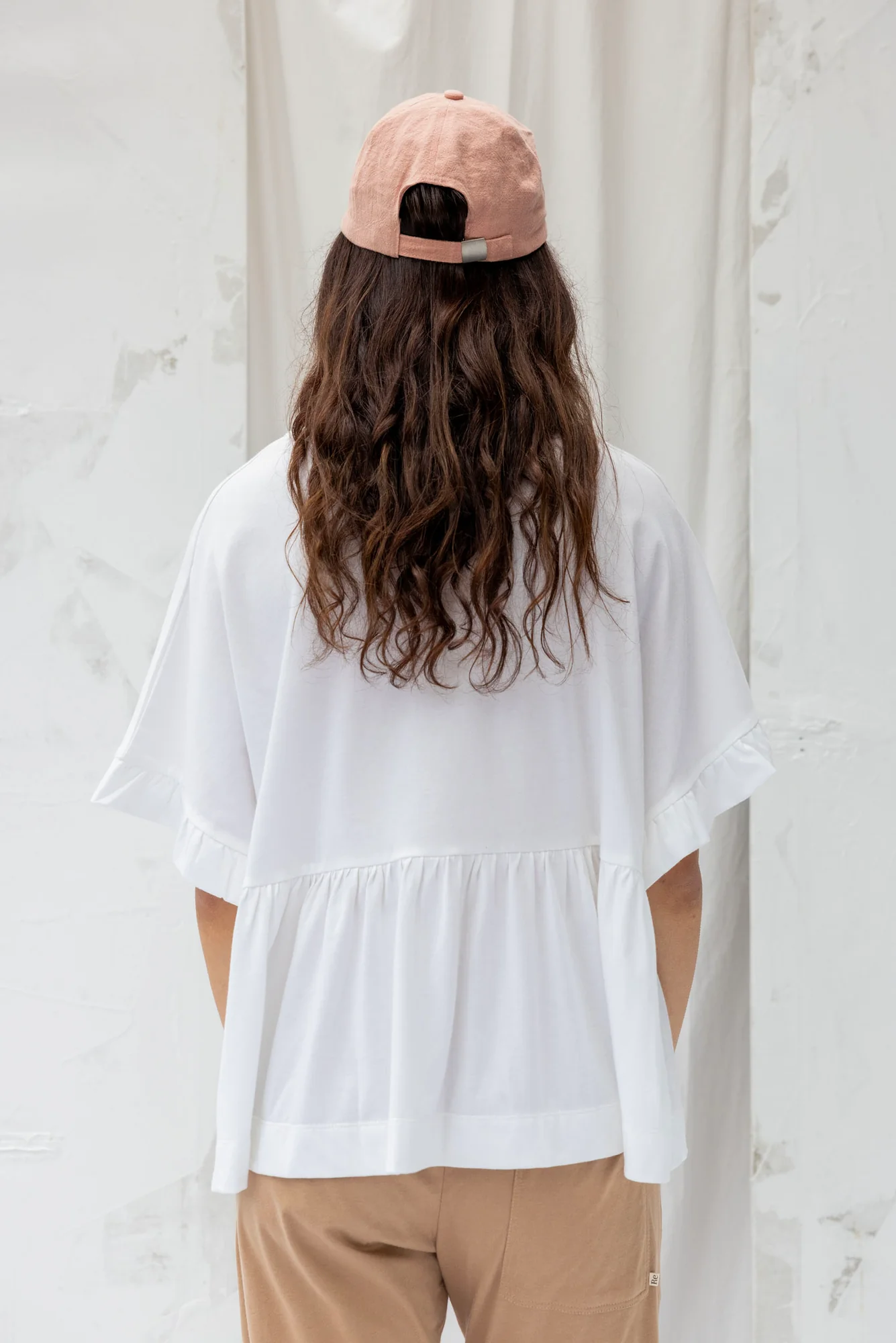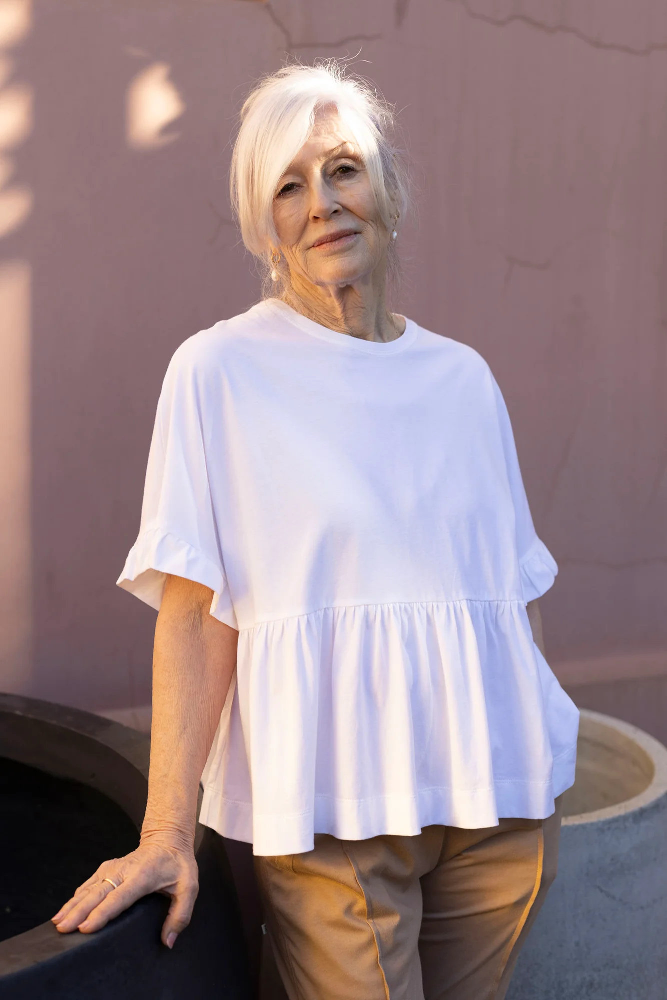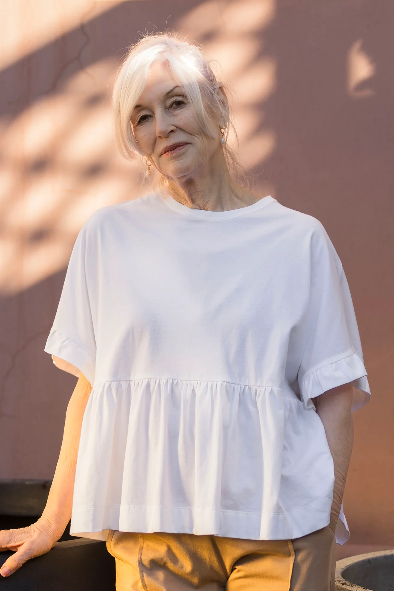 Featuring a wide body with a classic crew neckline, a gathered panel on the lower body, and a ruffle at each sleeve.