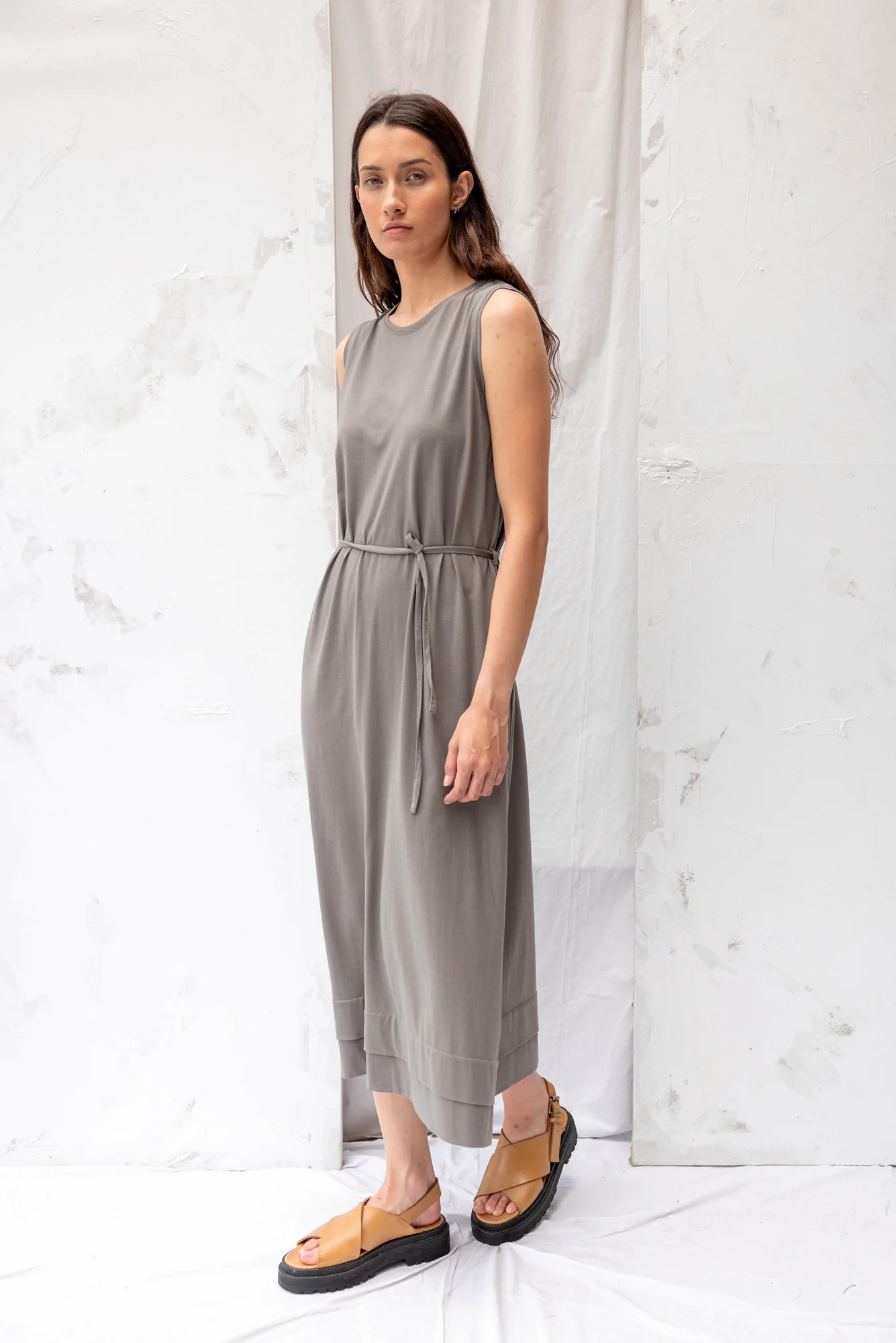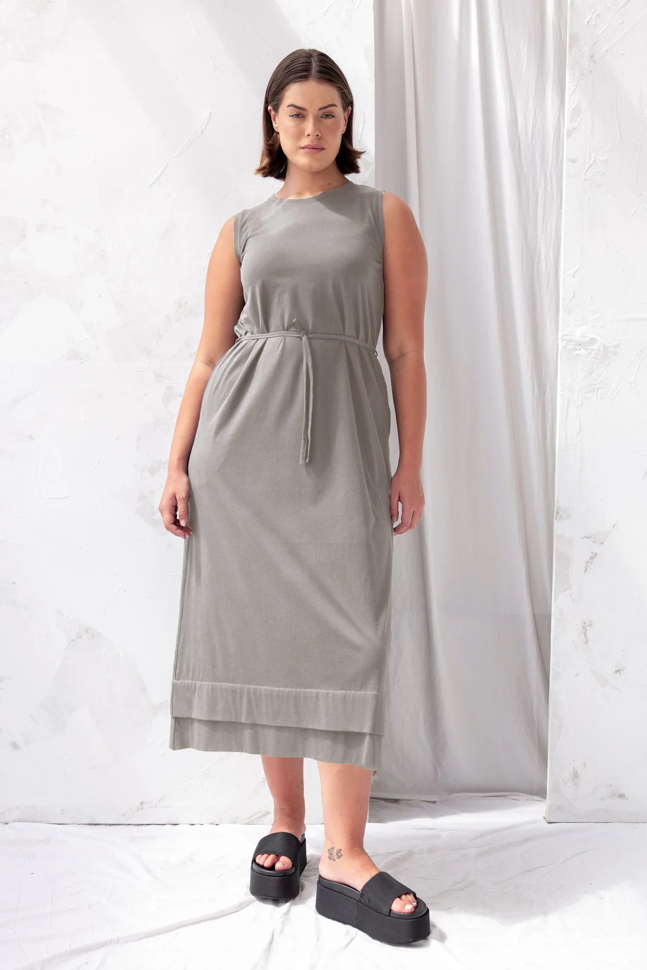 Featuring a sleeveless A-line cut, side seam pockets, a removable self-fabric waist tie, and a double layer hemline.
