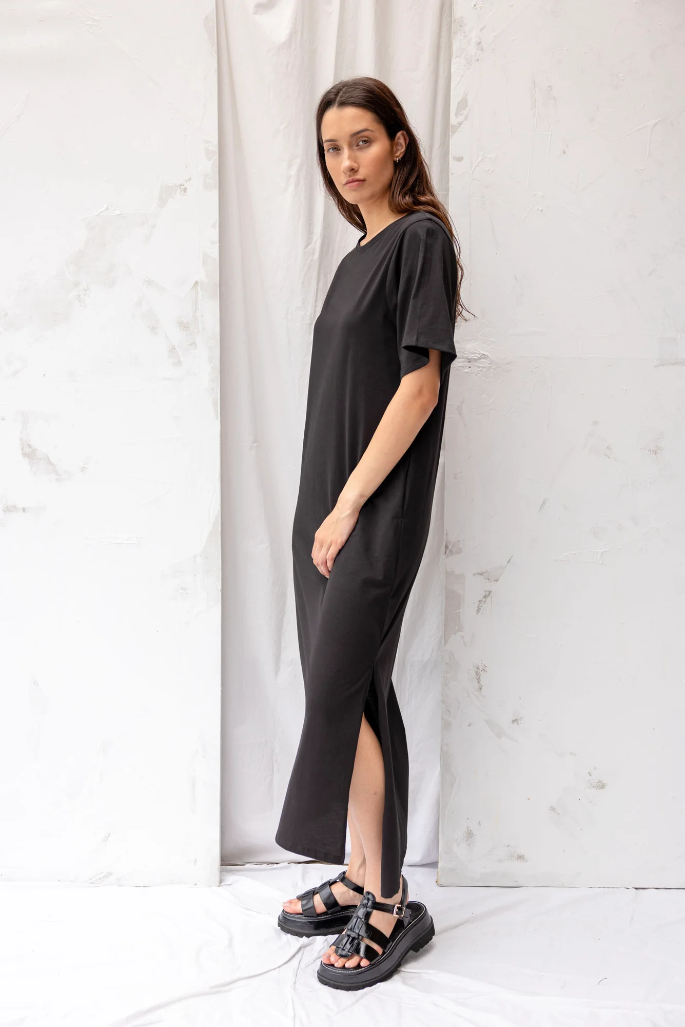 Featuring a relaxed fit, wide sleeves, side seam pockets, and a stepped hemline with side splits.