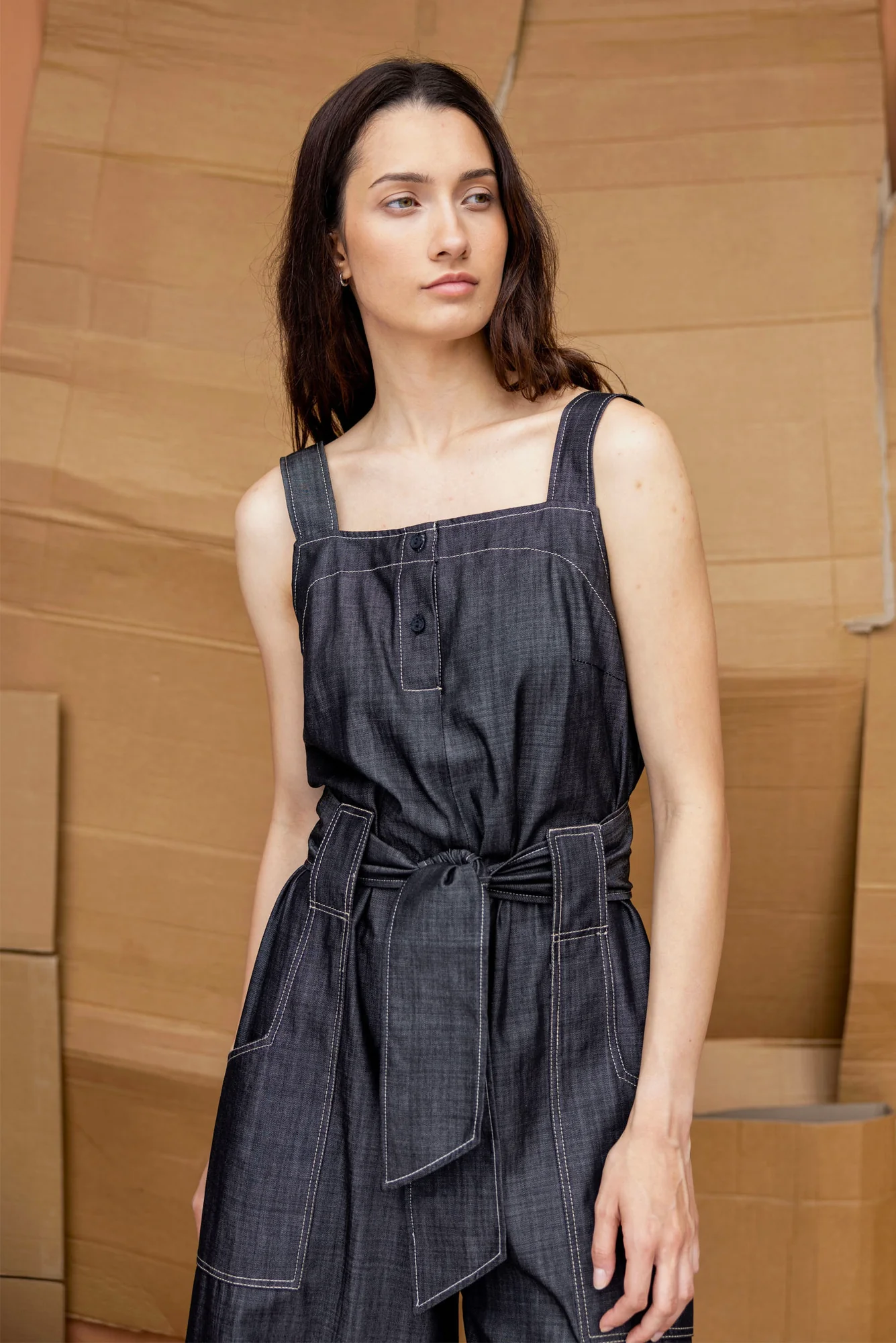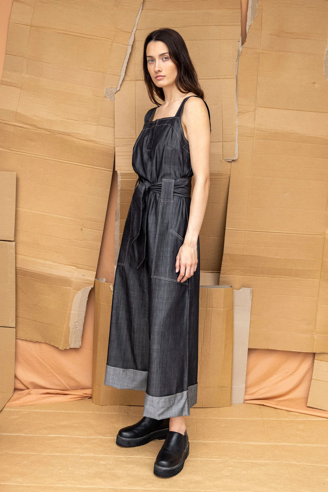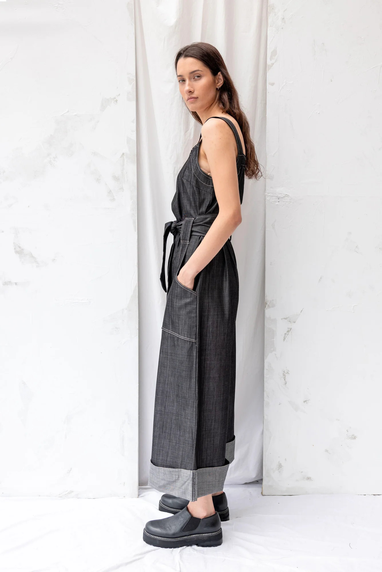 Featuring wide shoulder straps, front button placket, wide waist tie with oversized belt loops, patch pockets, and a wide leg with turned up cuffs.