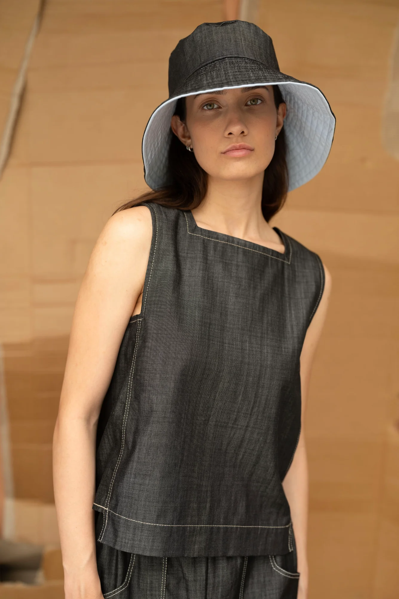 Featuring a boxy fit with square neckline, rectangular side panels, stepped hemline, contrast stitching, and detailed with recycled cotton buttons at the rear.