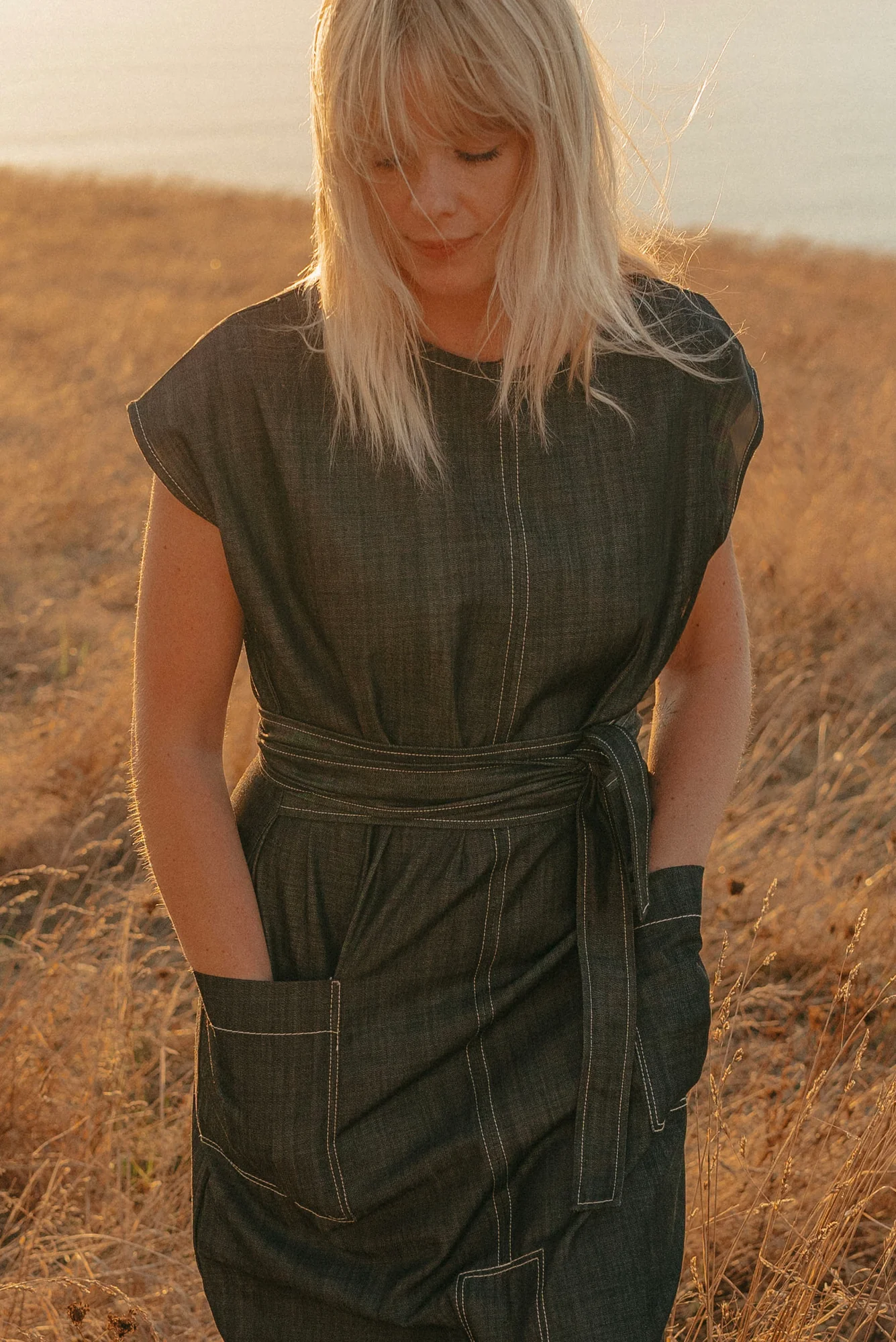 Featuring cap sleeves, patch pockets, a centre front seam with a split skirt, and long ties that can be fastened in a variety of ways.