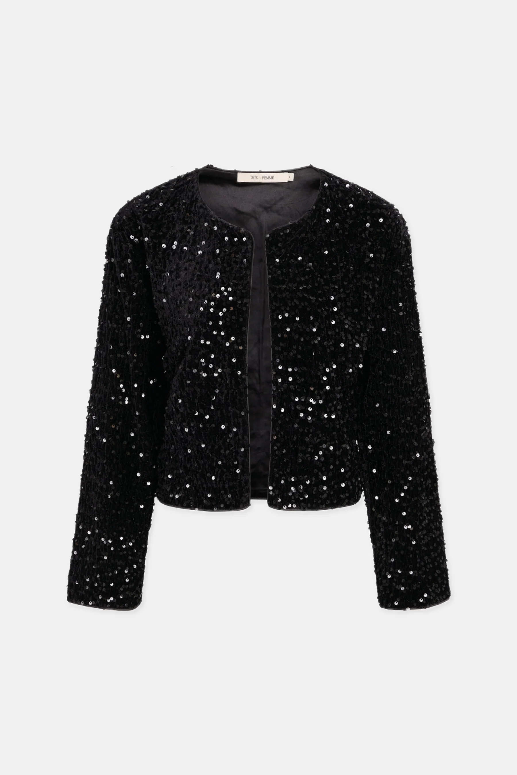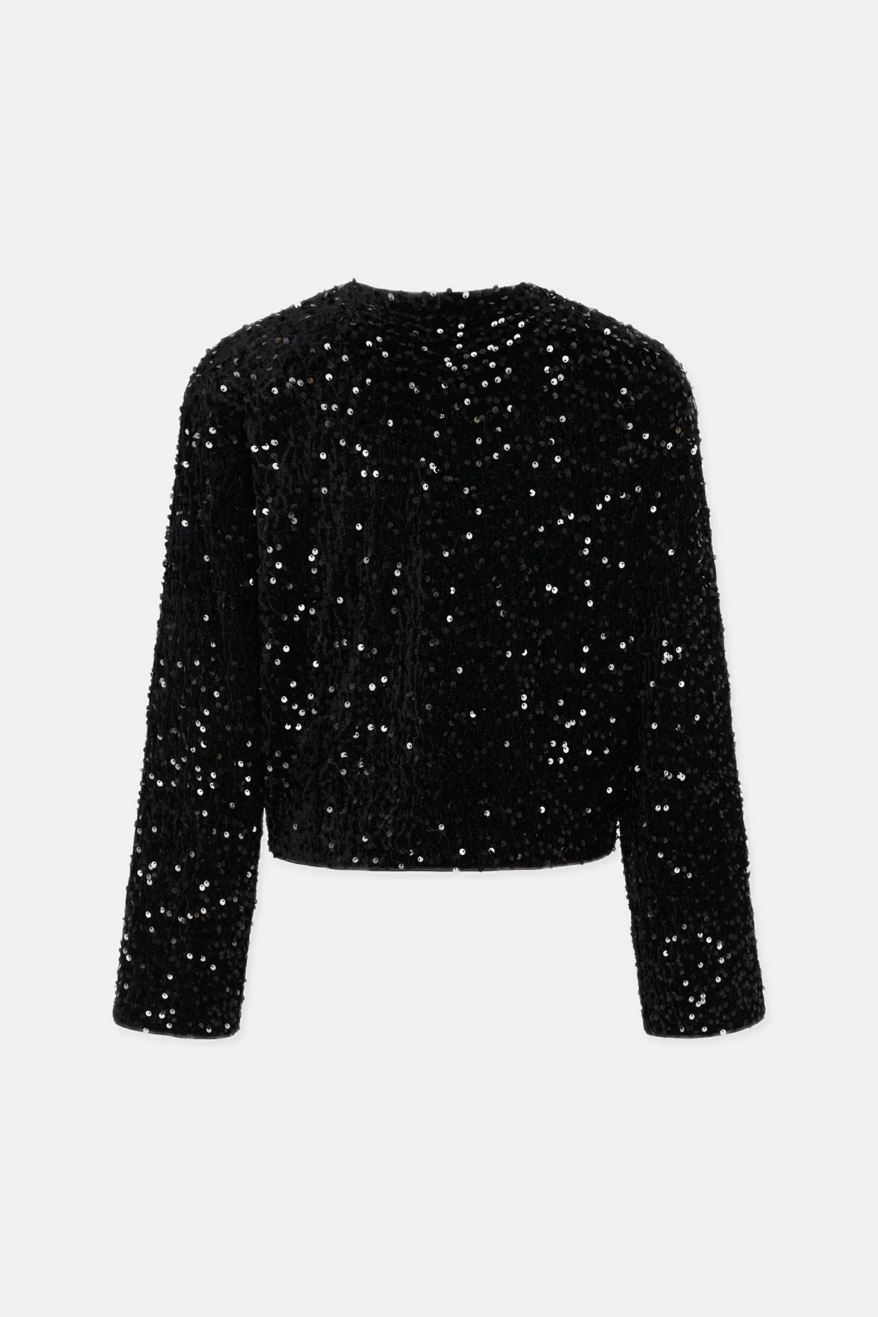 The Linaya jacket is perfect for adding a touch of glamour to your outfit. This short jacket is covered in sequins that sparkle in the light, making it ideal for festive occasions. With its O-neck and long sleeves, the jacket is simple yet elegant, and can be worn over both dresses and tops to complete a party look.