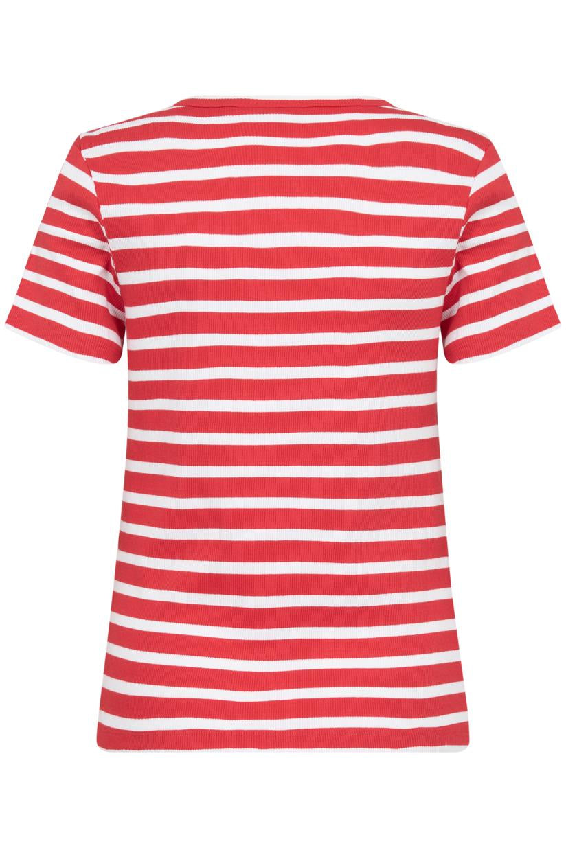 A short-sleeved, ribbed T-shirt with a classic red and white striped pattern. Features a round neckline and a fitted silhouette. Made from a soft, stretchy fabric for comfort.