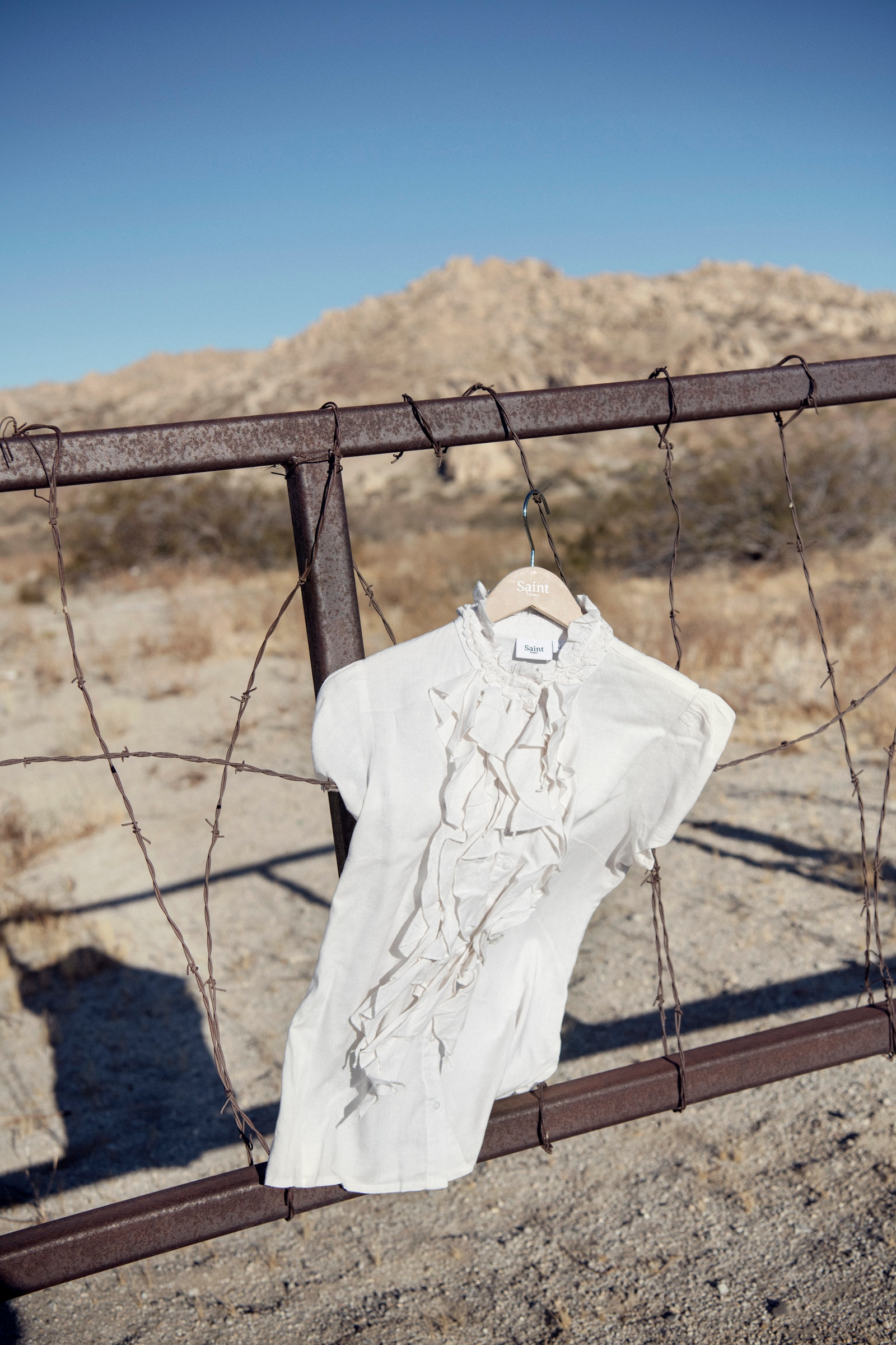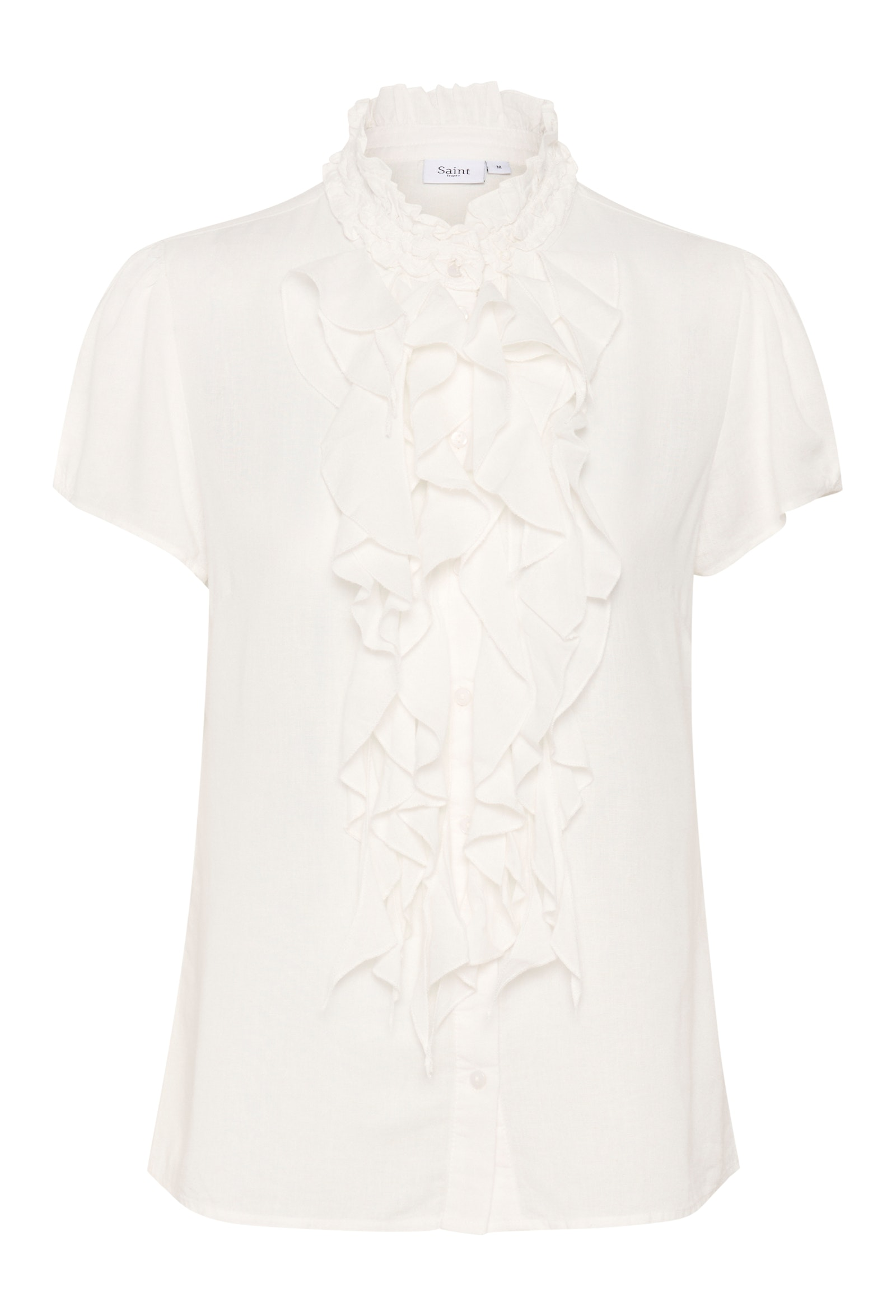 Short-sleeved blouse in a soft tone with a smooth, woven texture. Features a high ruffled collar and dramatic layered front ruffle detail. Tailored fit with a button-through front. 70% Viscose, 30% Linen
