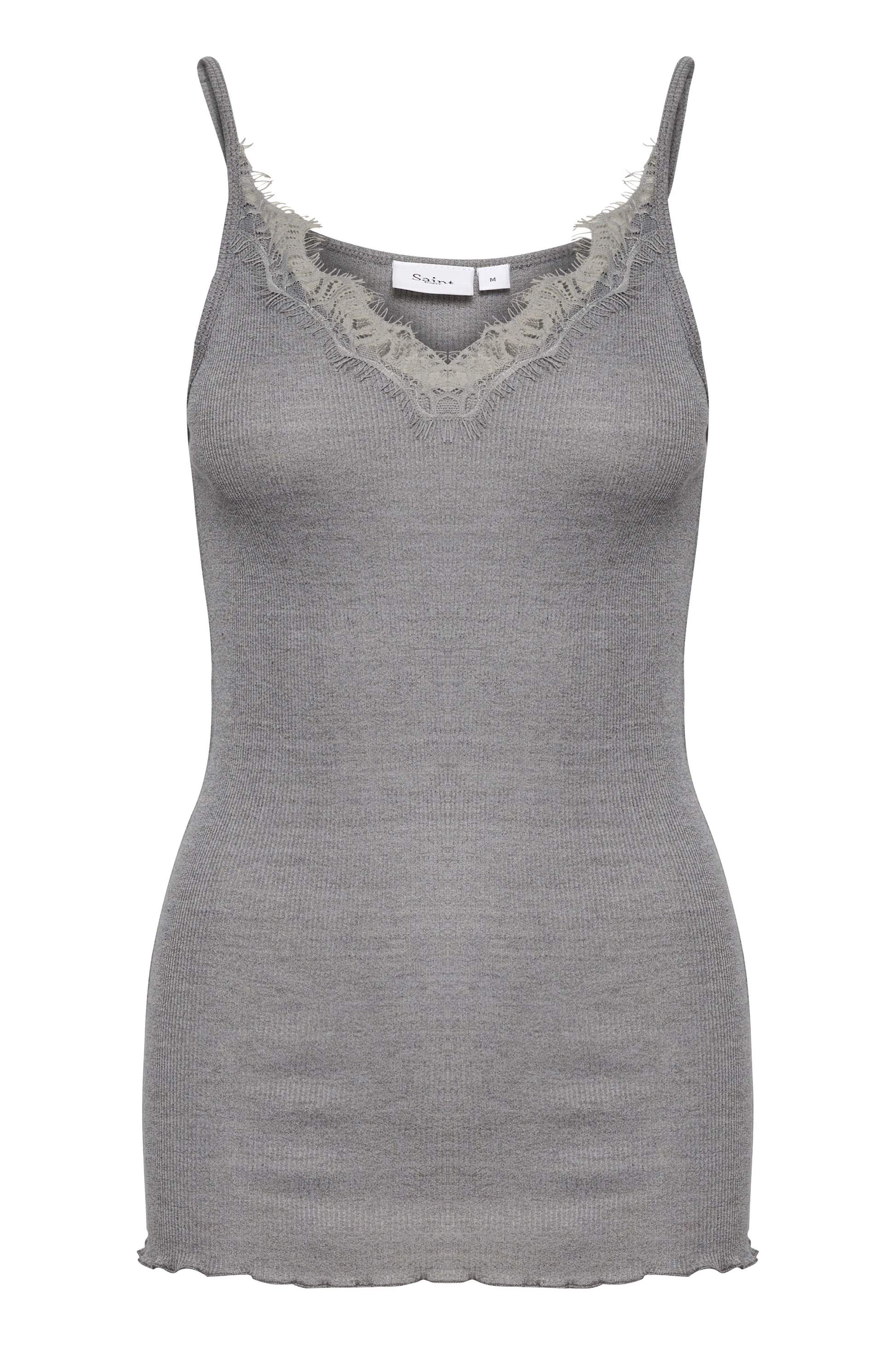 A fine ribbed woven singlet top in 70% cotton and 30% silk with V-neckline and lace at the front.