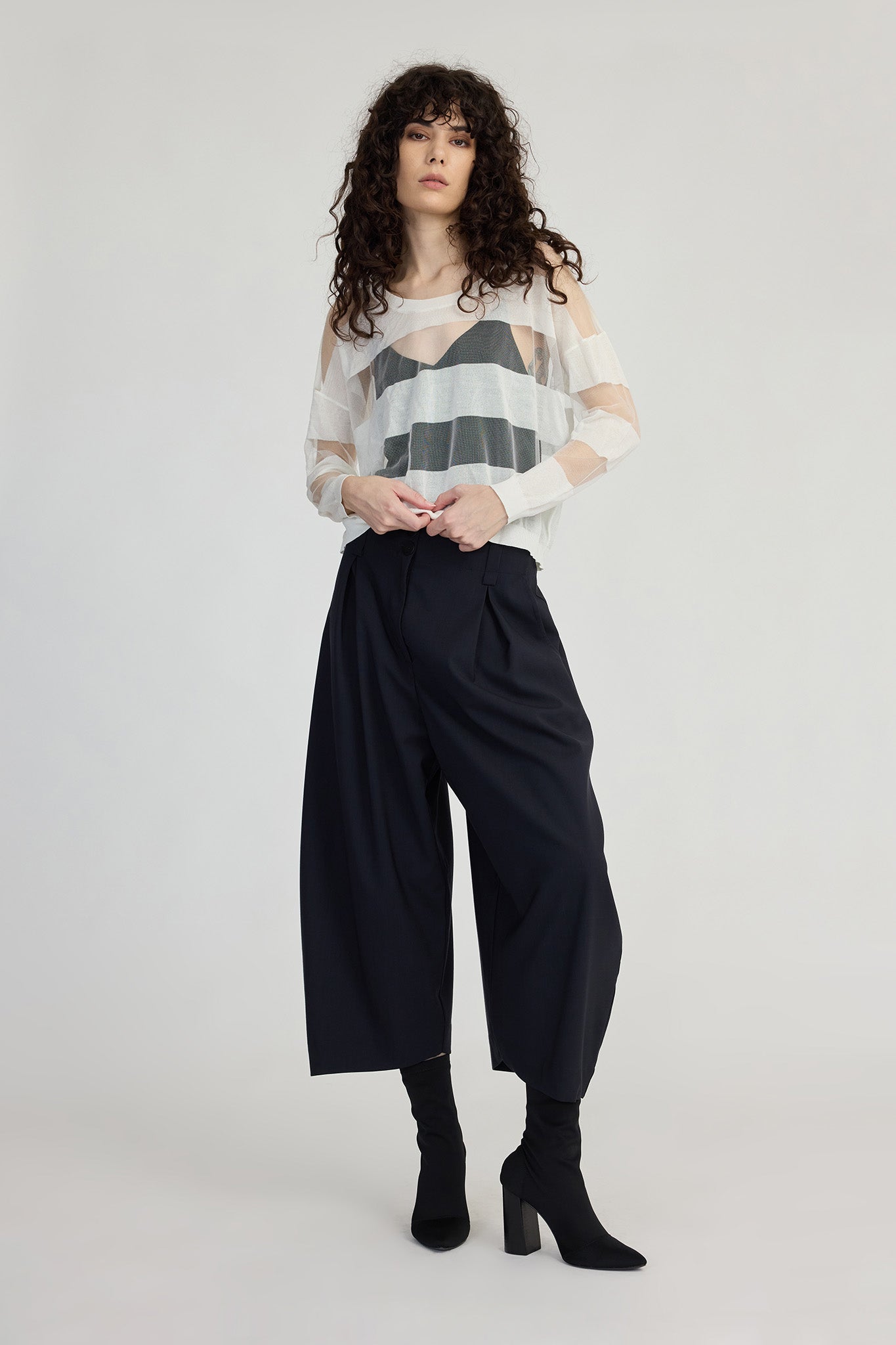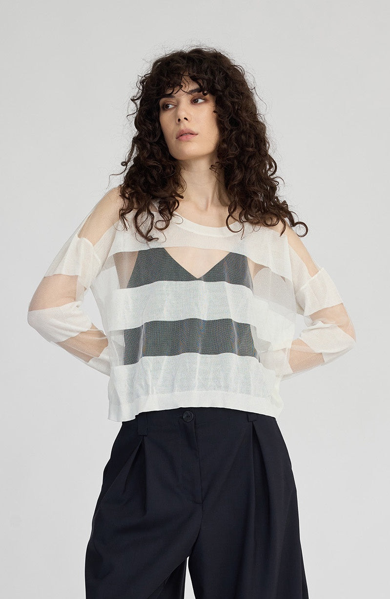 Delicate yet defined, the Banded Sweater is a sheer, lightweight knit designed to add dimension to your outfit. Striped with alternating panels of transparency, it reveals what’s beneath, whether tonal or contrasting, inviting personal expression through styling. Finished with a ribbed neckline, hem and cuffs, this piece balances softness with structure in all the right places.