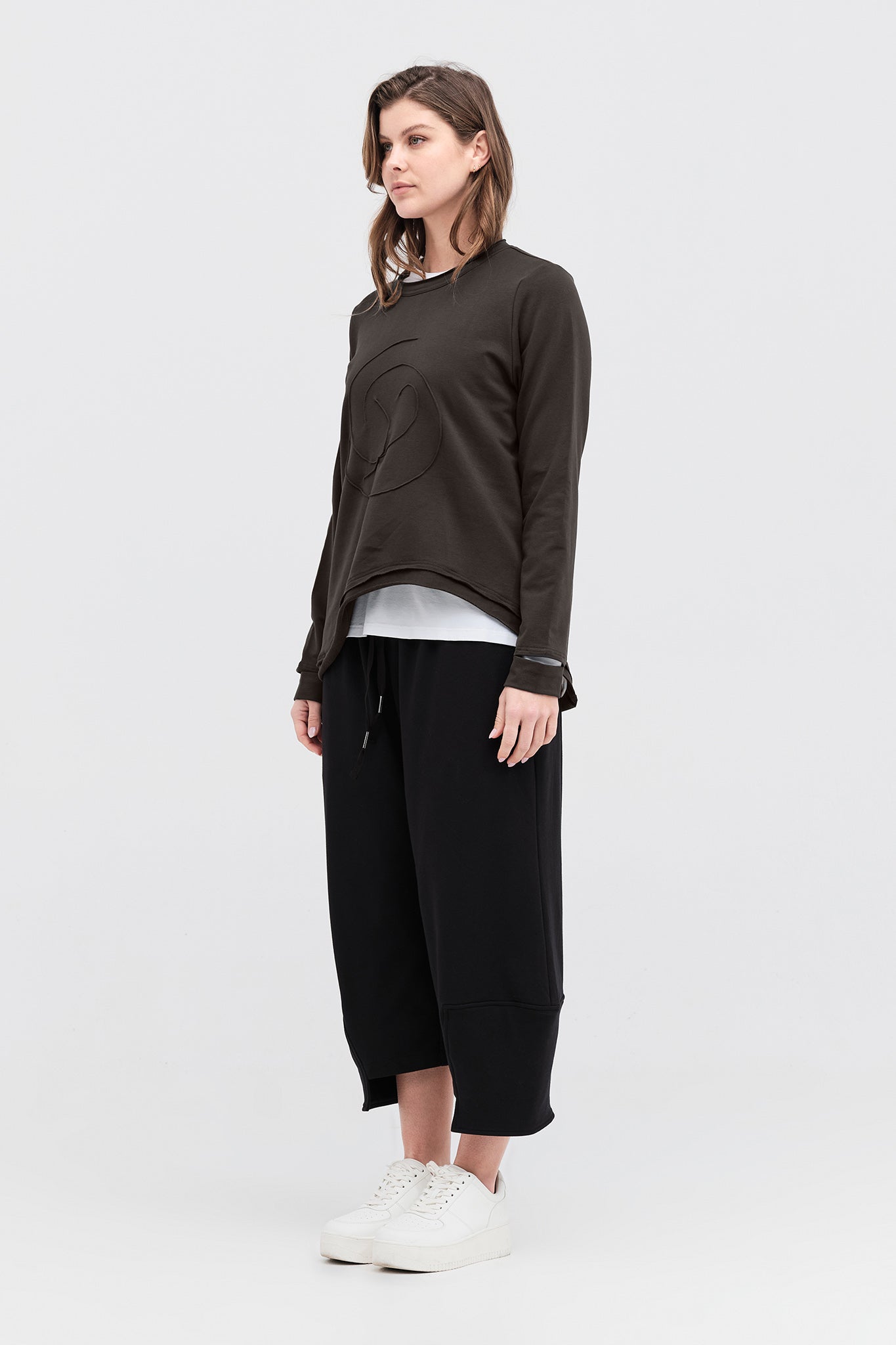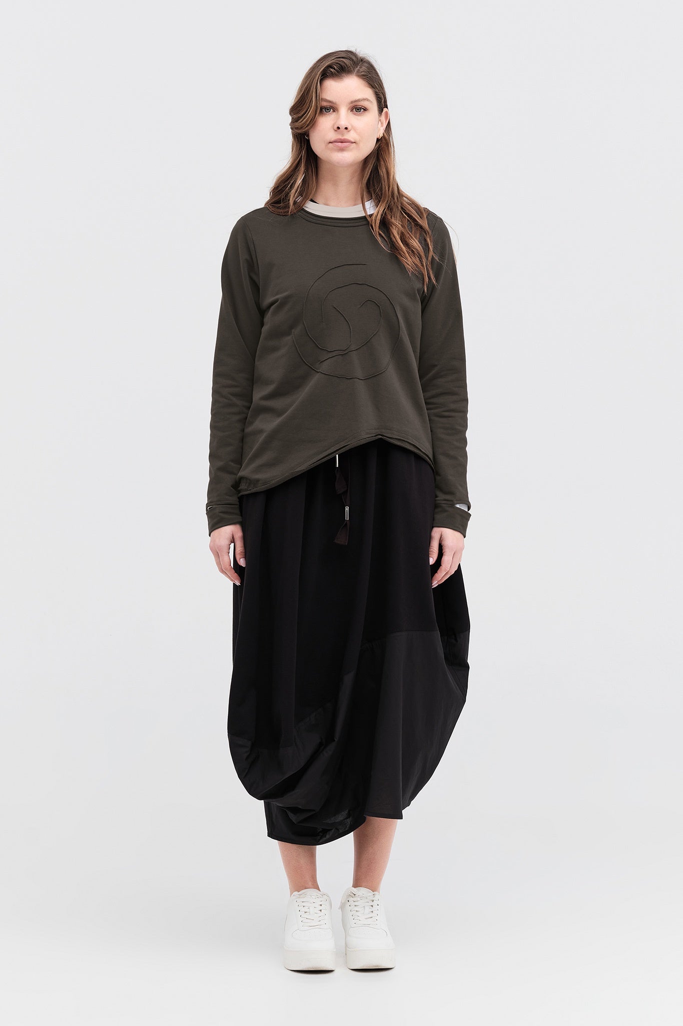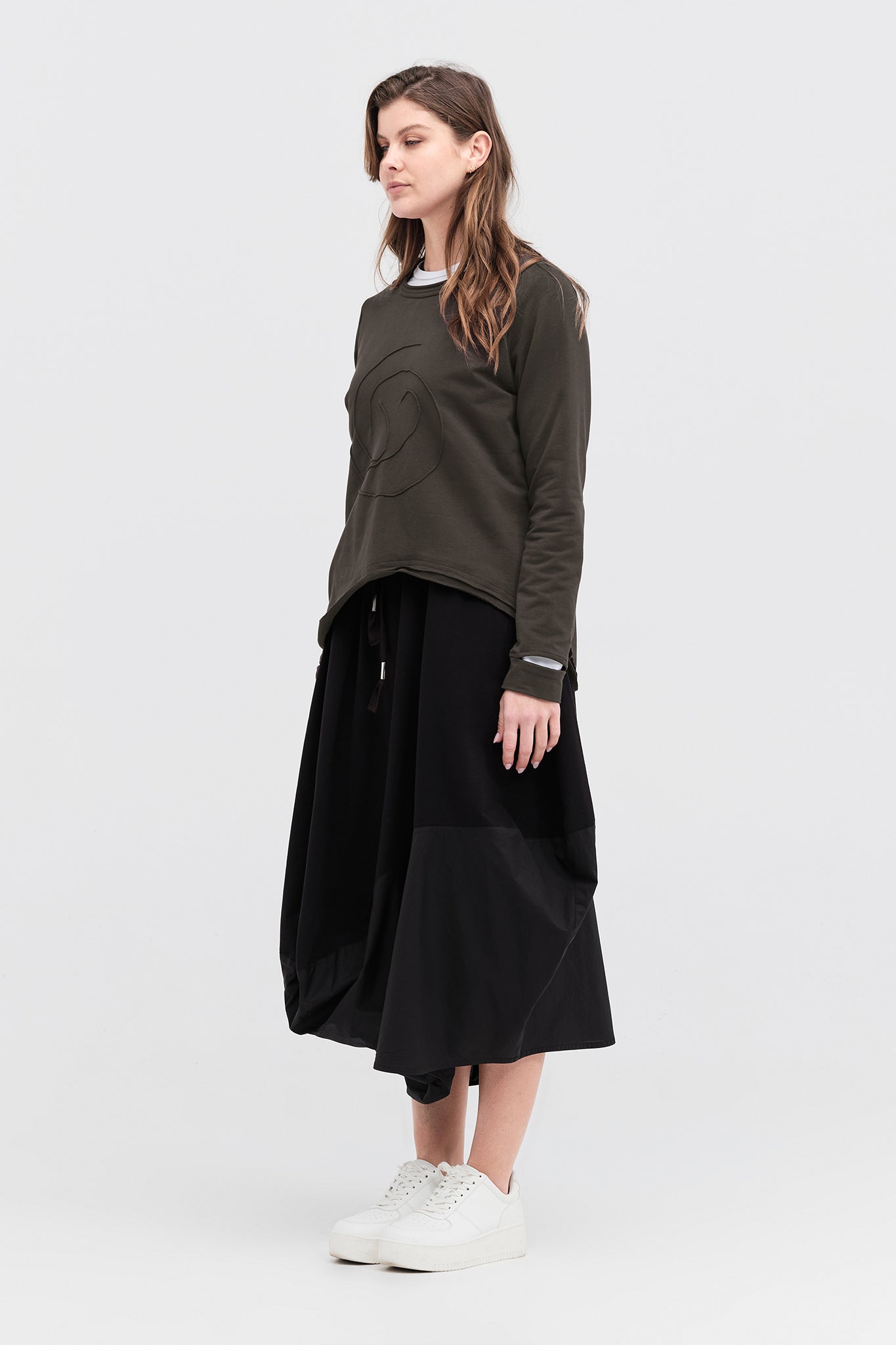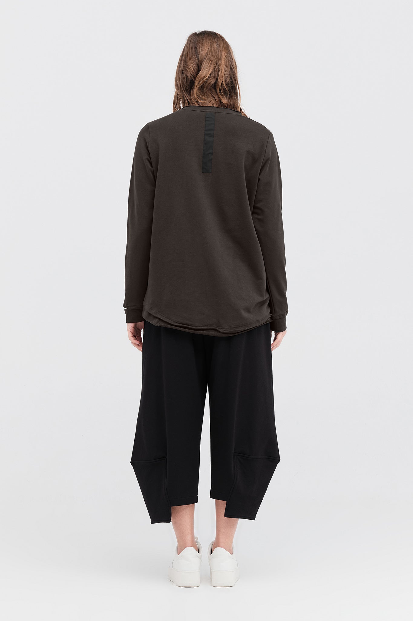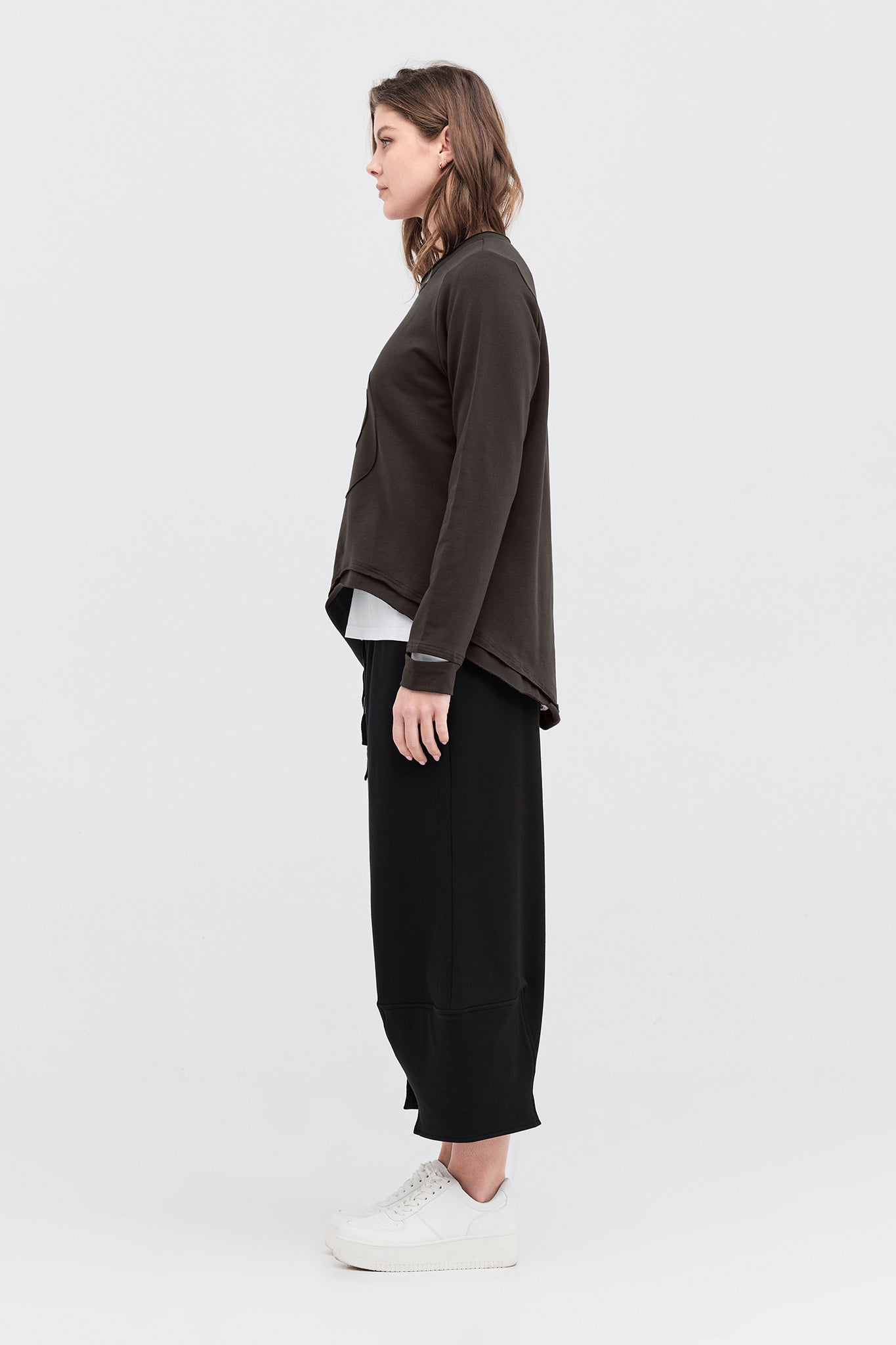 Comfort and thoughtful design are often hard to find in one garment, yet the Cartridge Sweat beautifully pairs the two. A simple neckline with slim line sleeves balances with the A-line silhouette. While the asymmetrical curved hemline creates soft, flattering lines. Pintuck detailing around the body and a split cuff detail adds an edge to this style.