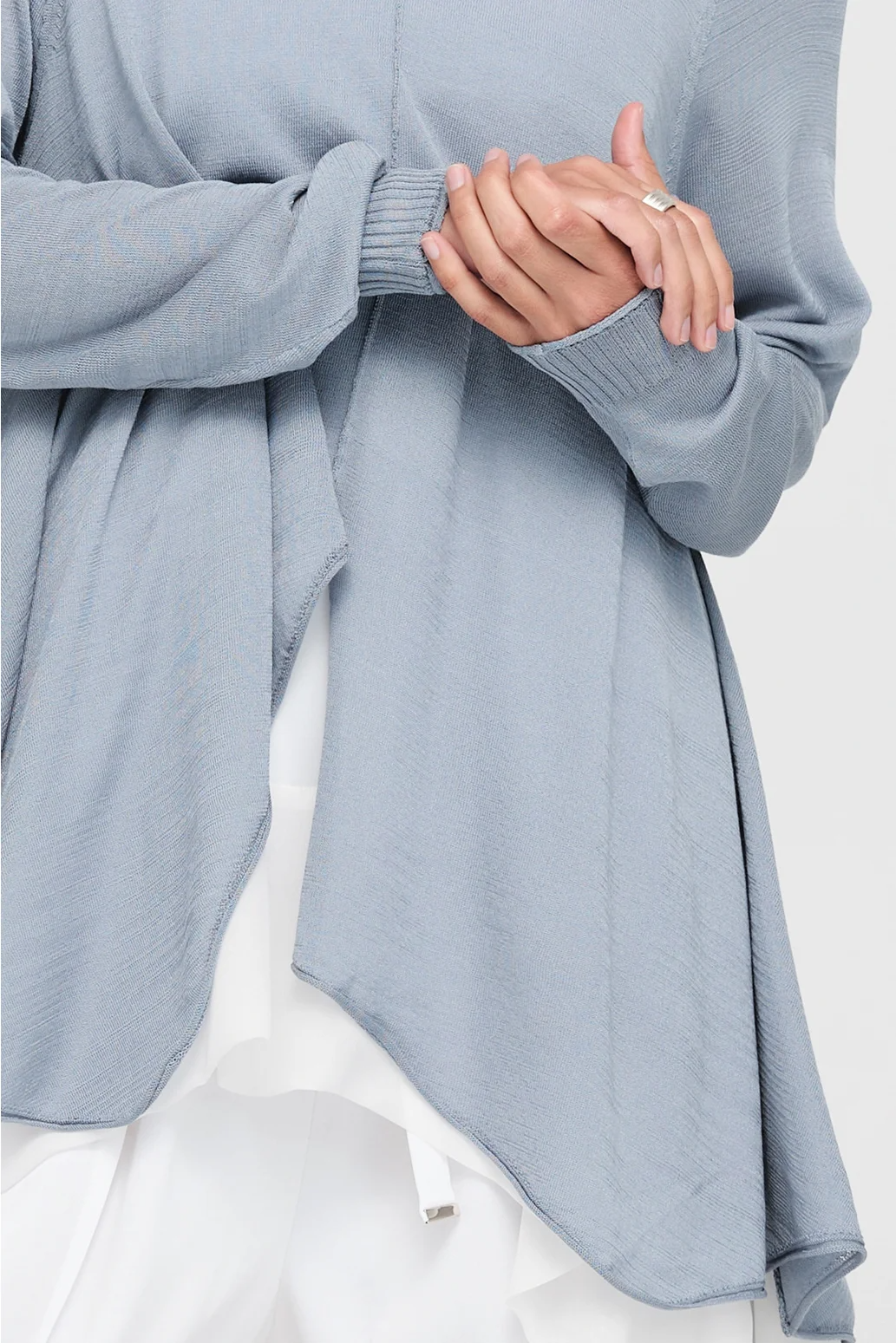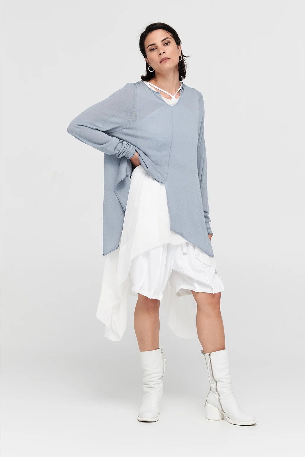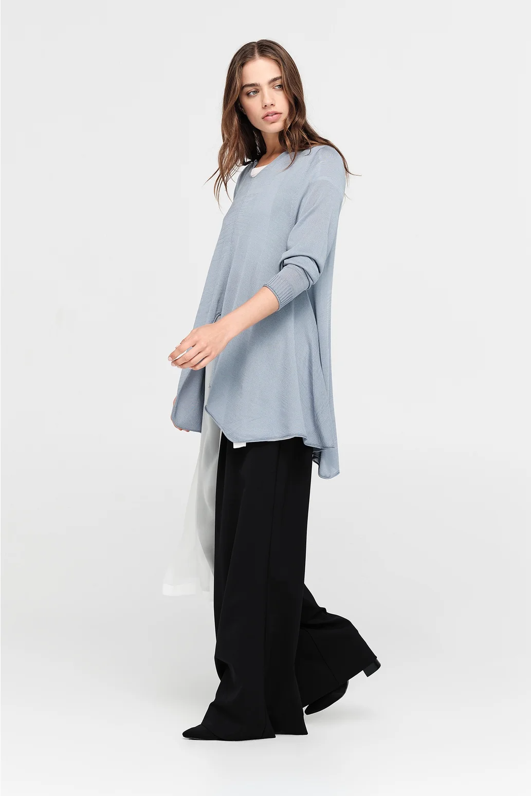 The Encased Sweater brings a sense of ease with its fluid form and refined details. Featuring an asymmetric hemline and a softly shaped V-neck, this piece is finished with natural rolling at the neckline and cuffs. A lightweight layer to carry you through the seasons, it’s ideal for pairing with relaxed tailoring or layered over longer lines for textural play.