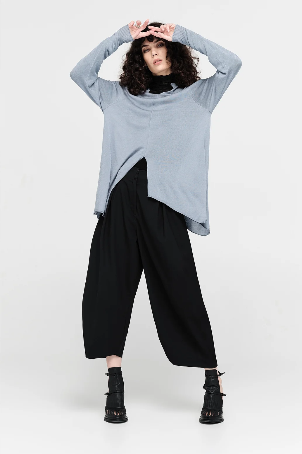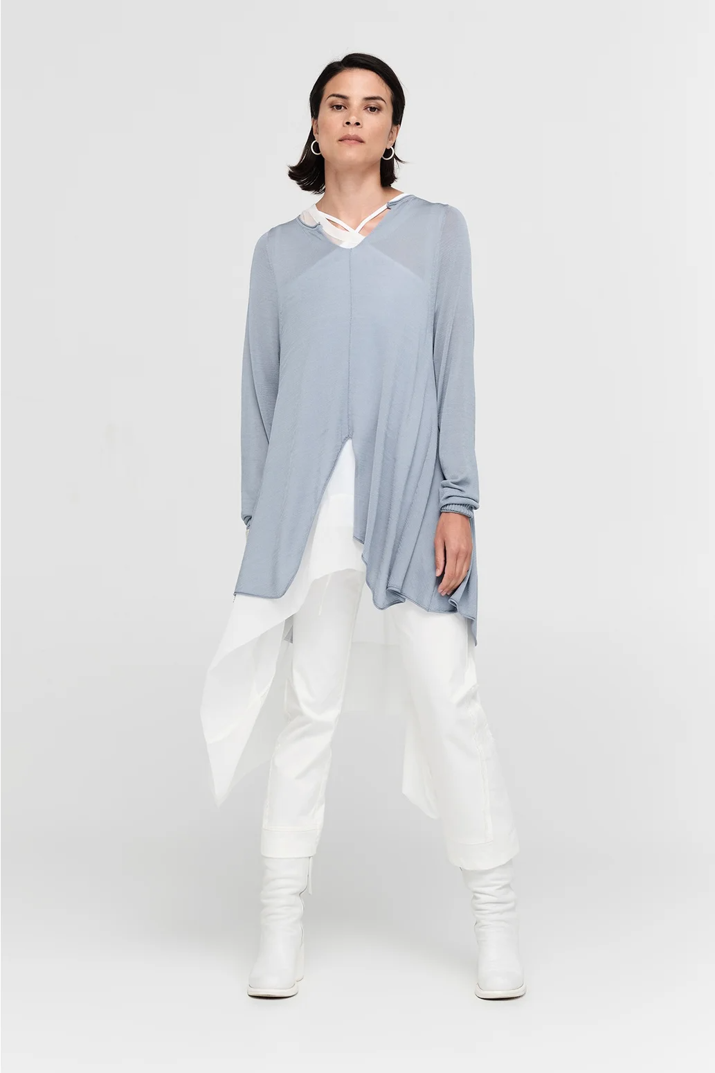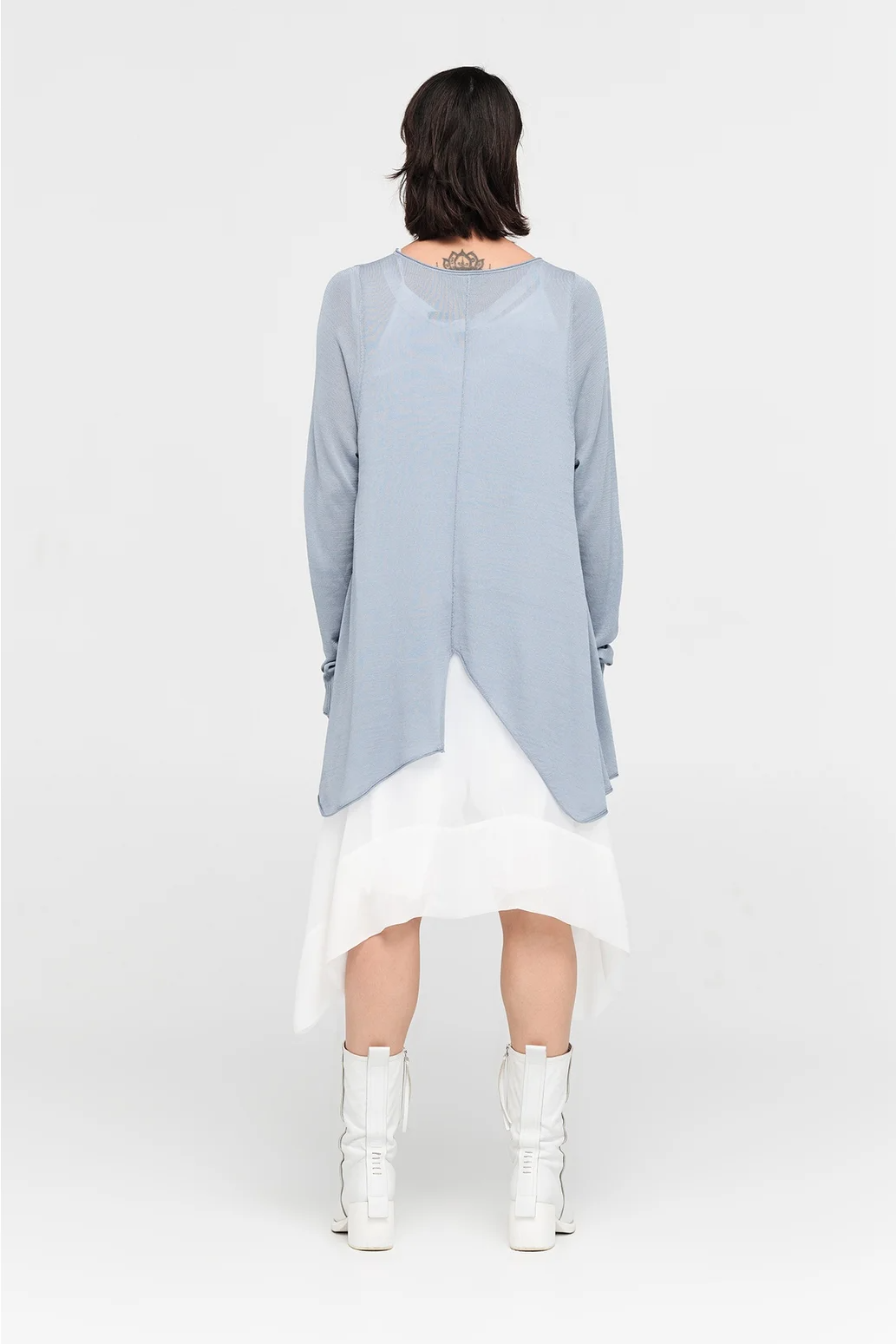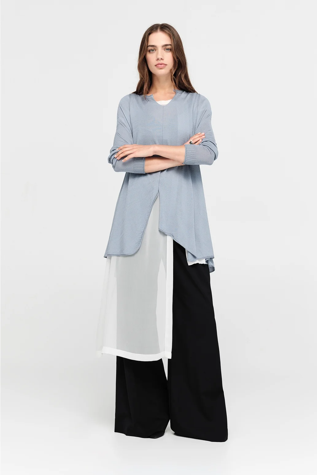 The Encased Sweater brings a sense of ease with its fluid form and refined details. Featuring an asymmetric hemline and a softly shaped V-neck, this piece is finished with natural rolling at the neckline and cuffs. A lightweight layer to carry you through the seasons, it’s ideal for pairing with relaxed tailoring or layered over longer lines for textural play.