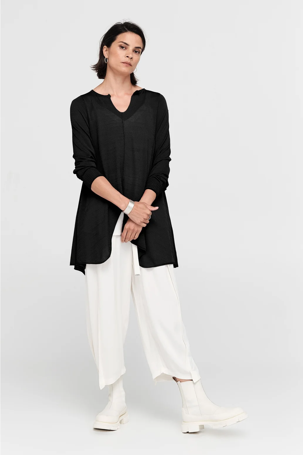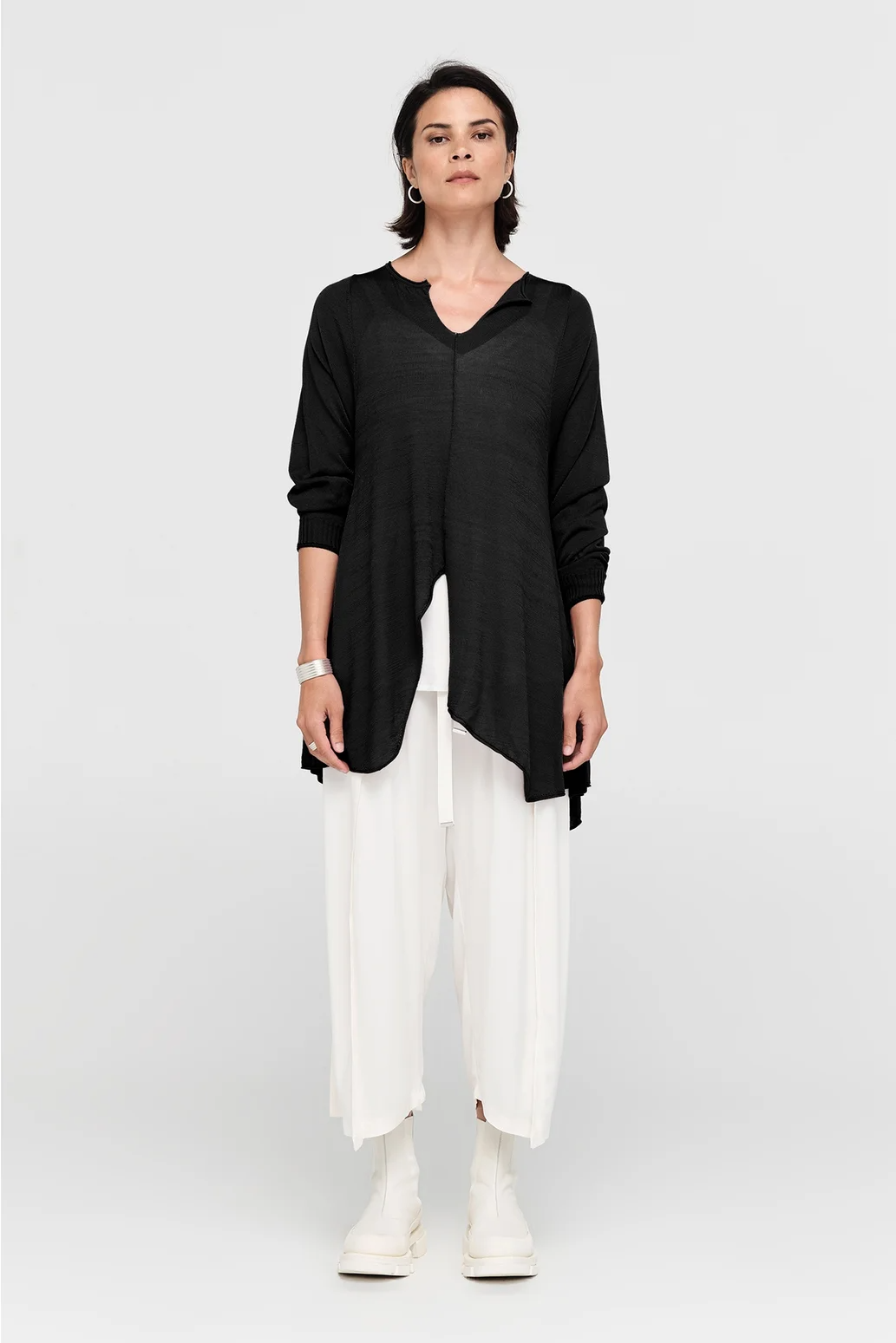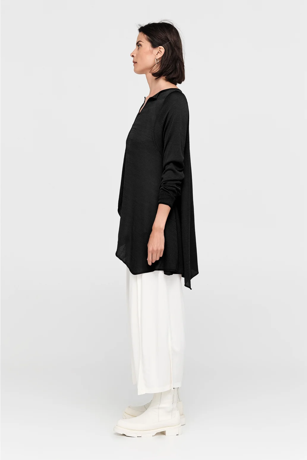 The Encased Sweater brings a sense of ease with its fluid form and refined details. Featuring an asymmetric hemline and a softly shaped V-neck, this piece is finished with natural rolling at the neckline and cuffs. A lightweight layer to carry you through the seasons, it’s ideal for pairing with relaxed tailoring or layered over longer lines for textural play.