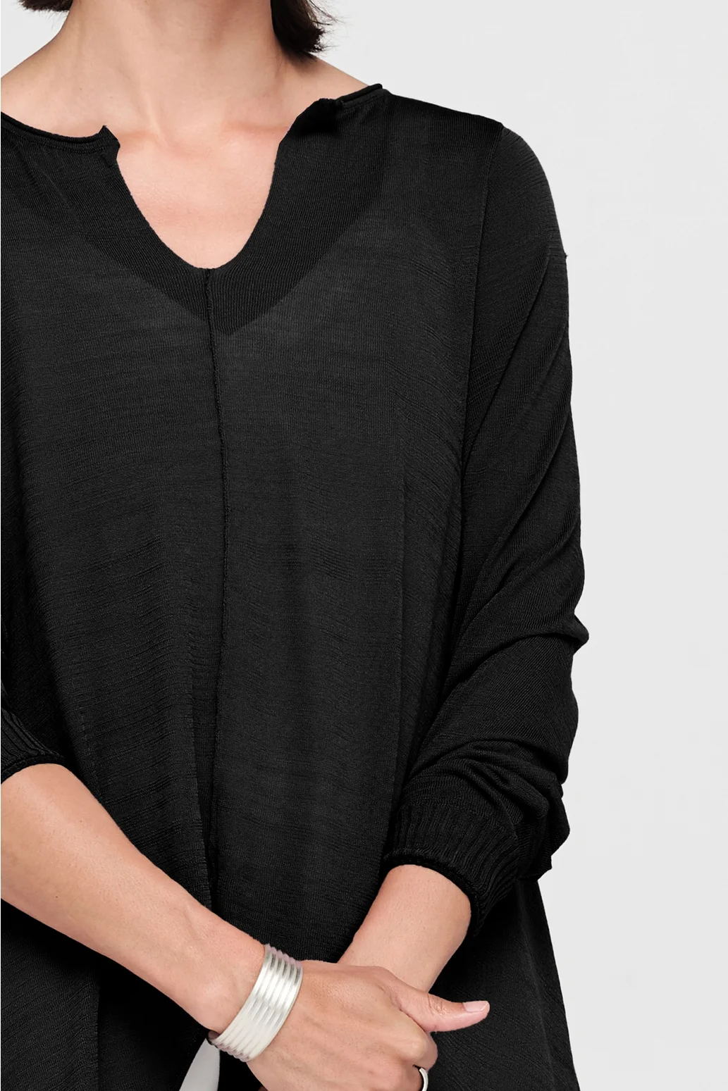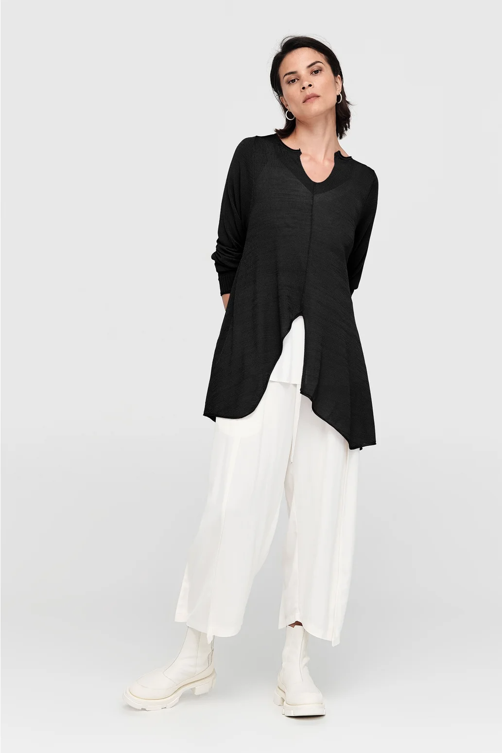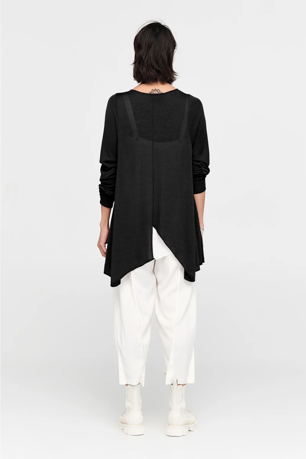 The Encased Sweater brings a sense of ease with its fluid form and refined details. Featuring an asymmetric hemline and a softly shaped V-neck, this piece is finished with natural rolling at the neckline and cuffs. A lightweight layer to carry you through the seasons, it’s ideal for pairing with relaxed tailoring or layered over longer lines for textural play.
